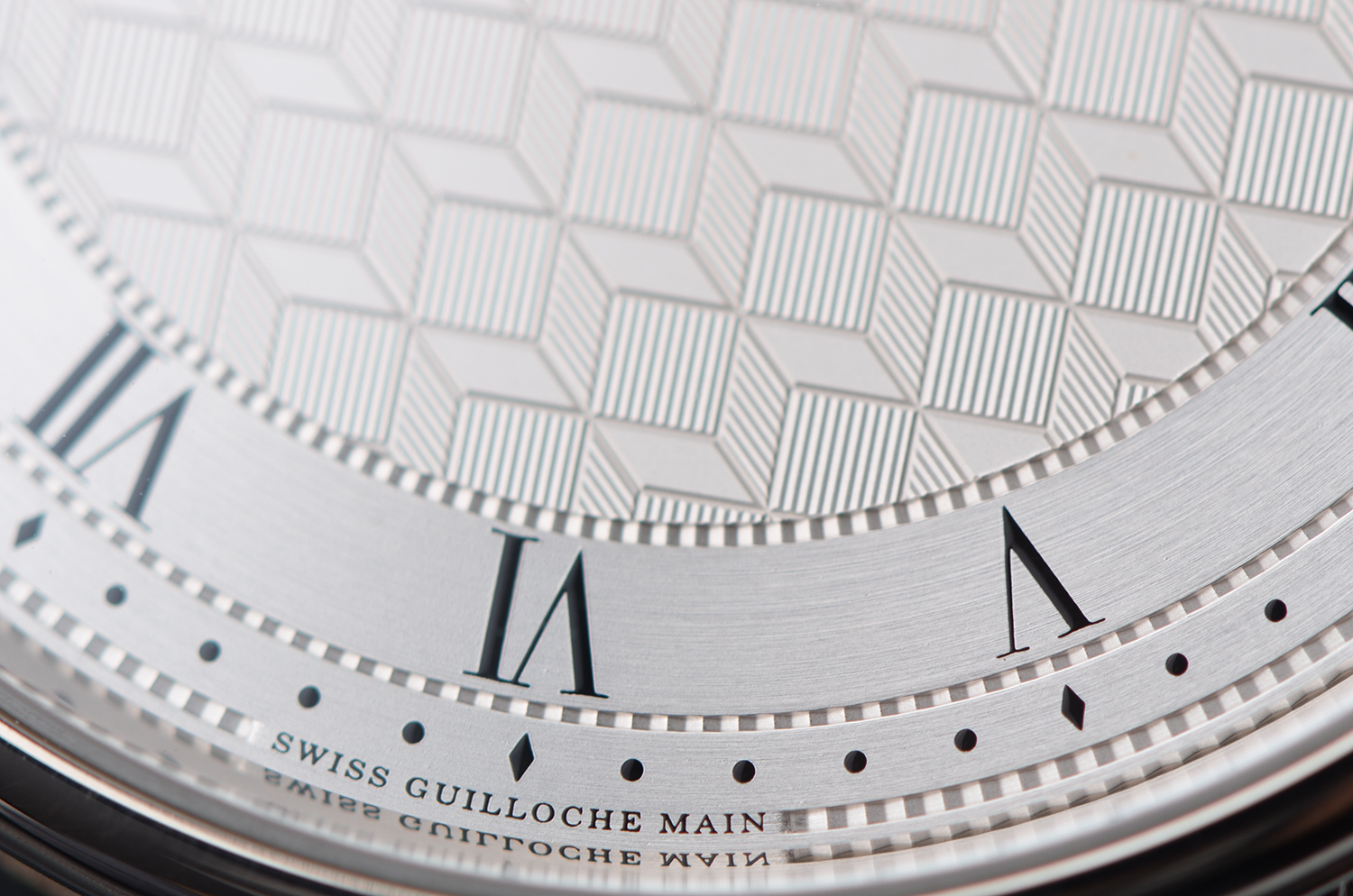表盘: 立体白金镀银镌刻表盘,罗马数字刻度,蓝钢鱼眼针