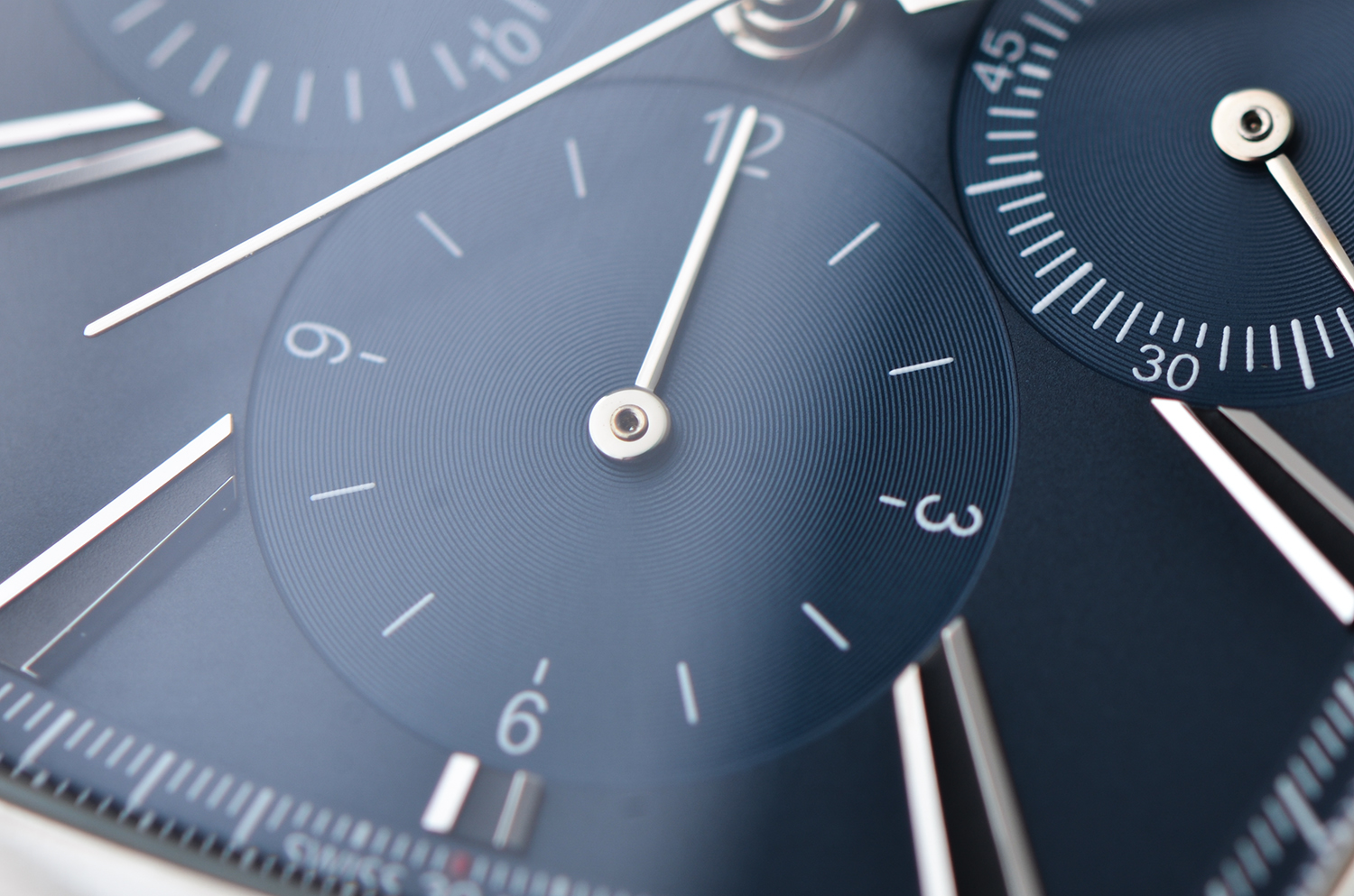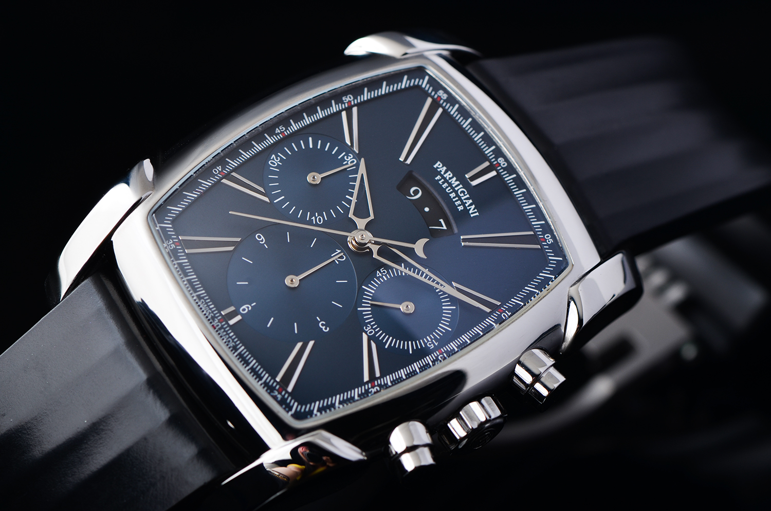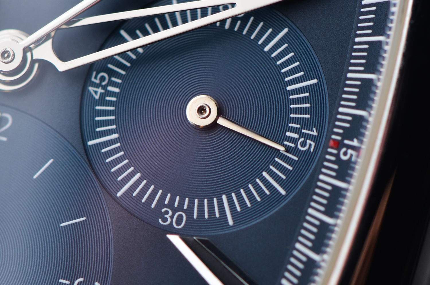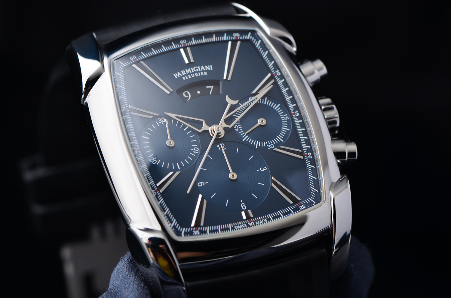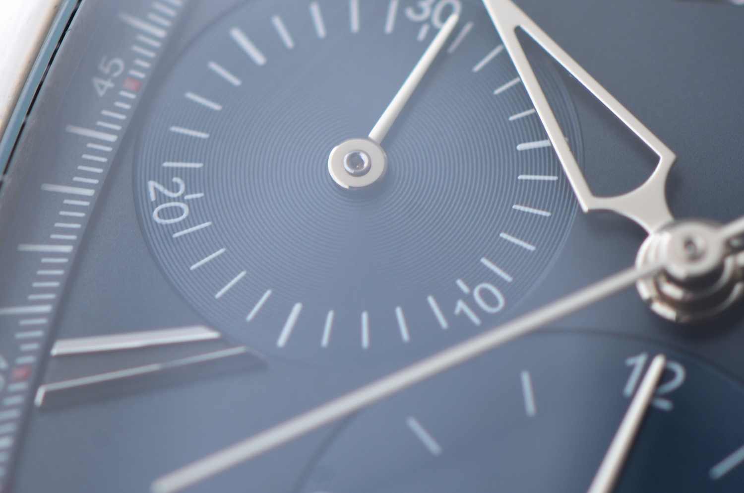 腕表采用独特的 枕形不锈钢表壳,线条流畅,弧度贴合手腕,佩戴舒适而极具辨识度。蓝色表盘与镂空三角指针相互辉映,辅以计时子盘与日期显示,运动与雅致并存。
