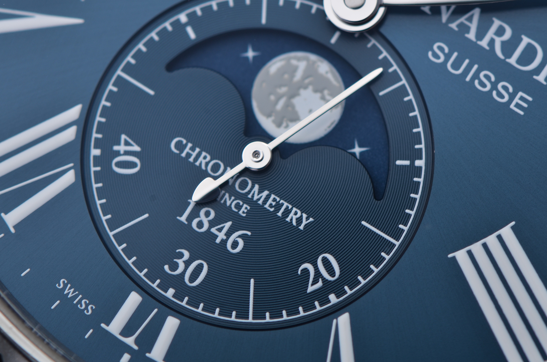 表盘:立体蓝色表盘,罗马数字刻度,桃心指针,动能储备显示,月相显示