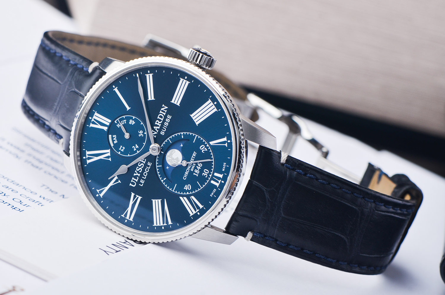 这是一枚为纪念雅典表 175 周年特别推出的限量表款,设计灵感源于19世纪航海精密计时器。蓝色太阳纹表盘上,6点位月相视窗静谧优雅,如夜海之月倒映波心;12点位动力储存指示如指南针般,彰显航海精神。