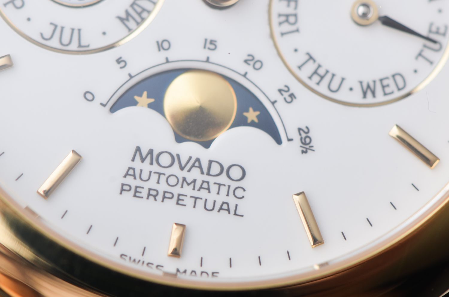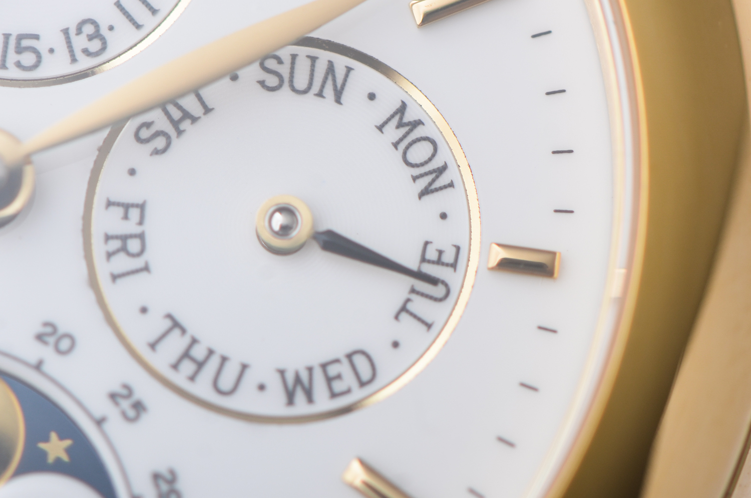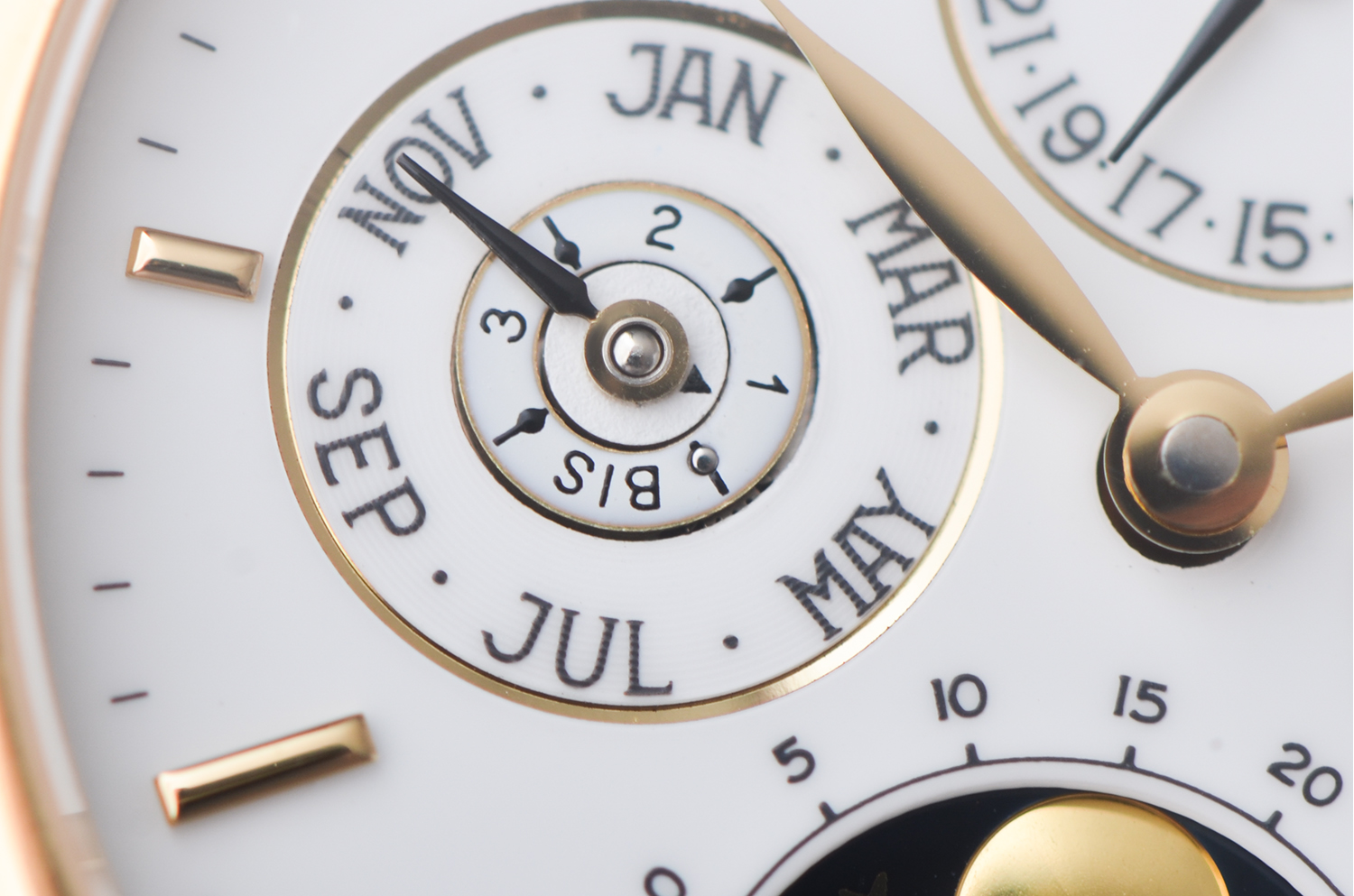 表盘:立体白色万年历月相表盘,黄金时标及时分针