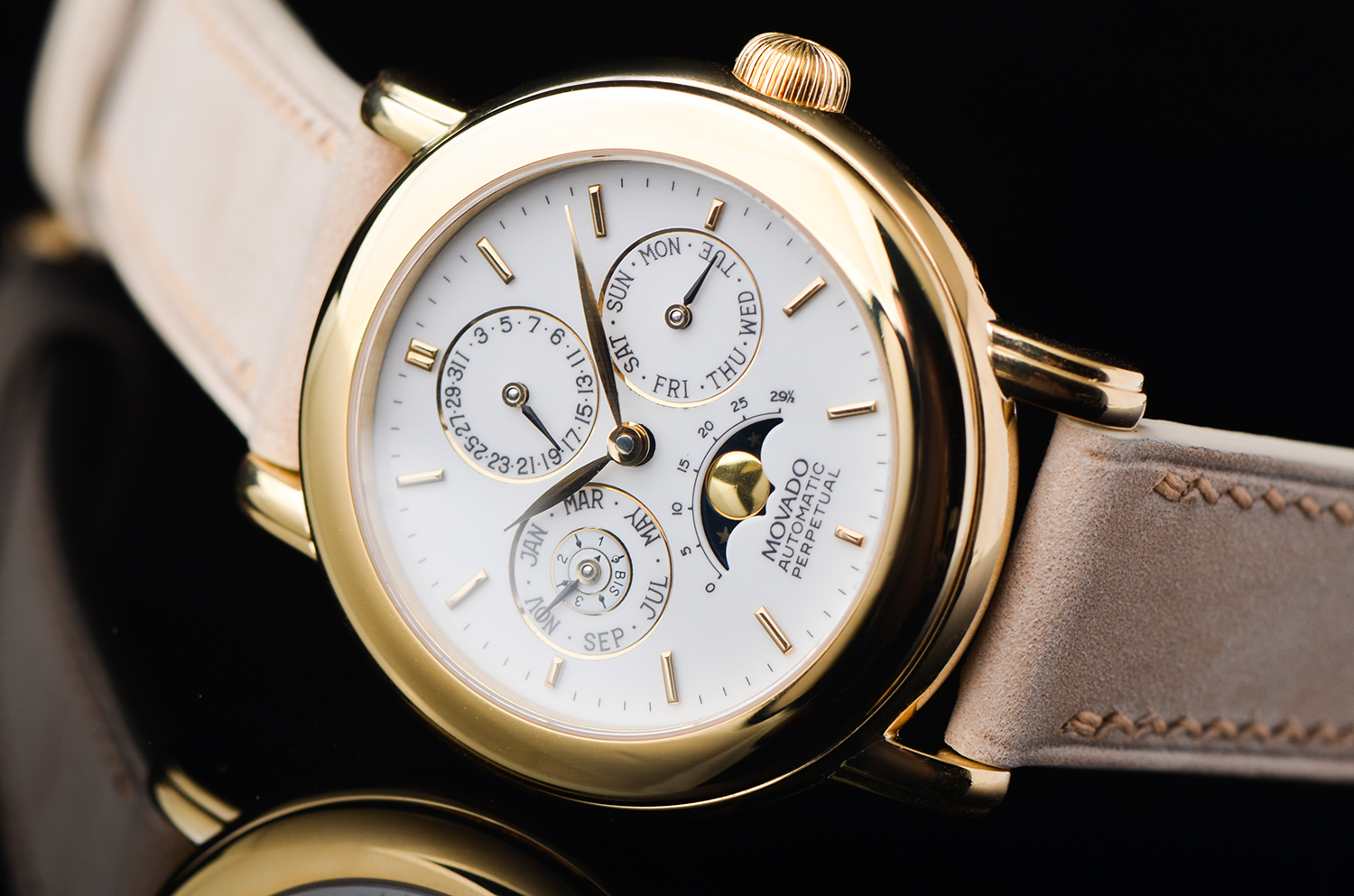 整枚腕表采用 18K黄金表壳,直径约36毫米,比例端庄典雅。白色表盘布局匀称,四枚小表盘分别显示星期、日期、月份与月相,并具备万年历功能——可自动识别闰年与大小月,直到2100年无需人工校正。温润的金色指针与立体时标,在光线下散发出古典韵味。