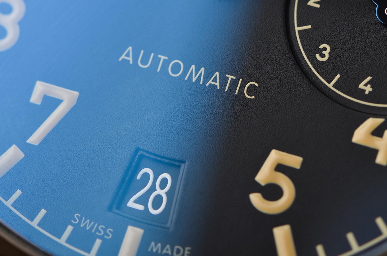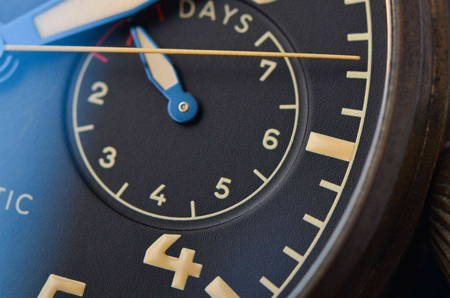 表壳采用青铜材质,随着岁月流转会自然形成独特铜绿,令每一枚腕表都呈现出专属的个性与时间痕迹。46毫米的表壳尺寸,气场十足,展现出大飞行员系列一贯的力量与阳刚之美。