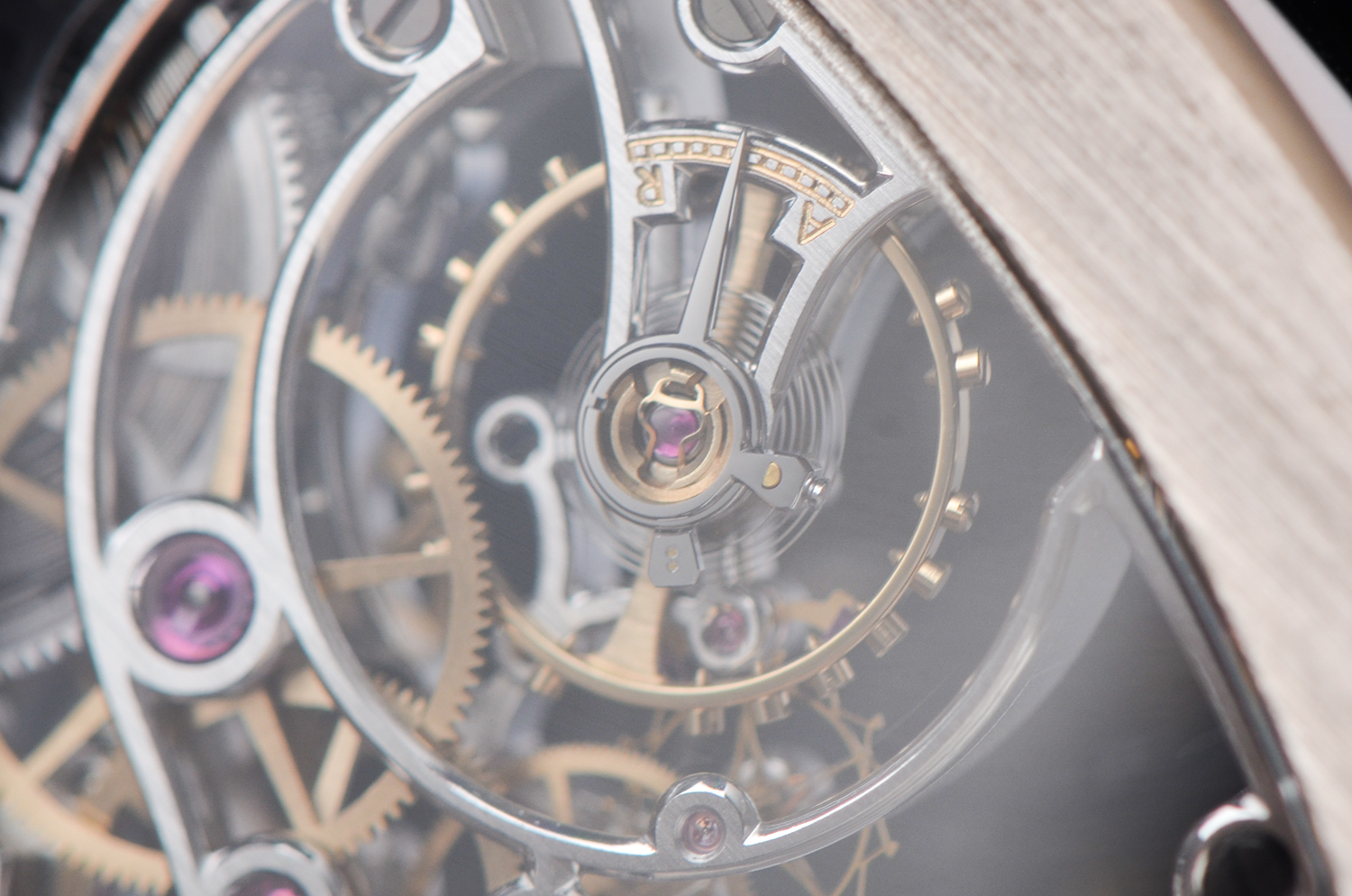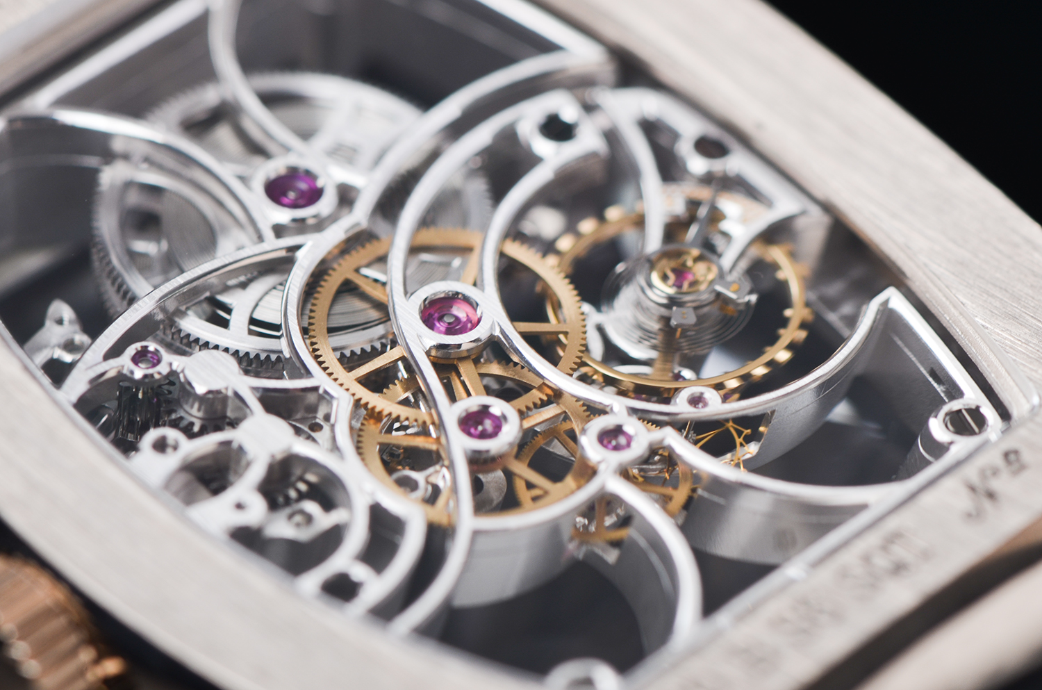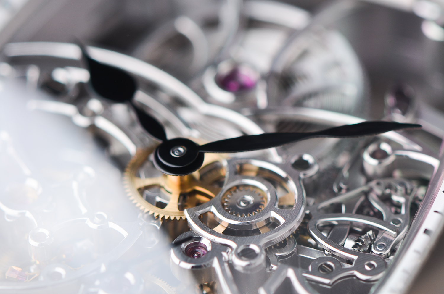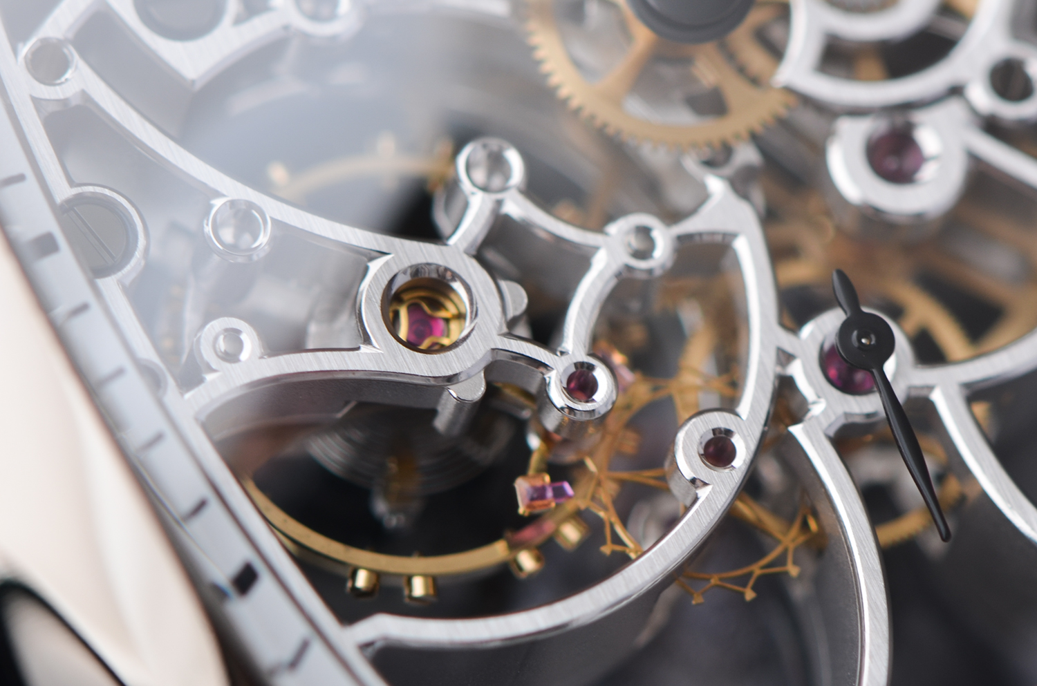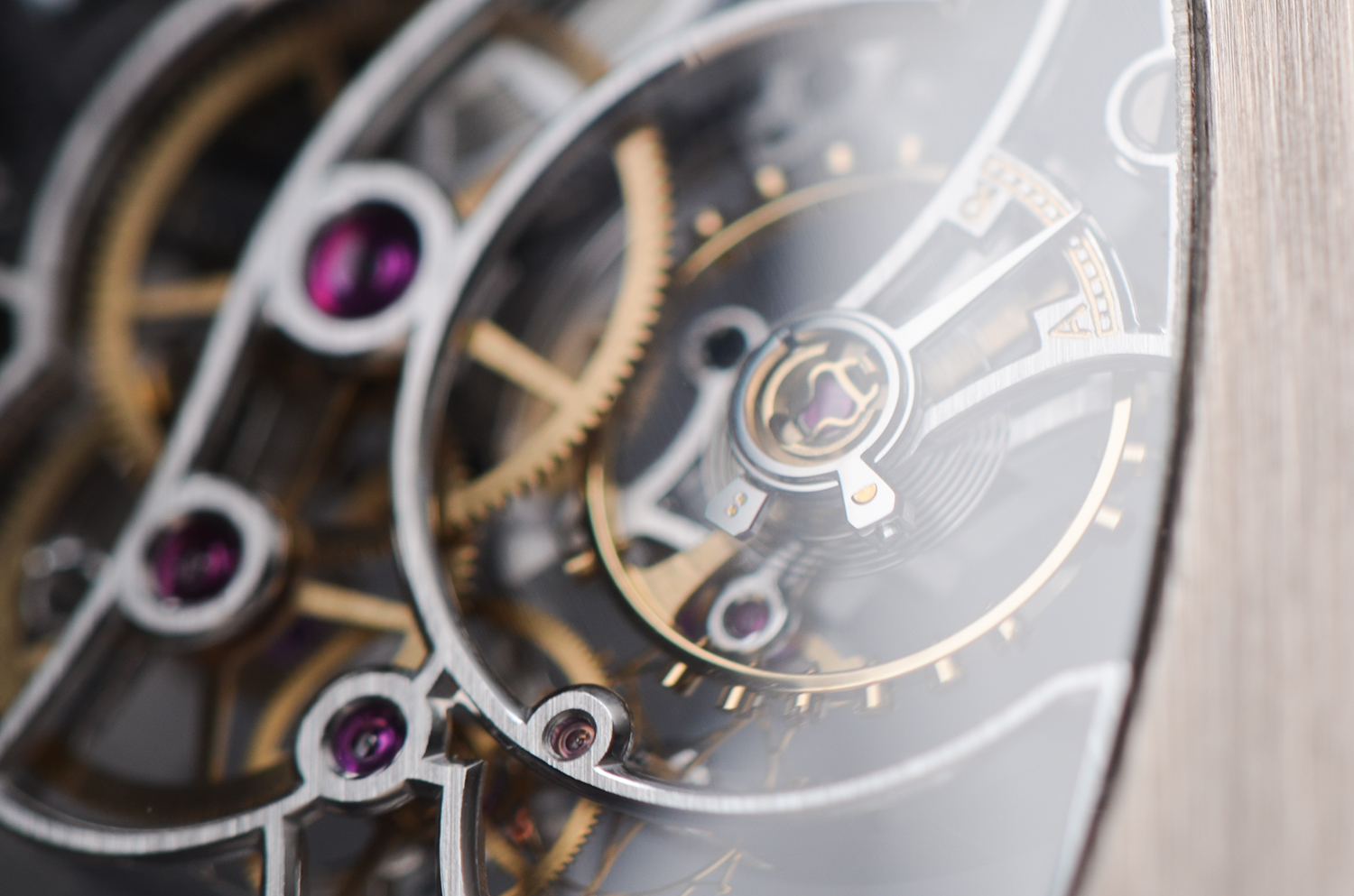 表壳采用 18K白金精制而成,优雅弧线贴合腕间曲度;通体经精细抛光,映照出柔和的金属光泽。透过蓝宝石水晶镜面,映入眼帘的是一幅 全镂空 Skeleton 机芯 —— 桥板、齿轮与擒纵系统在光影下交织起机械的舞蹈。每一根线条都经过手工雕刻与倒角打磨,令复杂的机械构造宛若悬浮于透明空间中。