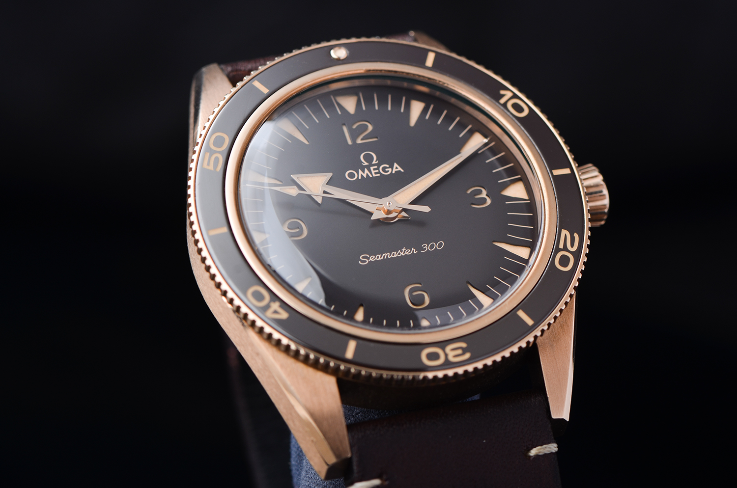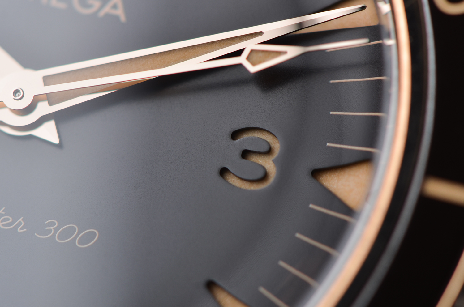 深棕色夹层表盘(sandwich dial) 搭配米黄色 Super-LumiNova 夜光时标,复古而优雅; Broad Arrow 指针,传承自 1957 年原版 Seamaster 300,致敬经典潜水传奇。