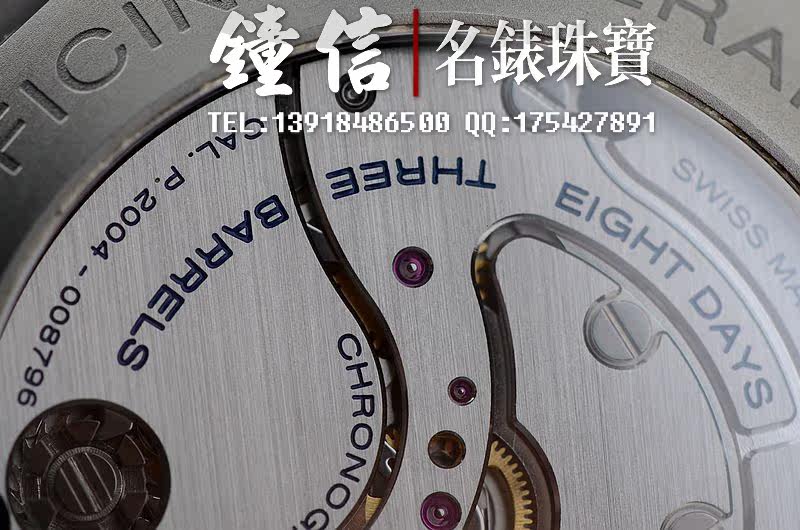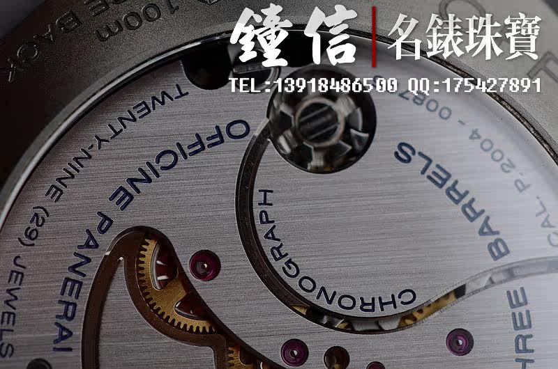 沛纳海自产的CAL.P.2004型机芯,手上链,由321个零件组成,导柱轮计时结构,3个发条盒,极其精致日内瓦条纹打磨,倒角抛光修饰,29钻,摆频28800,动力储存约192小时,八天链。走时状态极佳。