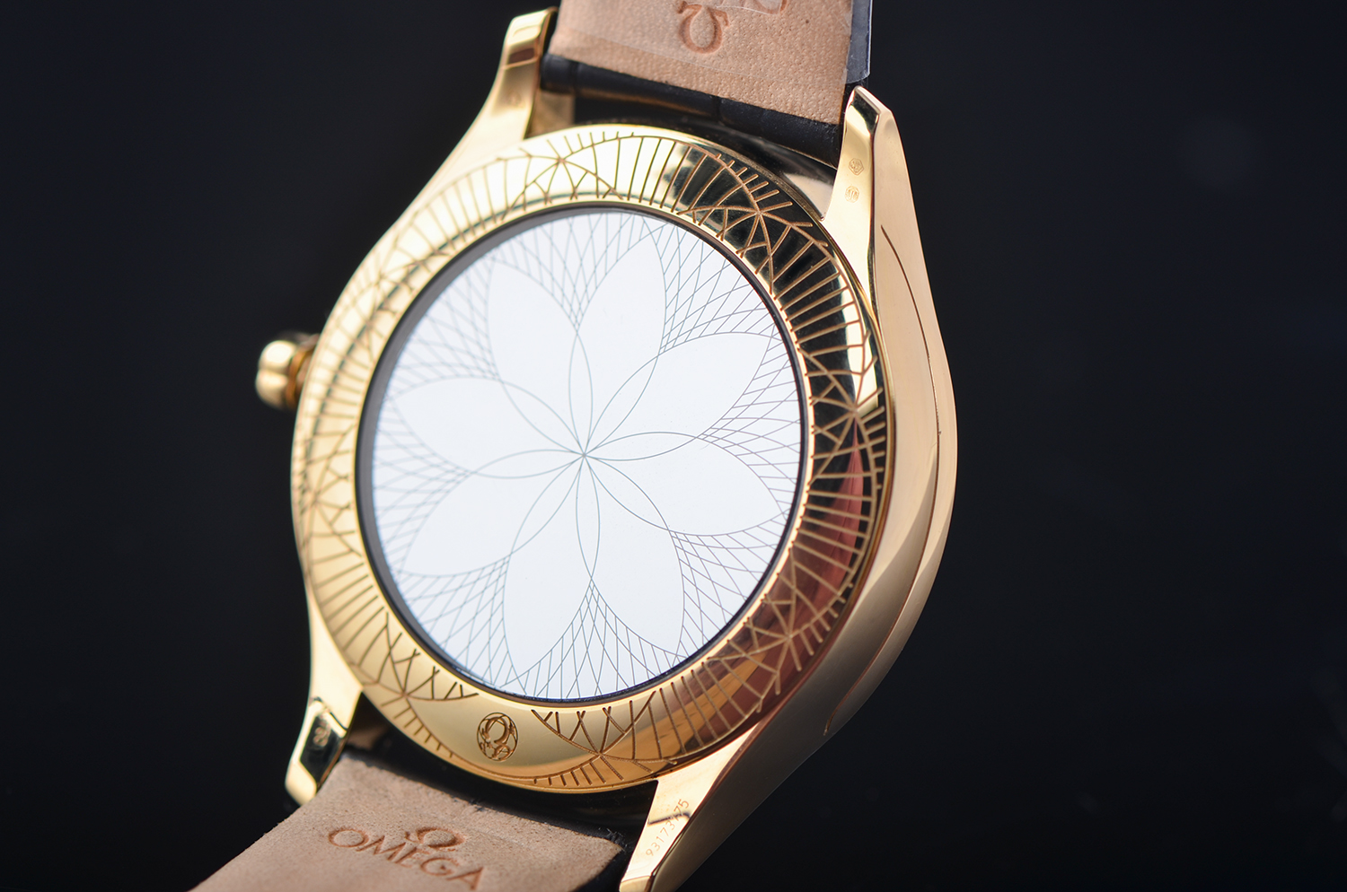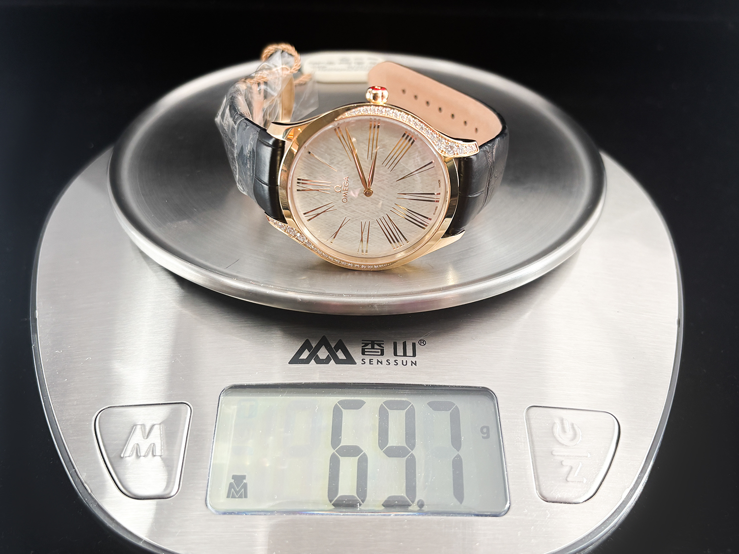 表壳采用欧米茄独家 Moonshine™ 18K金,比传统黄金更淡雅柔和,光泽更持久不易褪色。