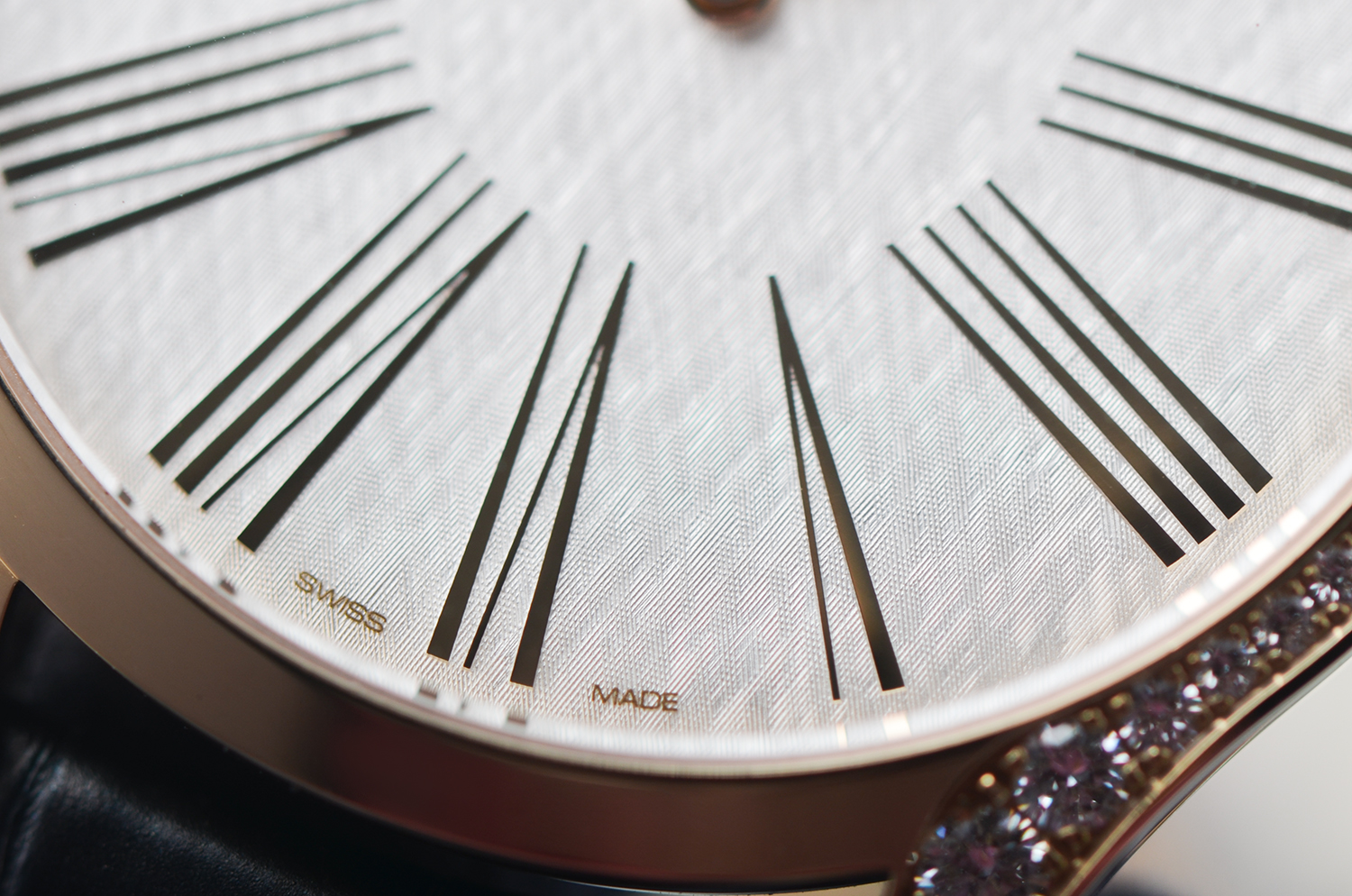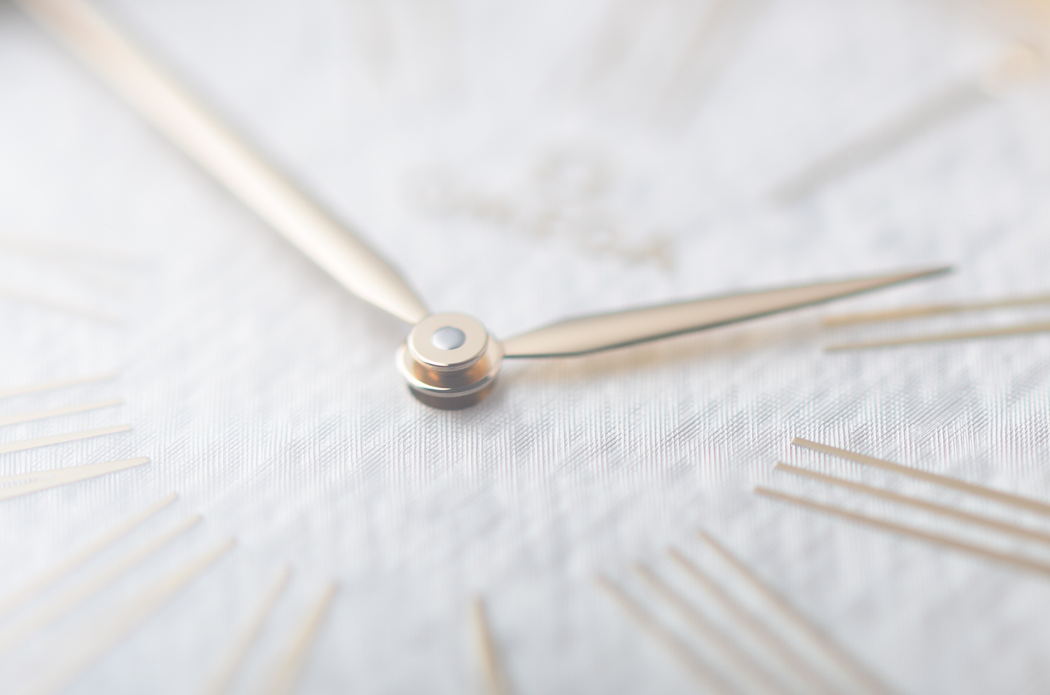 表盘采用银白色丝绸纹压纹工艺,细腻、柔和、富有层次感。