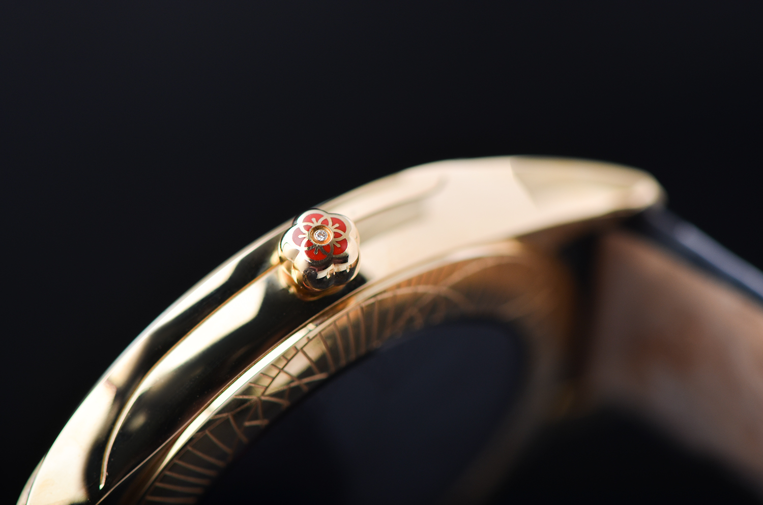 表壳:18K黄金表壳及表扣,表框原厂镶嵌38颗hao华天然美钻,共计约0.69克拉,花朵表冠镶嵌一颗钻石,约0.003克拉