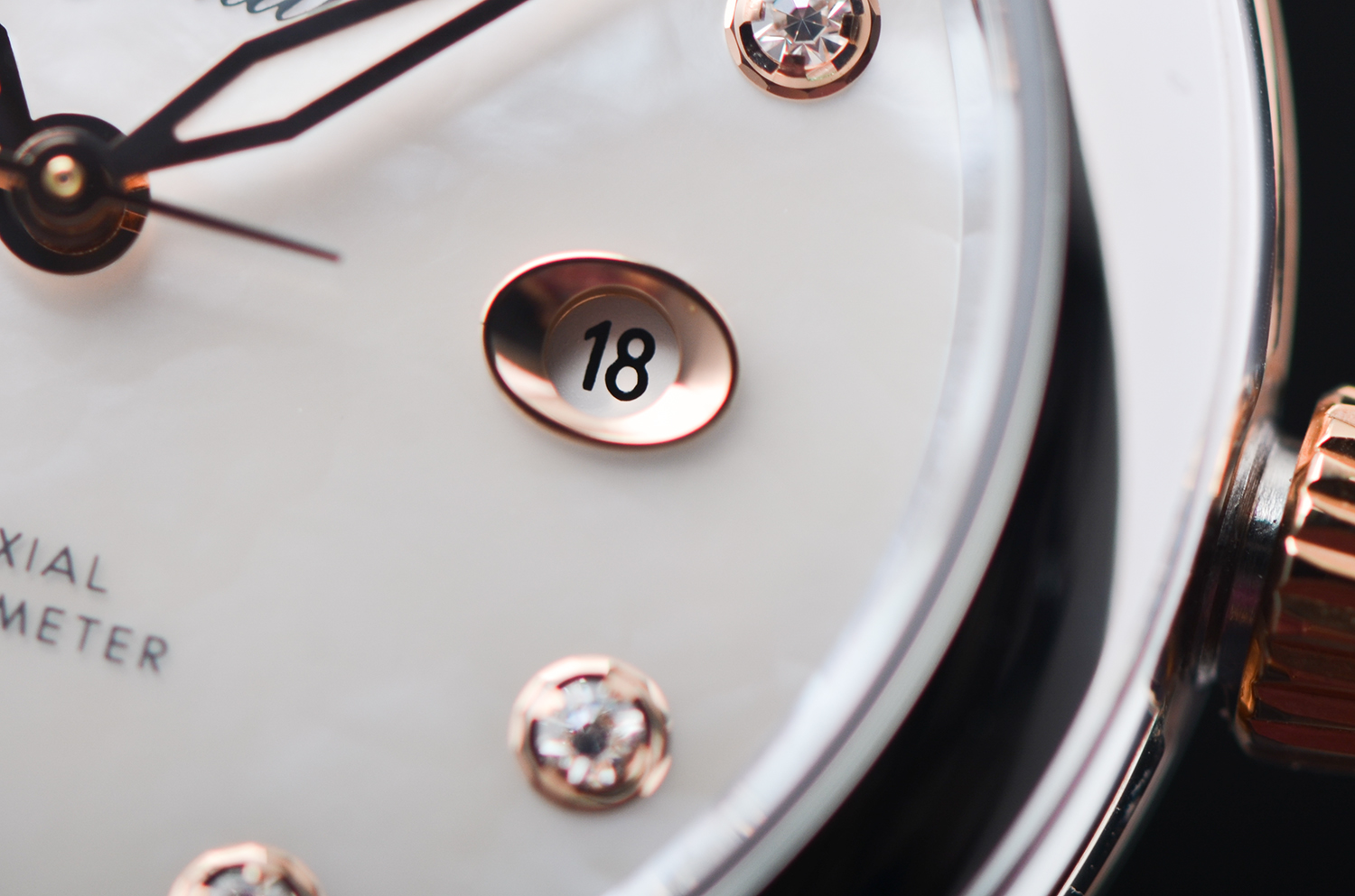 表盘采用天然白色珍珠母,每一次转腕,都会呈现柔和且独一无二的光影变化。