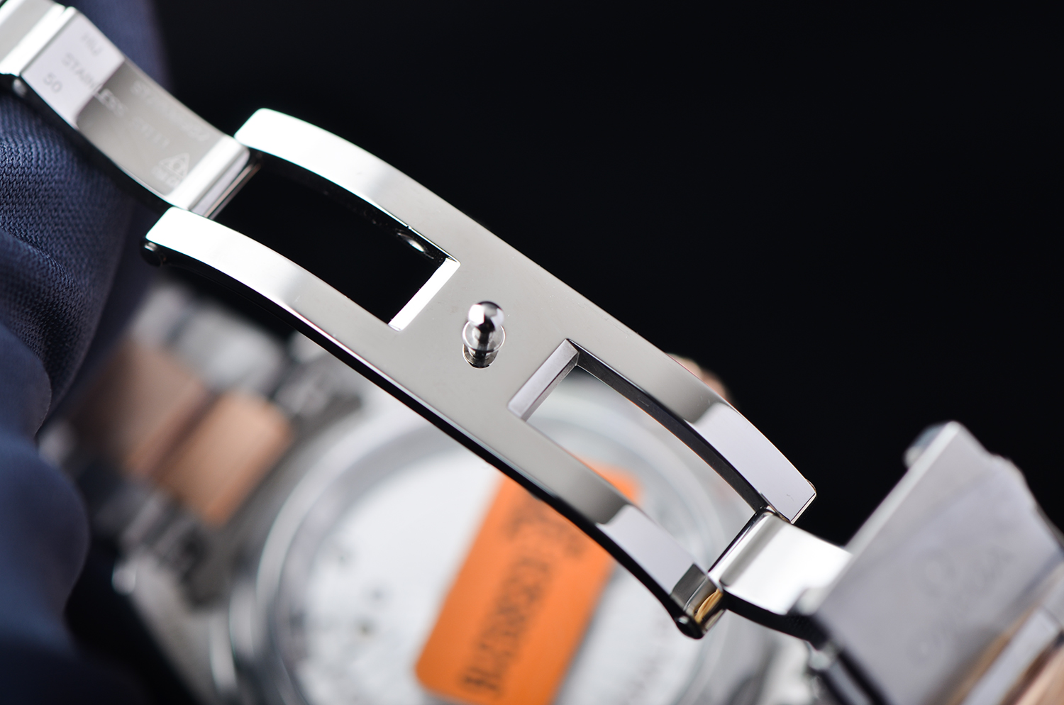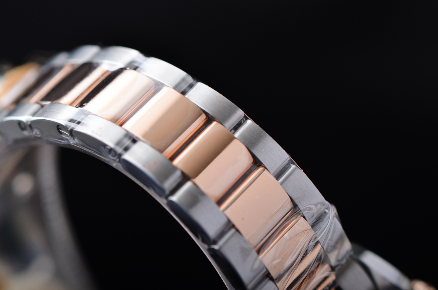 表壳:精钢表壳,18K玫瑰金表圈原厂镶嵌46颗hao华天然美钻,共计约1.12克拉