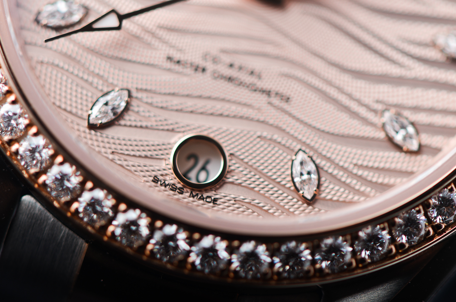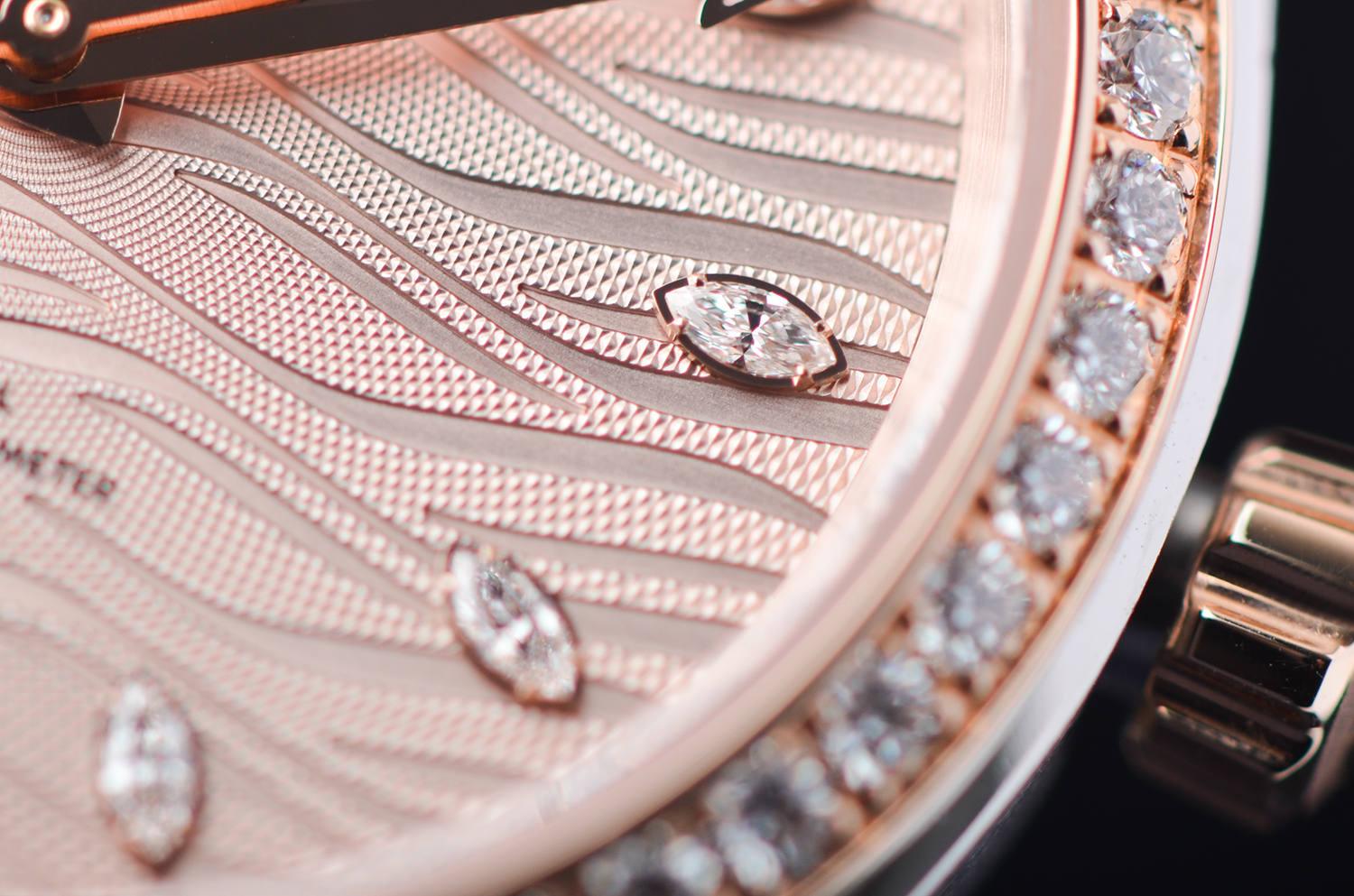 表盘:立体蜜金色波浪纹表盘,玫瑰金夜光指针,11颗钻石时标共计约0.14克拉,日历显示