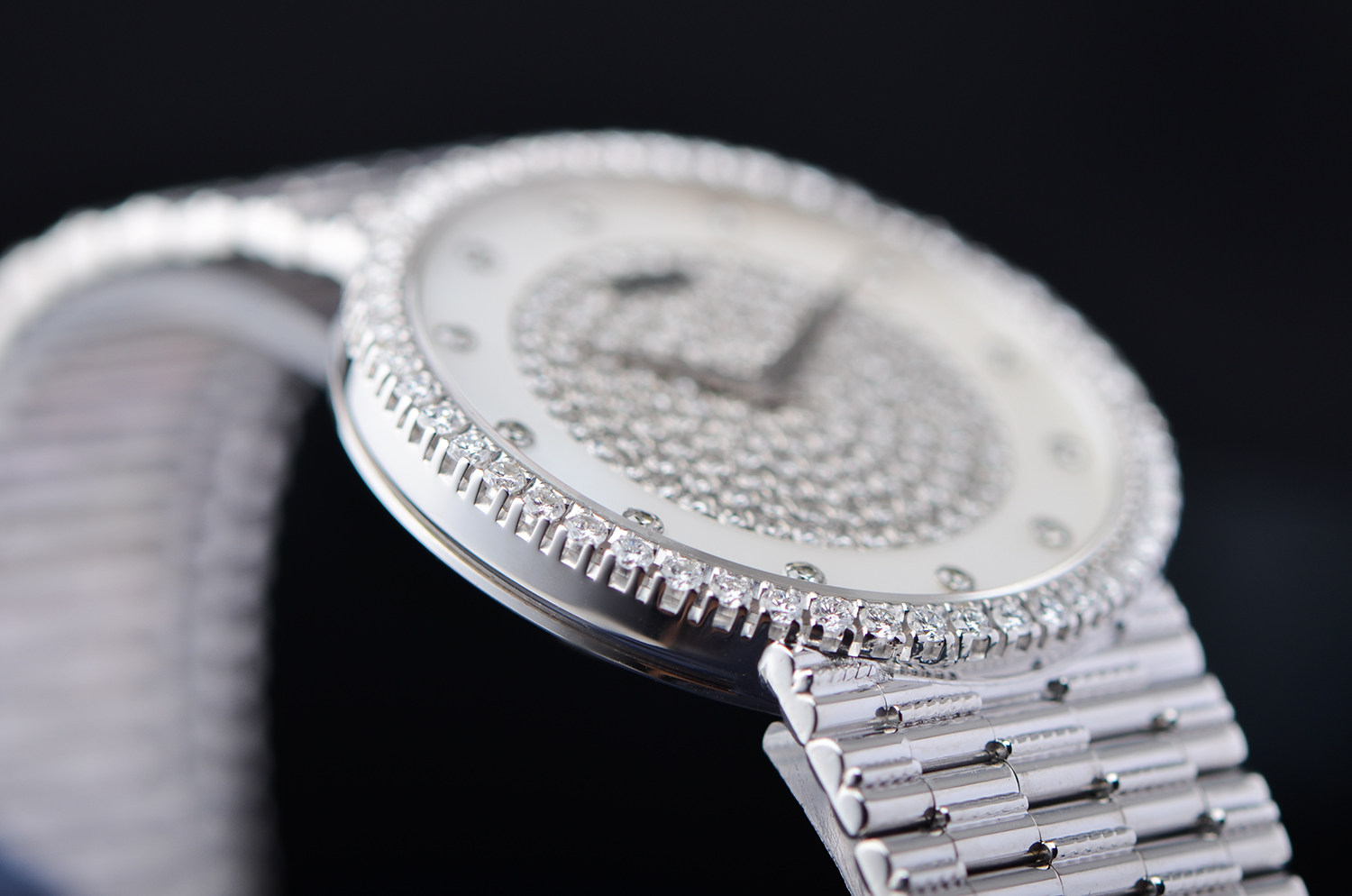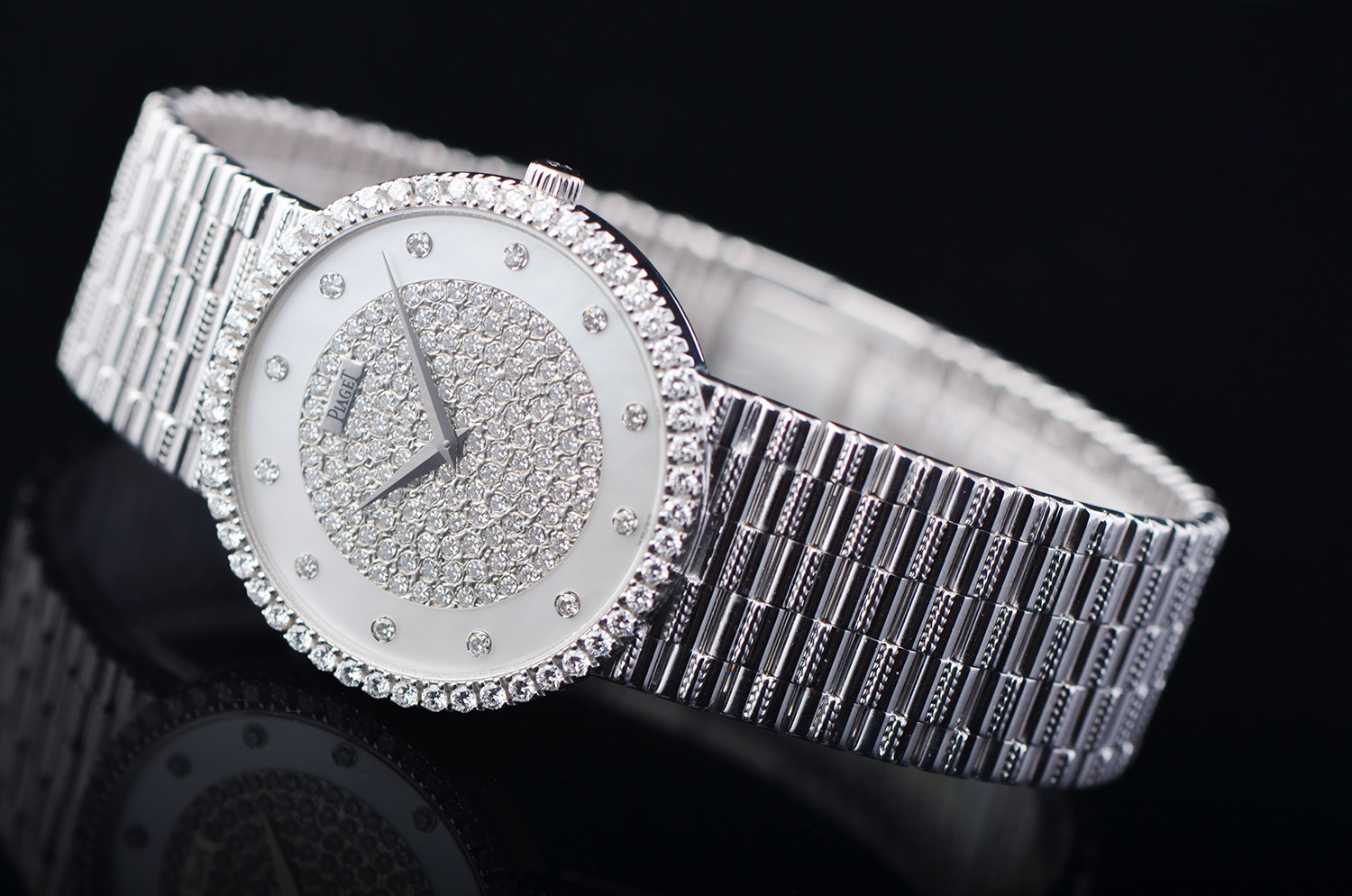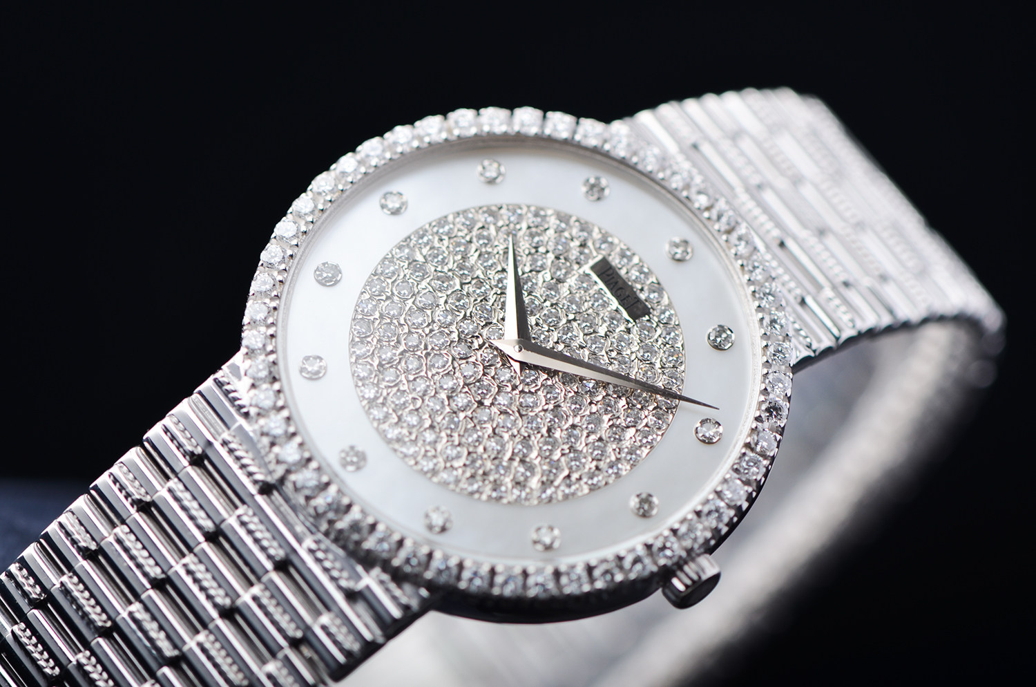 表壳与链带均采用伯爵标志性的细腻金工工艺,配合表盘上 镶嵌钻石时标,每个角度都让人过目难忘。