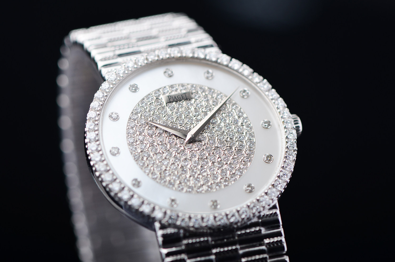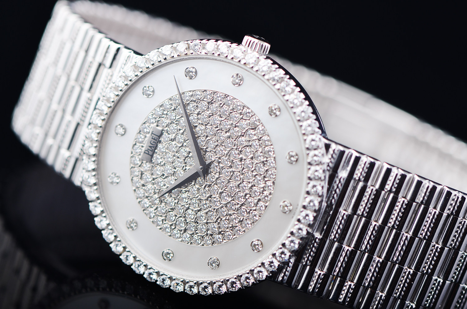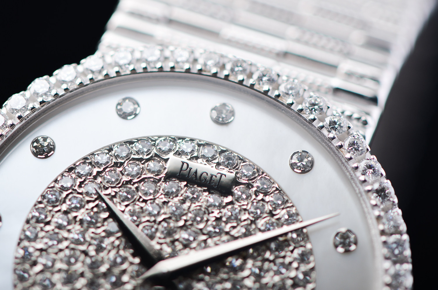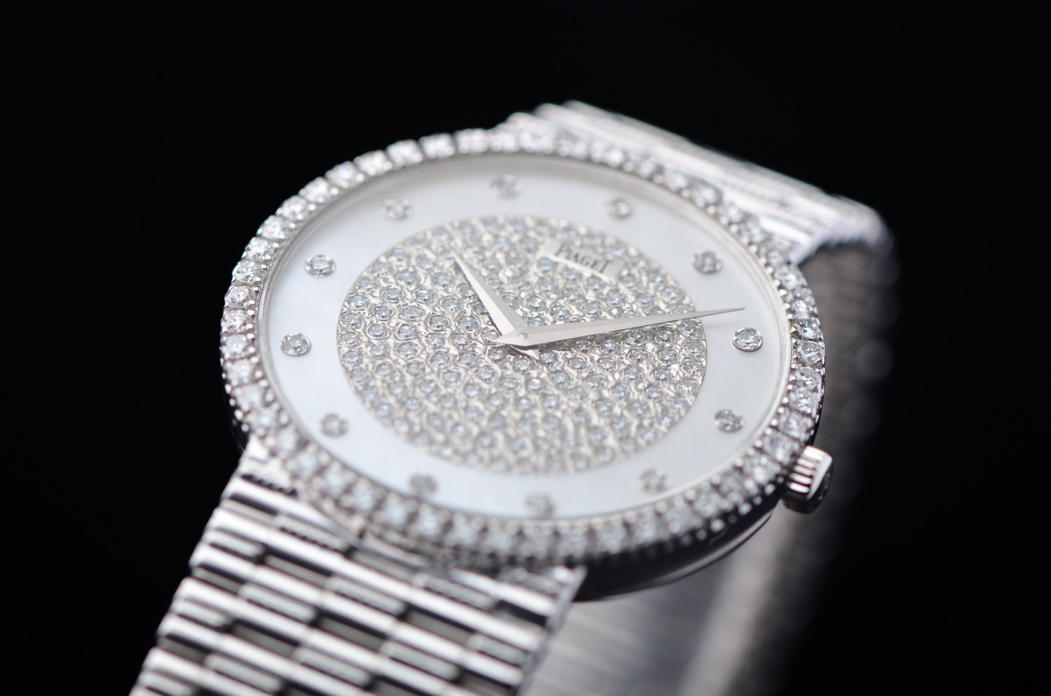 表壳与链带均采用伯爵标志性的细腻金工工艺,配合表盘上 镶嵌钻石时标,每个角度都让人过目难忘。