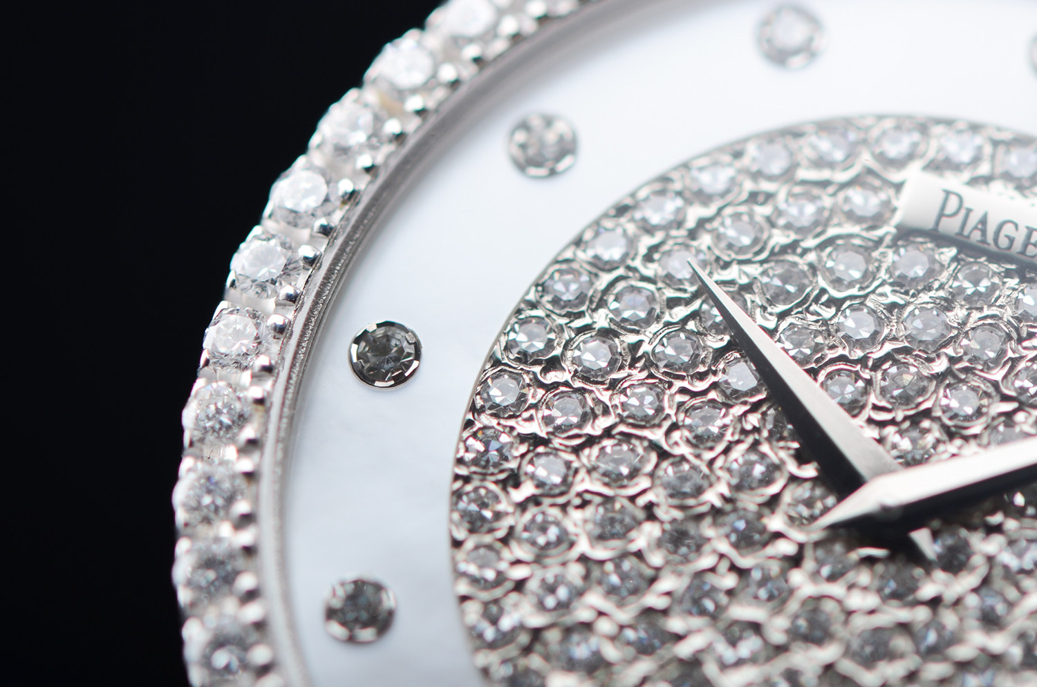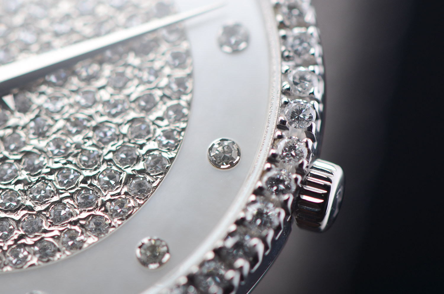 表盘:立体满天星镶钻及珍珠贝母表盘,12颗钻石时标,白金指针