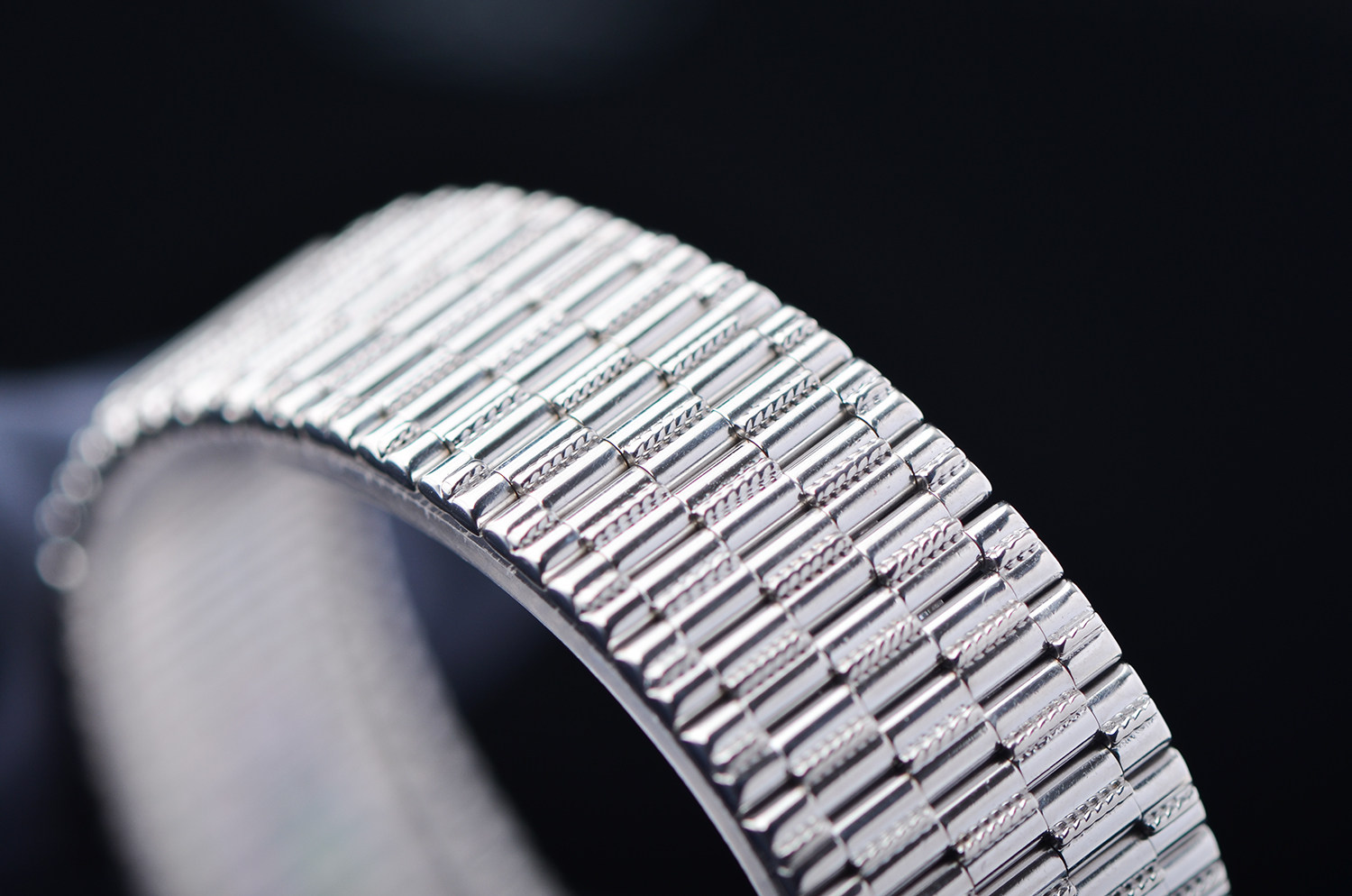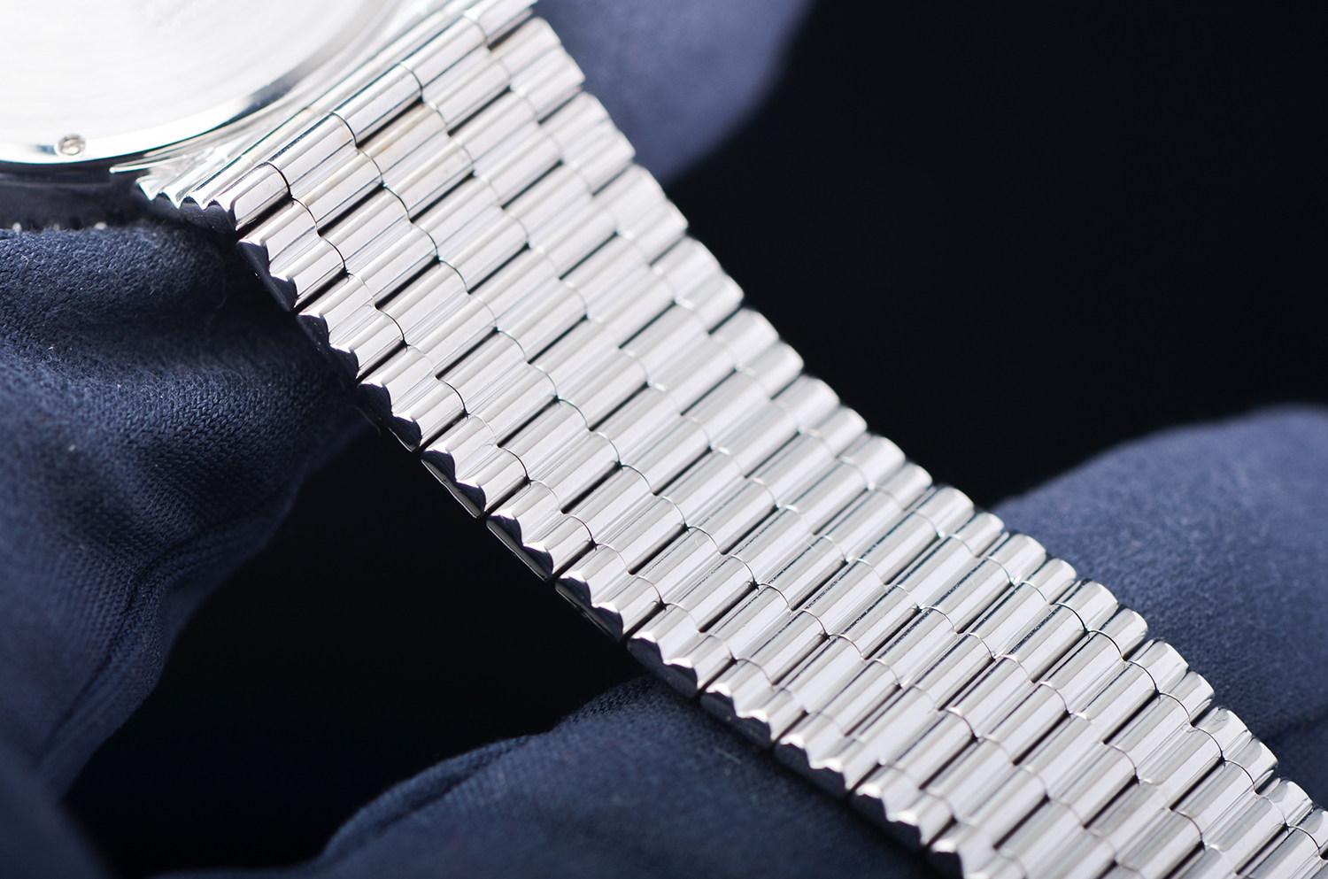整表以 18K白金打造,低调奢华的金属质感在光线下散发冷静而迷人的光辉。
