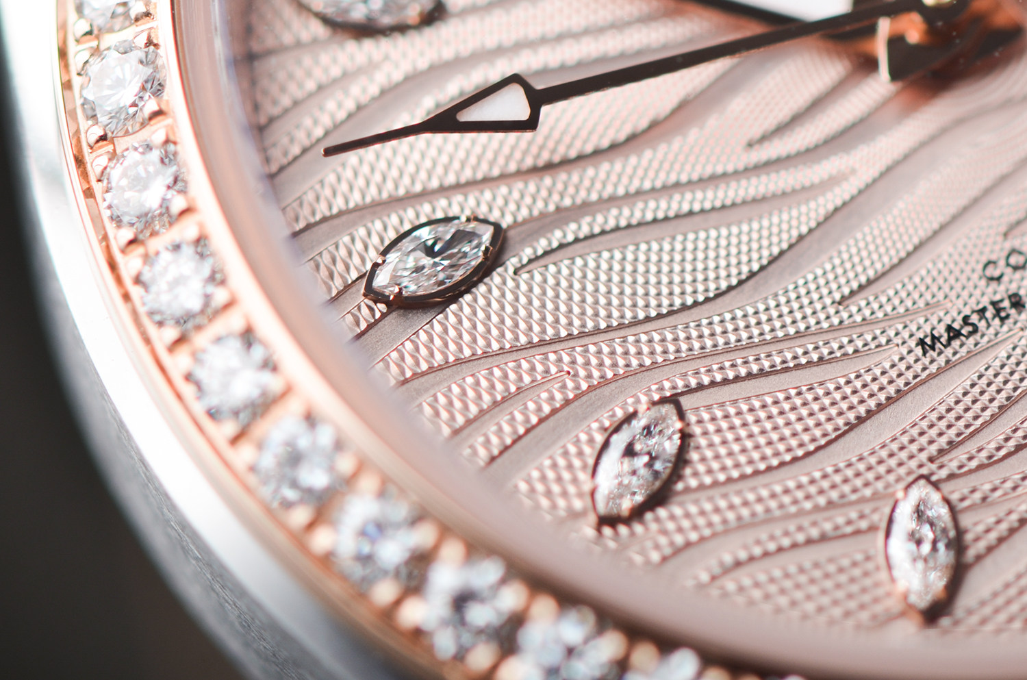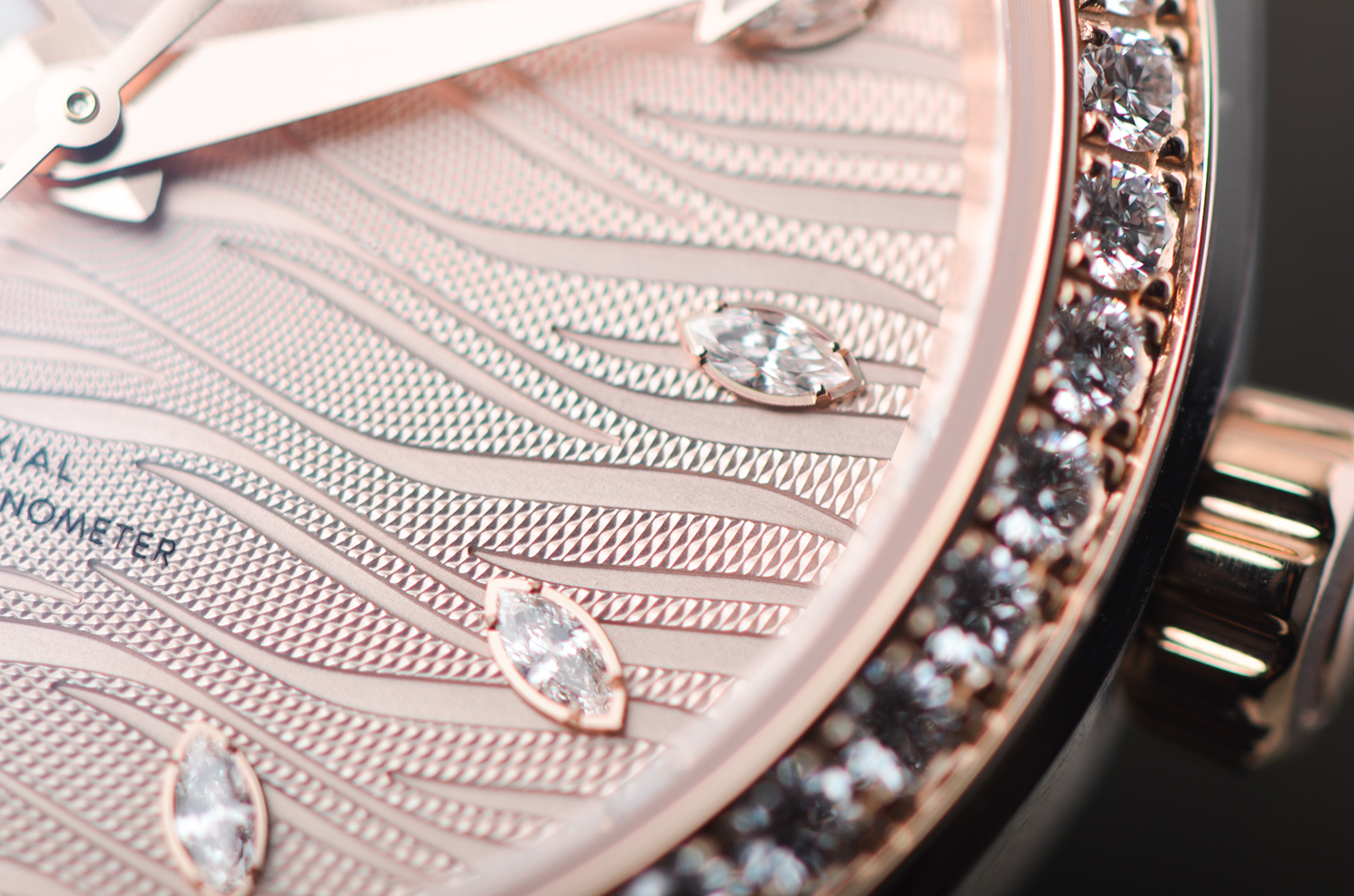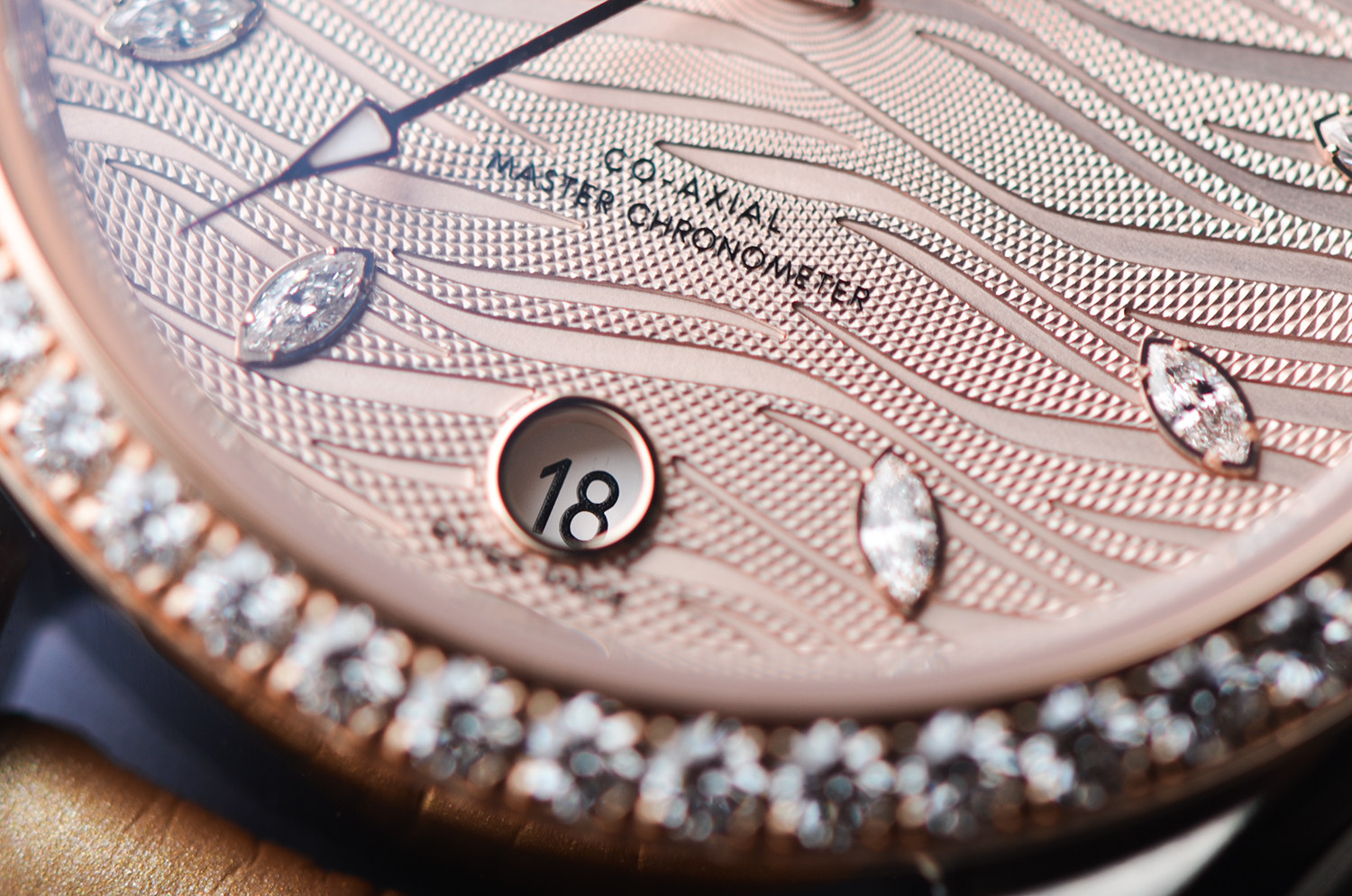 表盘: 立体蜜金色波浪纹表盘,玫瑰金夜光指针,11颗钻石时标共计约0.14克拉,日历显示