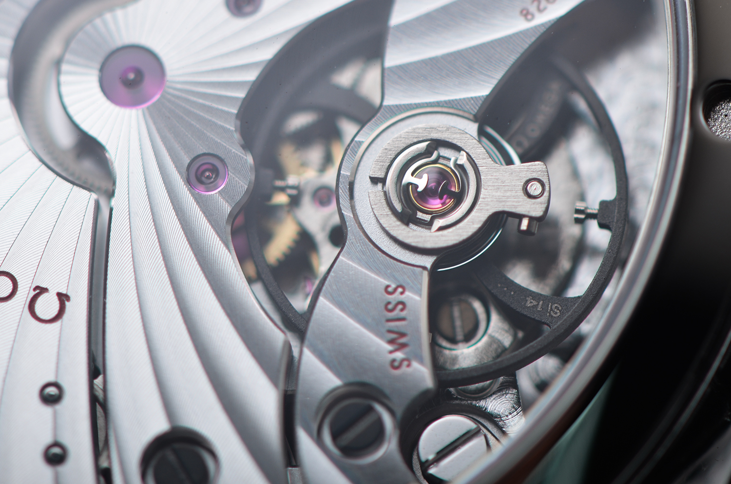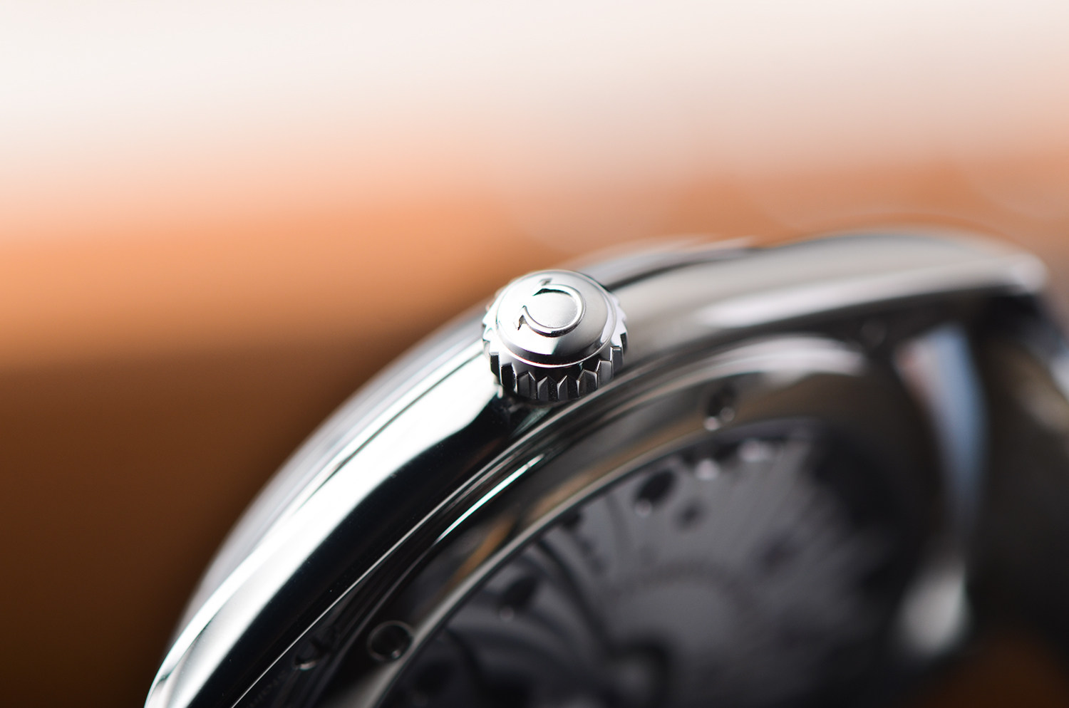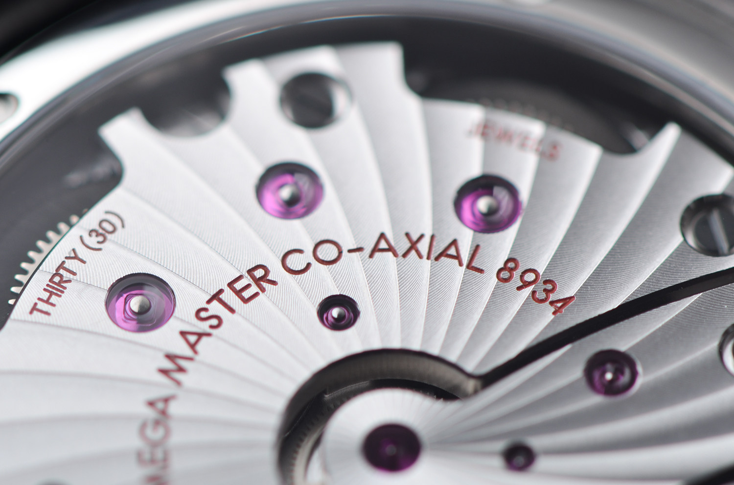 搭载 Omega 8934 手上链机芯,通过大师天文台八项严苛认证,精准、耐磁、稳定。