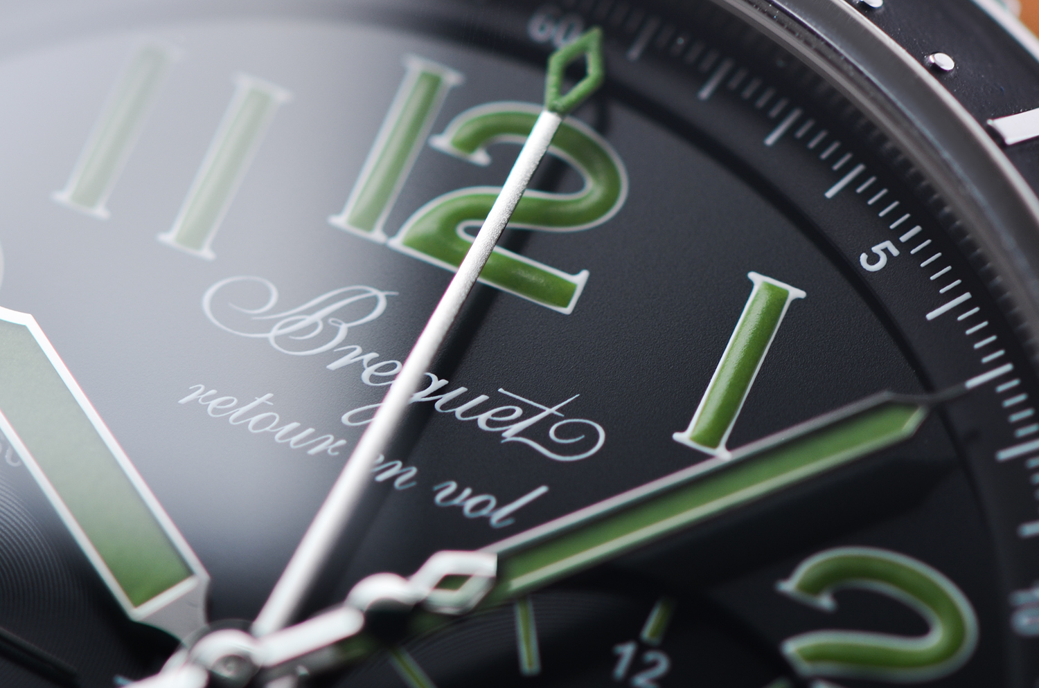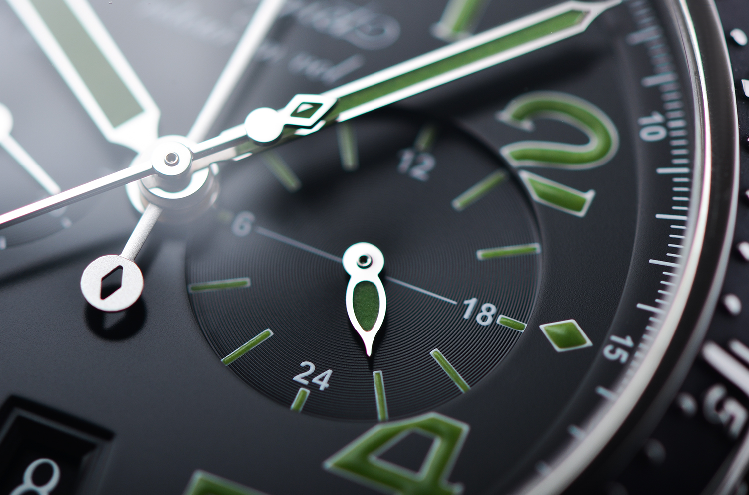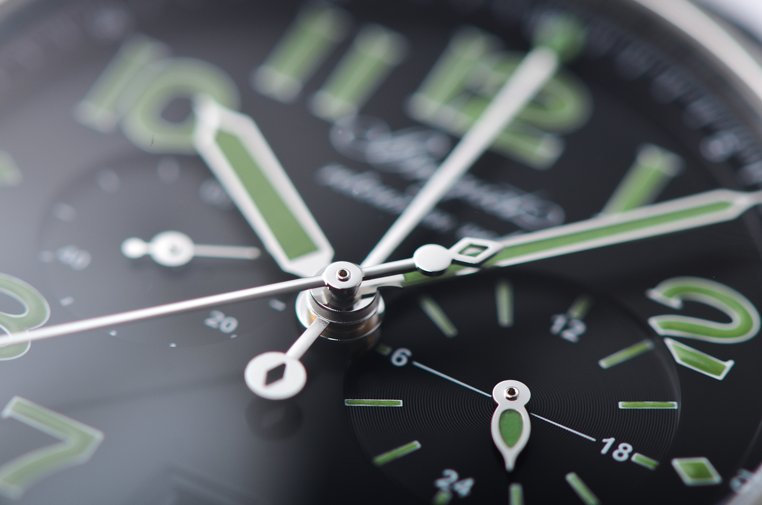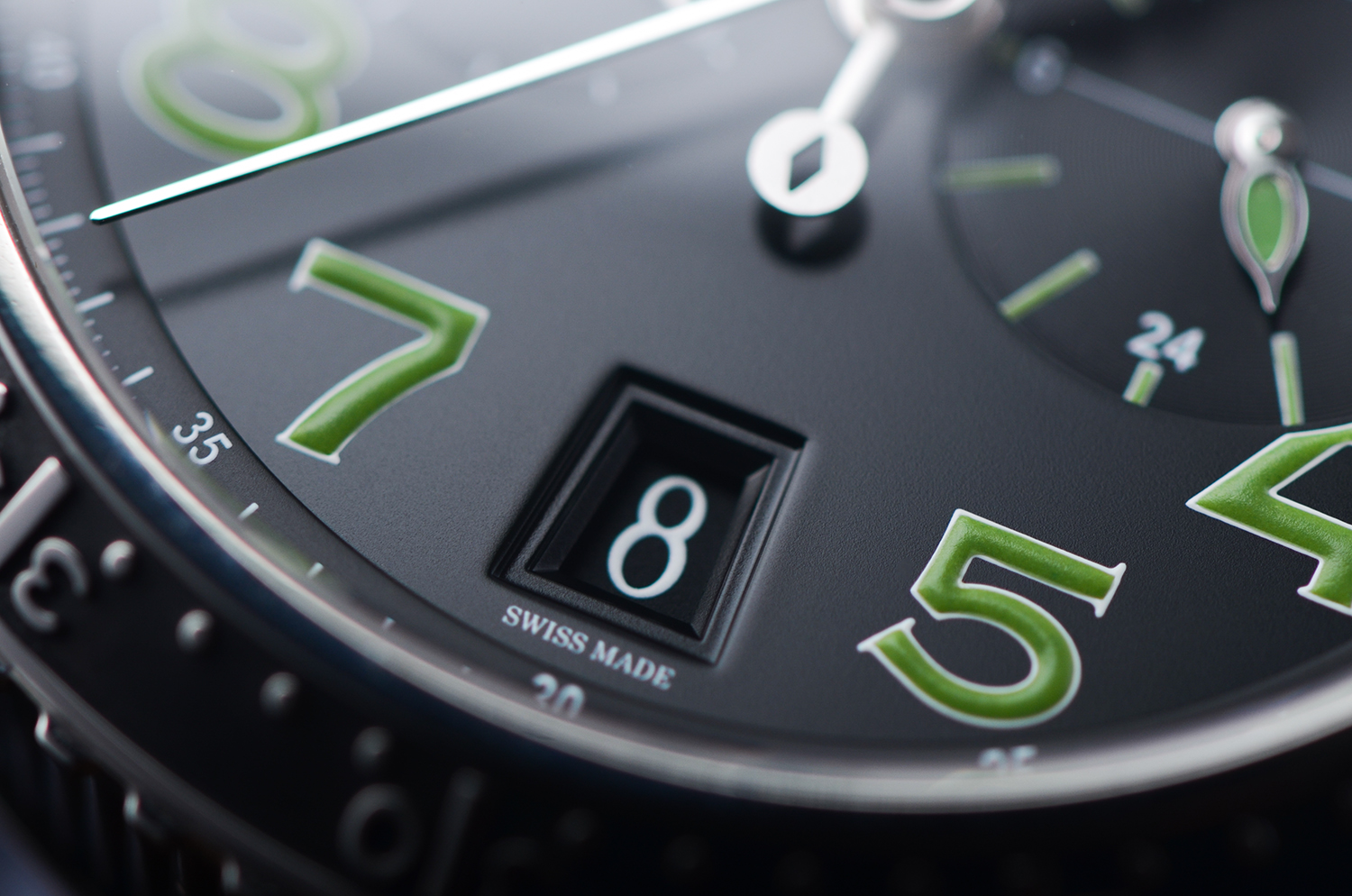 这款腕表的最大亮点之一在于其醒目的绿色Super-LumiNova®夜光刻度与指针。在黑色表盘的背景下,绿色大字体阿拉伯数字极具视觉冲击力,不仅易于读取,更带来一种现代军事美学的全新演绎。