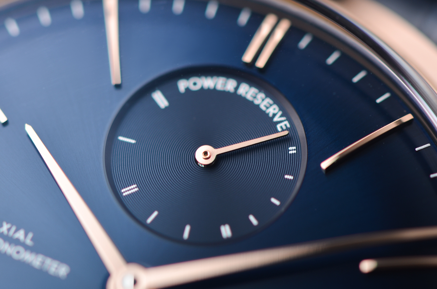 表盘:立体蓝色表盘,玫瑰金刻度及指针,动能储备显示