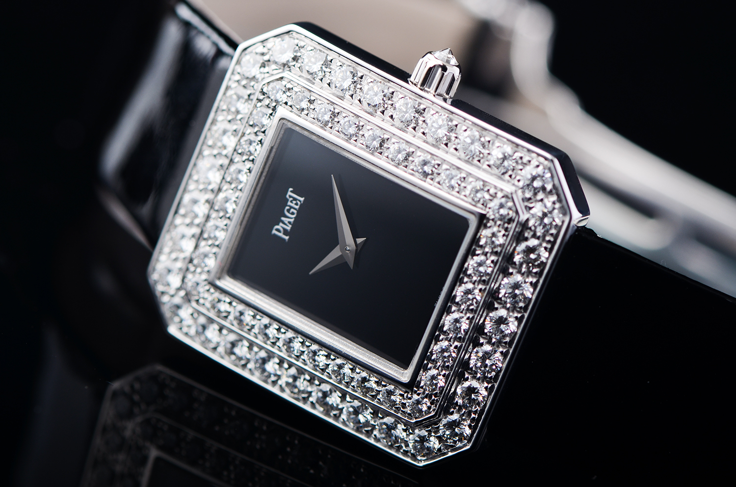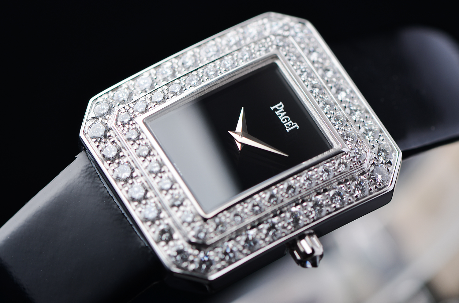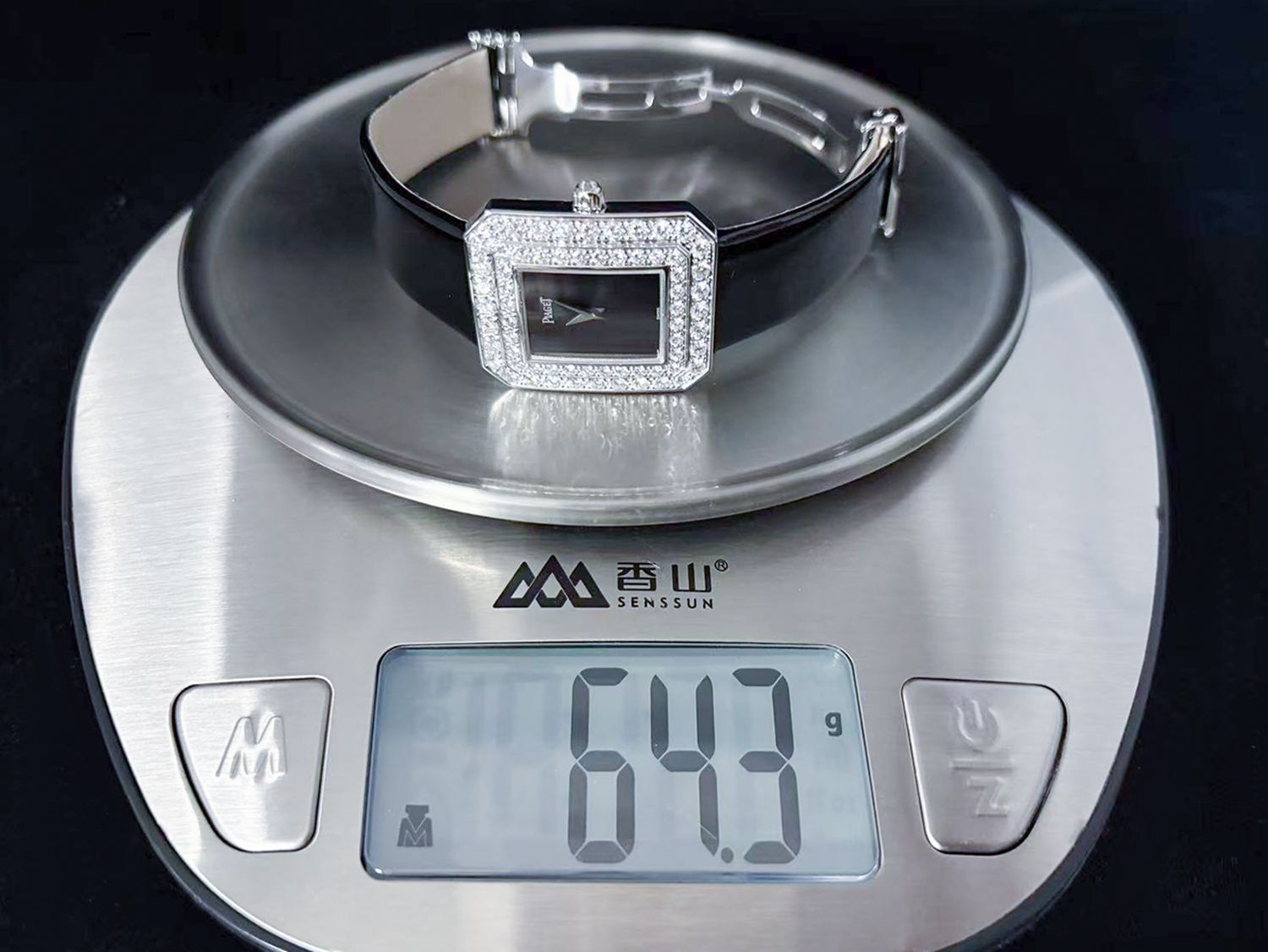 【售价58800RMB 白金原镶钻,黑玛瑙表盘,重64.3克】