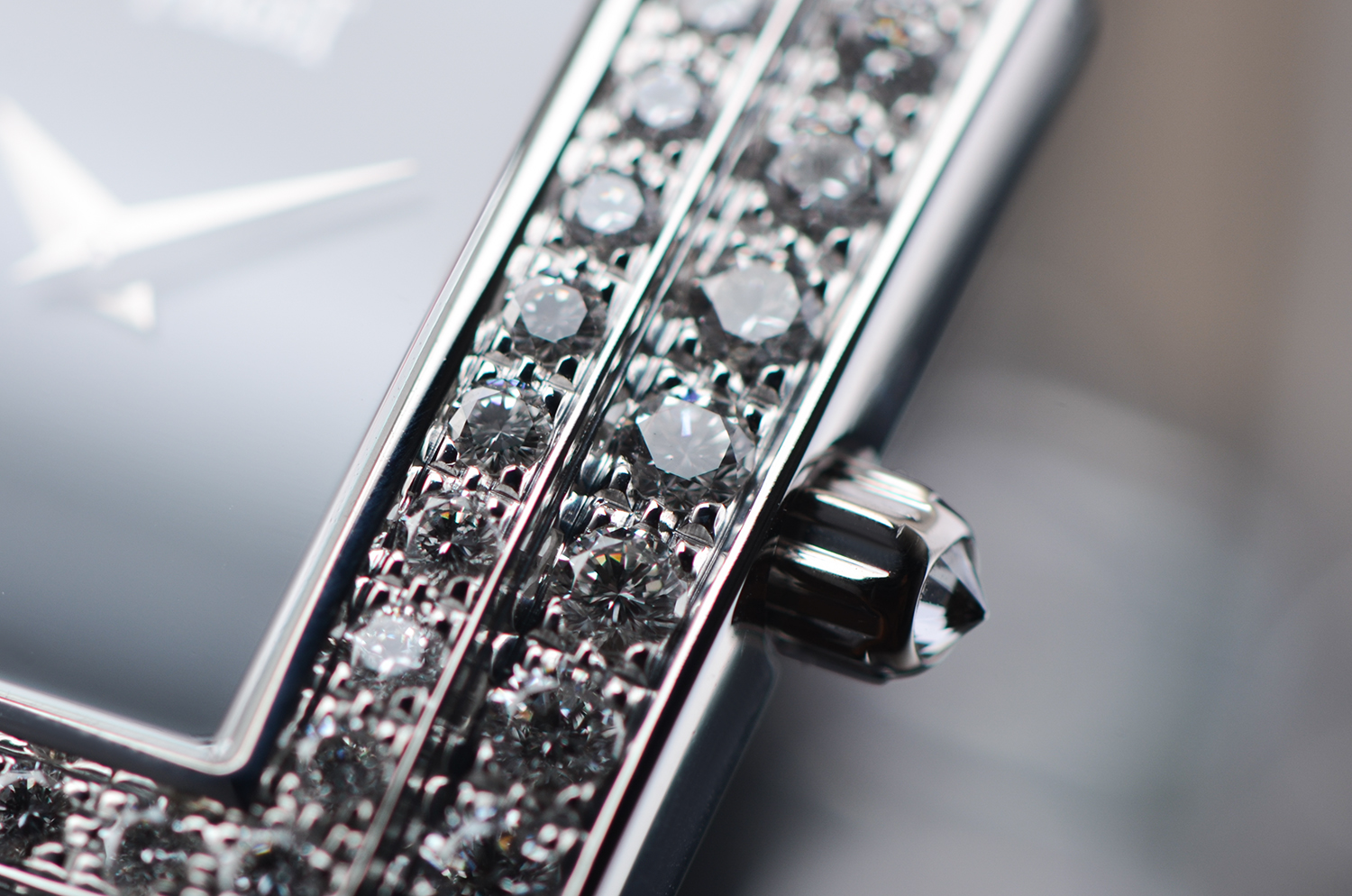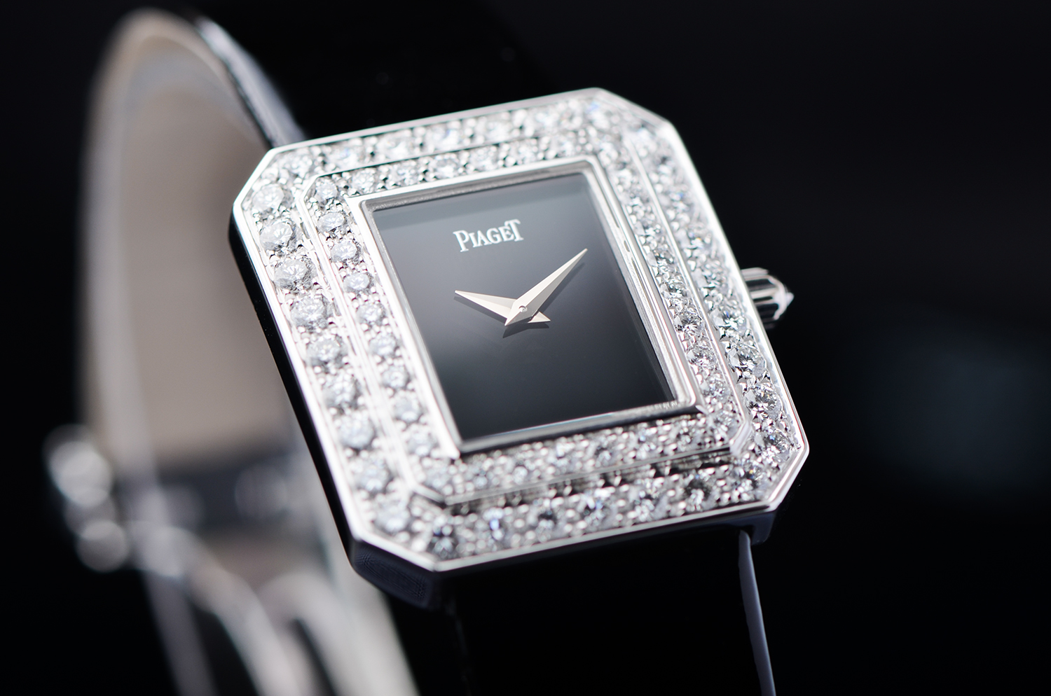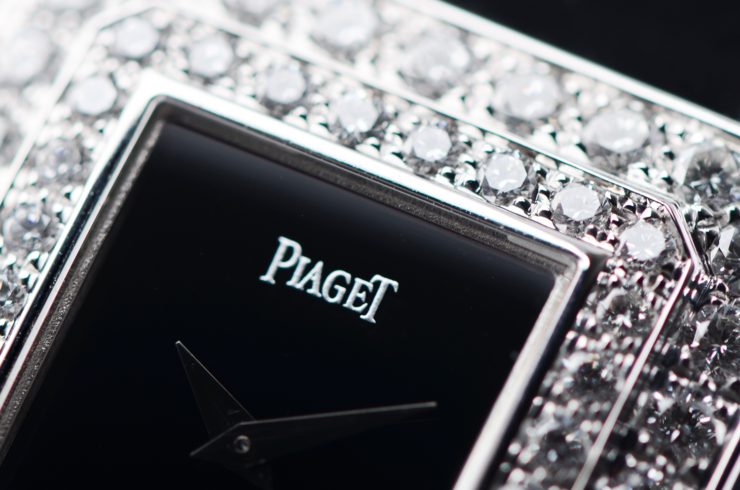 【售价58800RMB 白金原镶钻,黑玛瑙表盘,重64.3克】