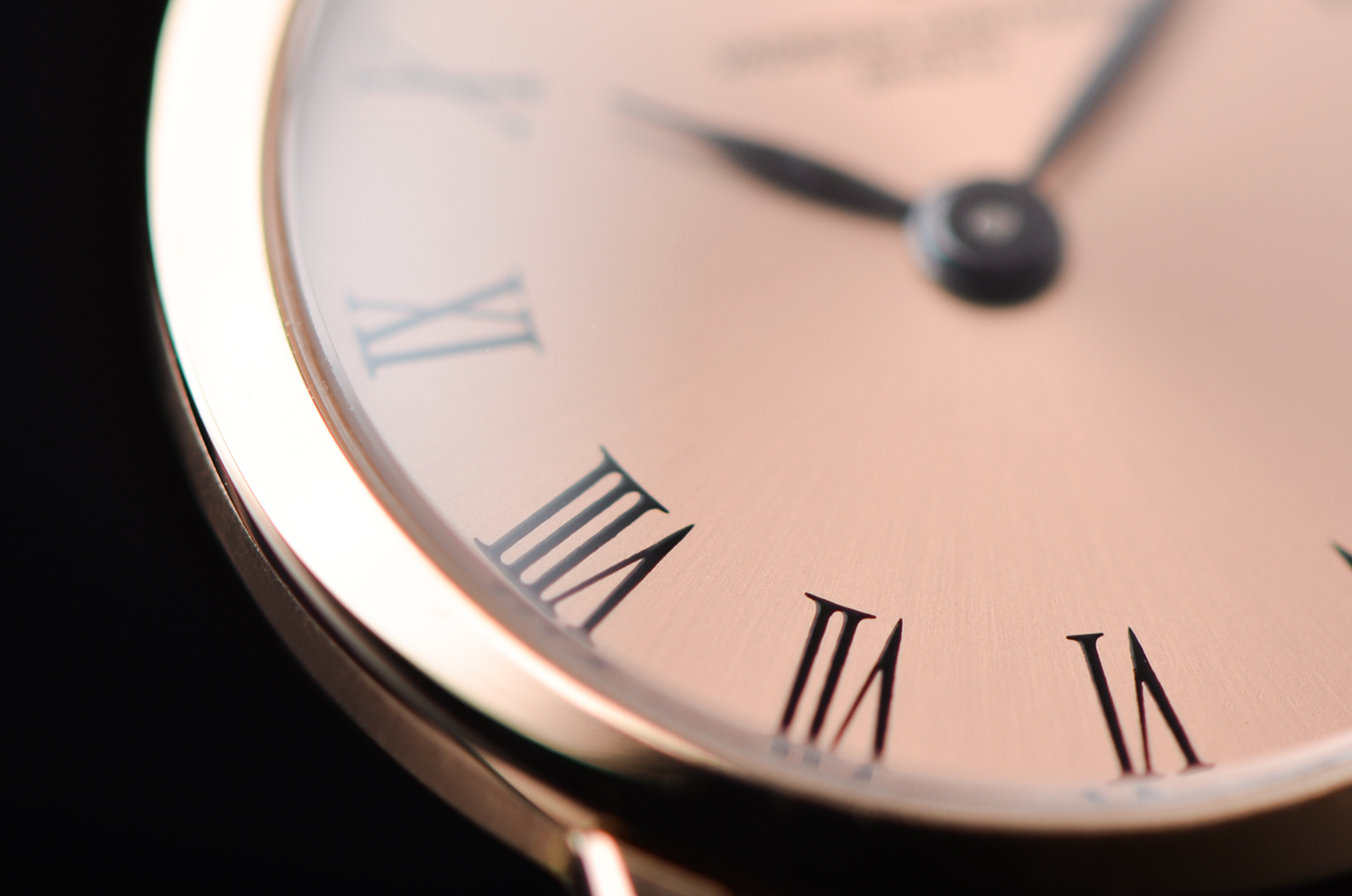 香槟金色表盘 + 纤细指针 + 罗马数字时标,