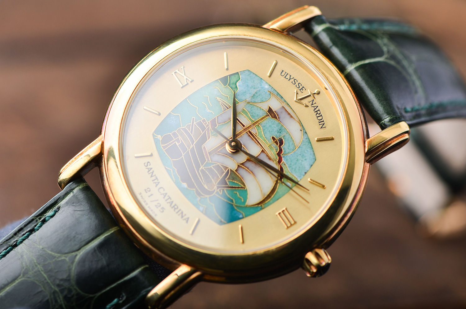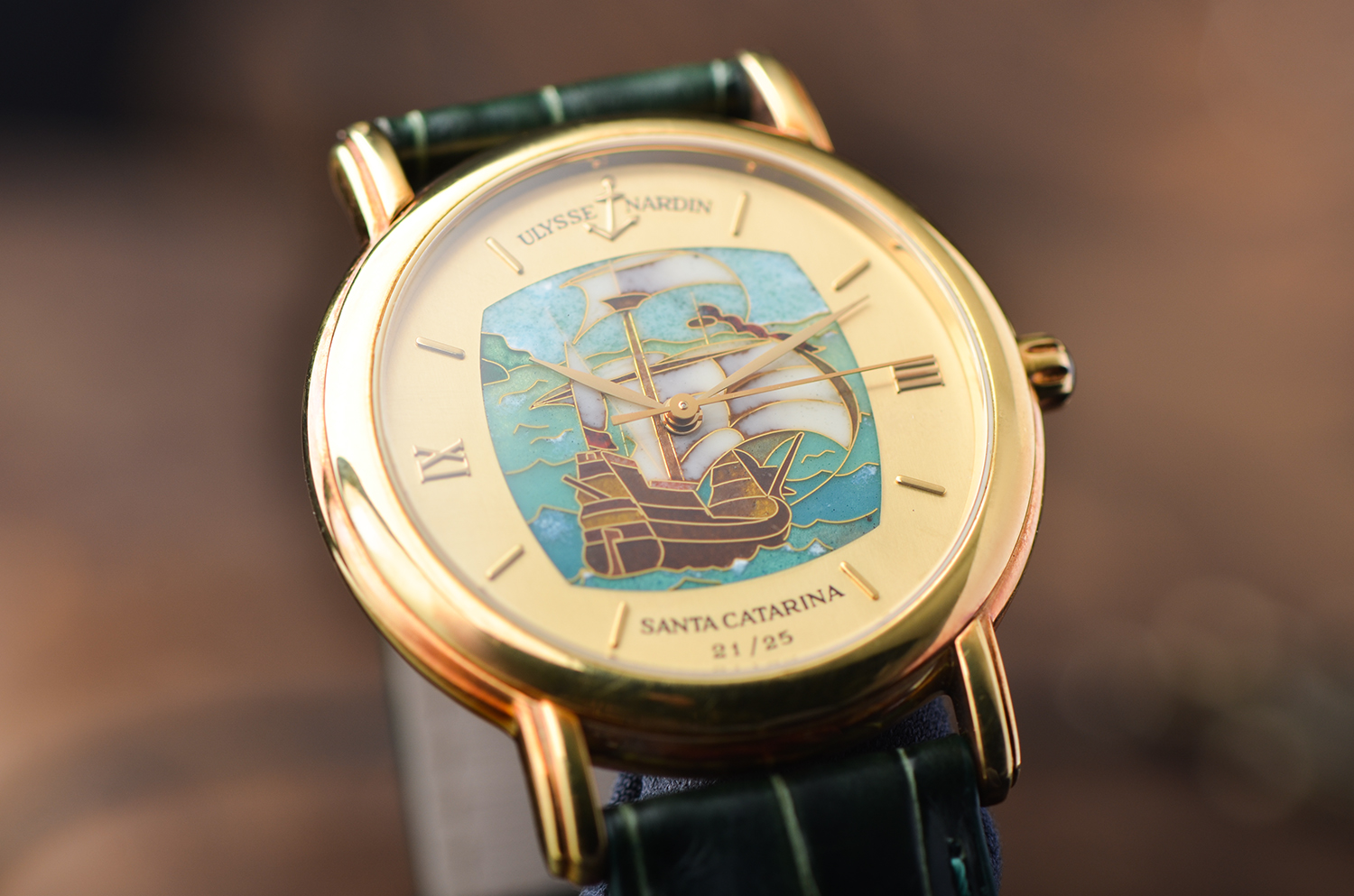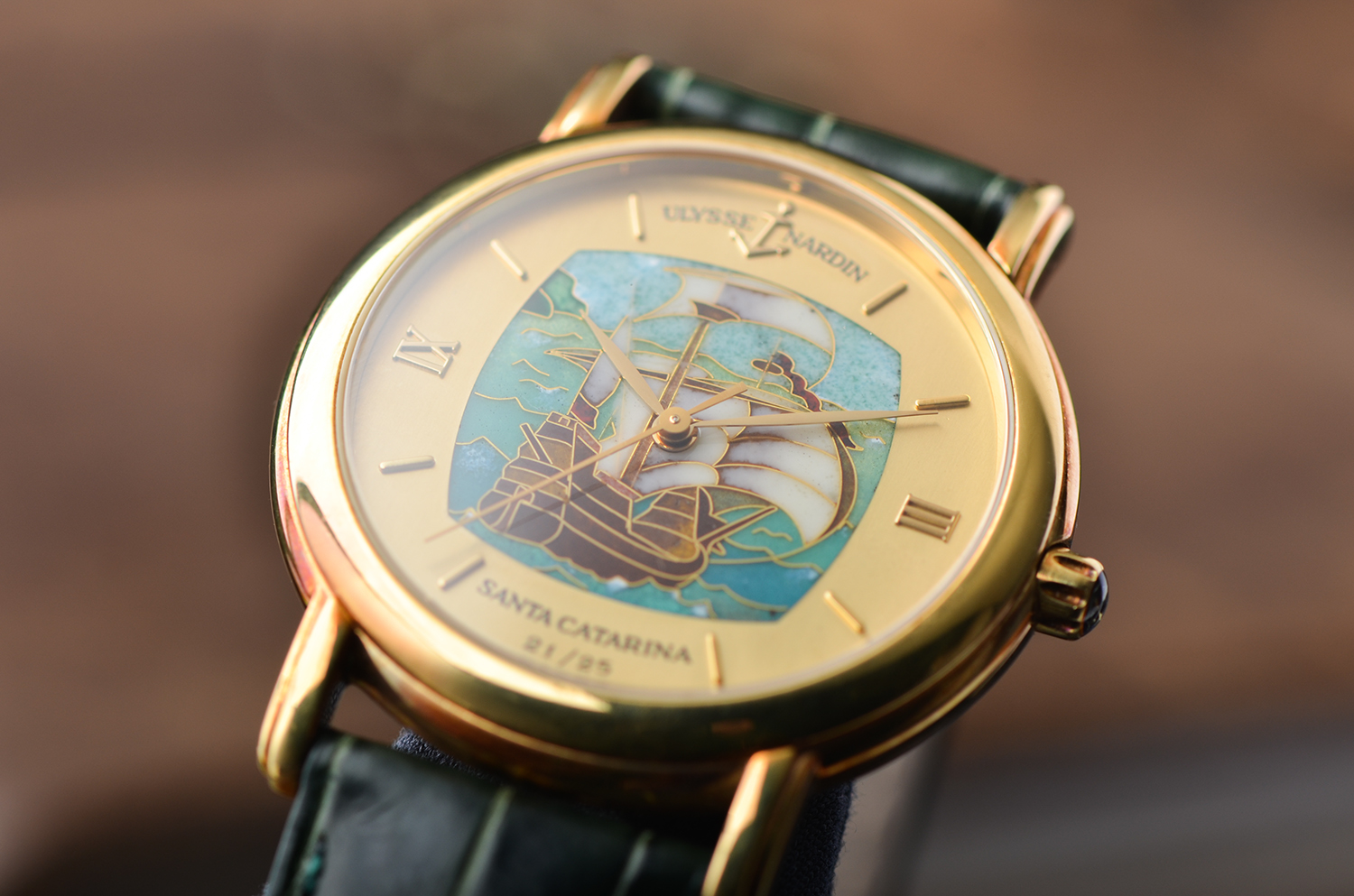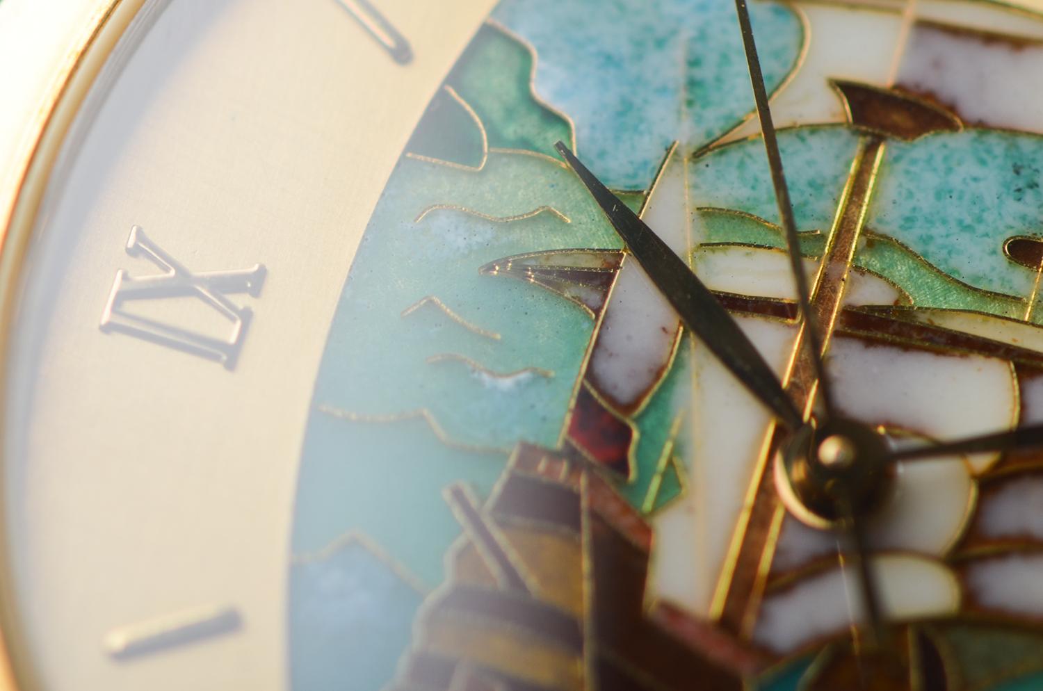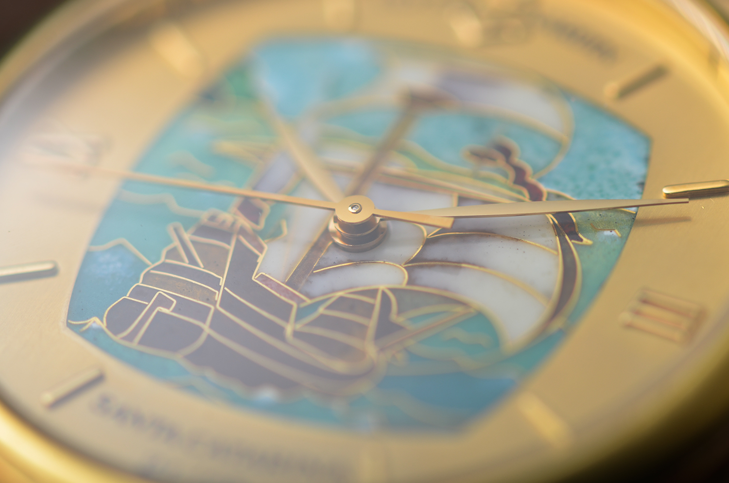 表盘: 圣卡塔琳娜号帆船掐丝珐琅面盘,黄金刻度及指针