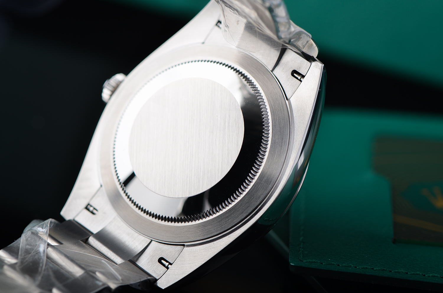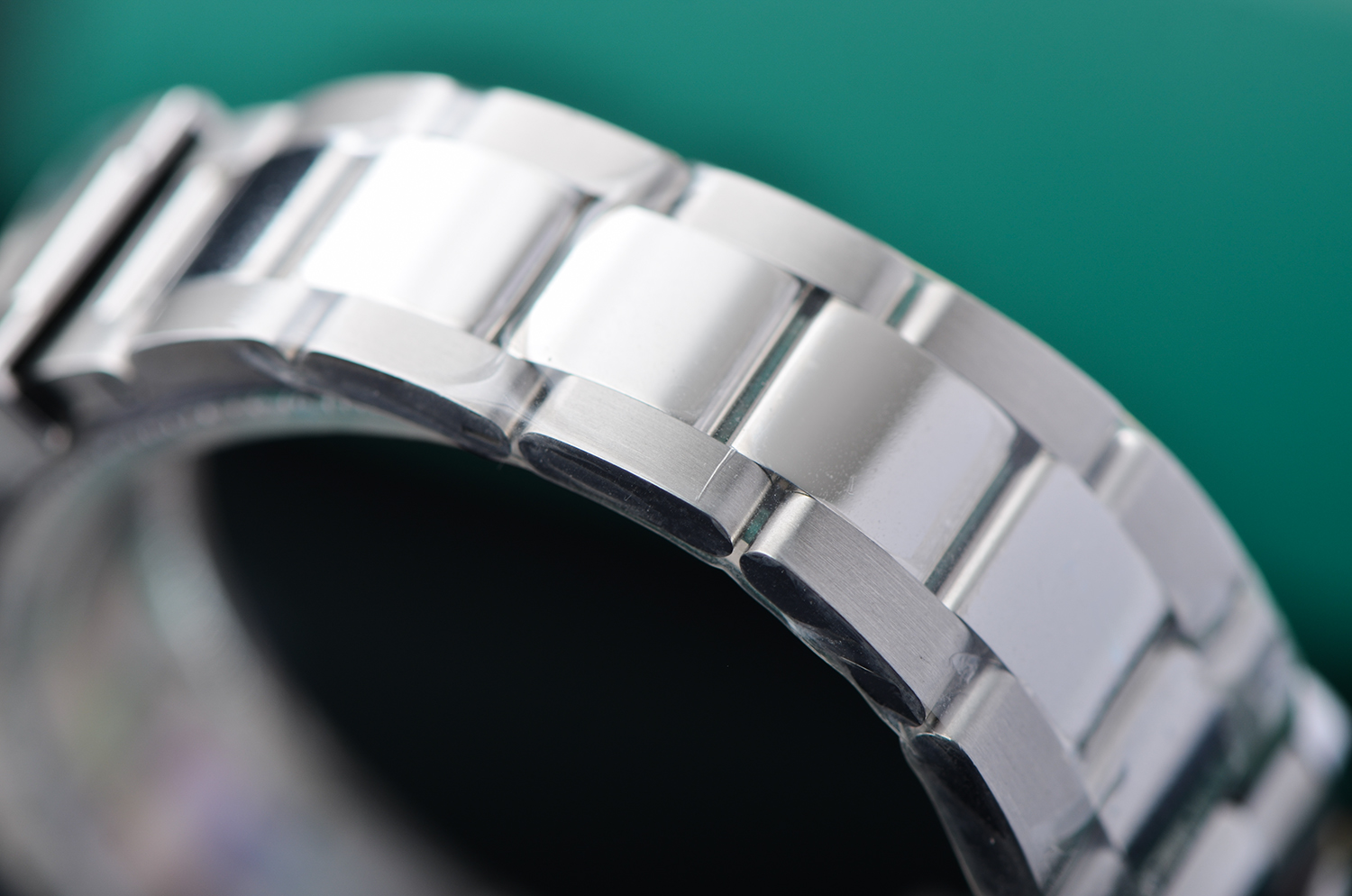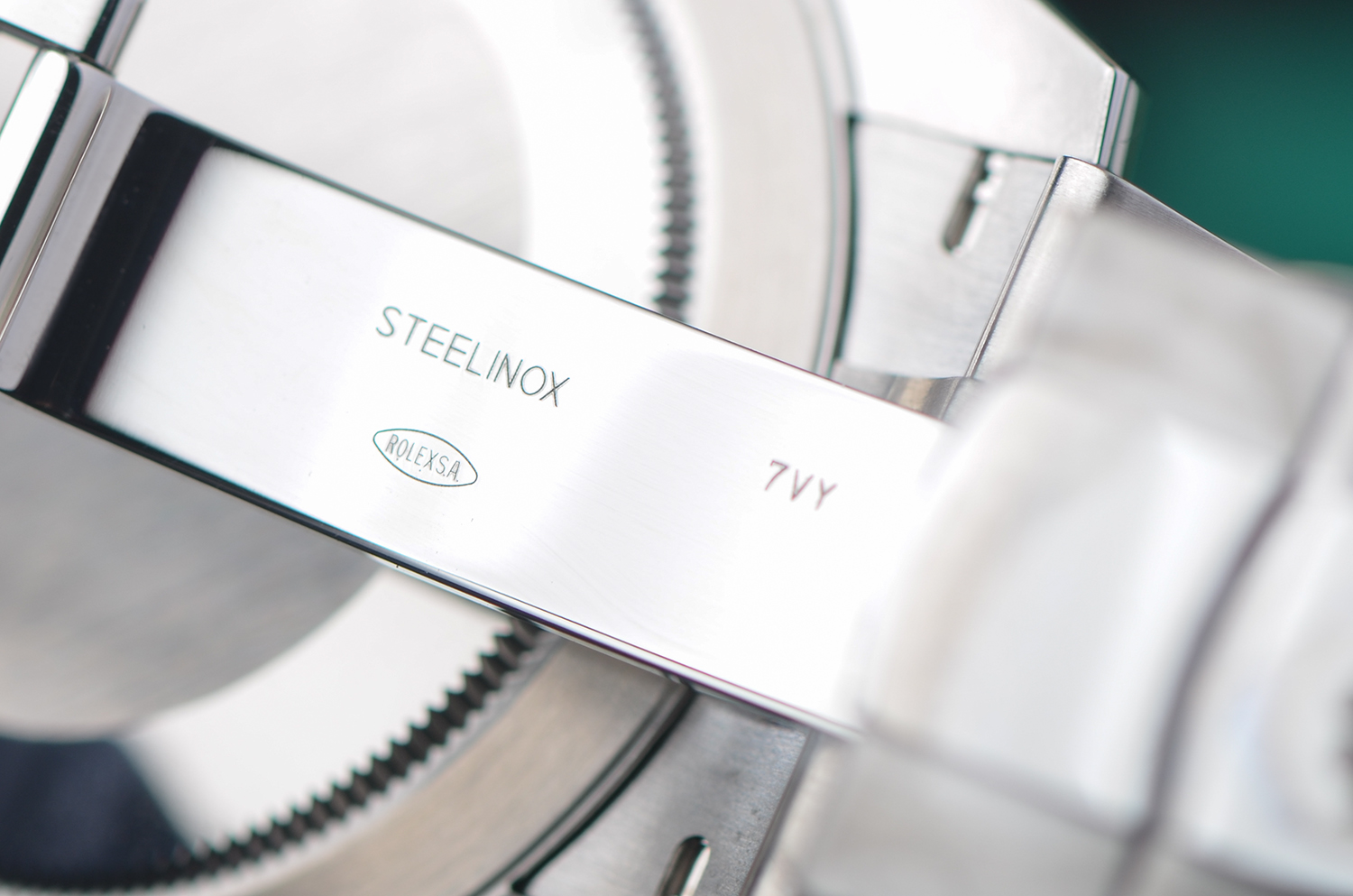 劳力士标志性的 白金坑纹外圈,搭配 904L 蚝式钢表壳,