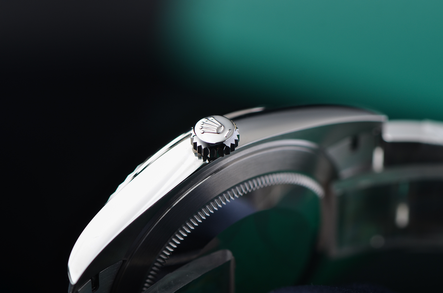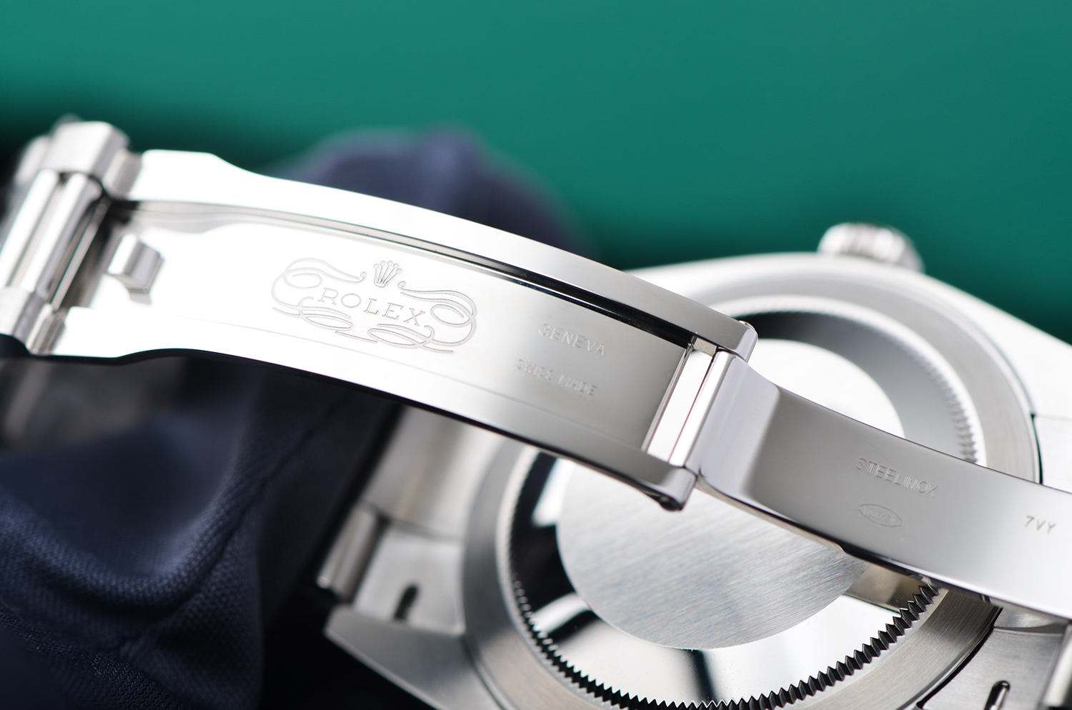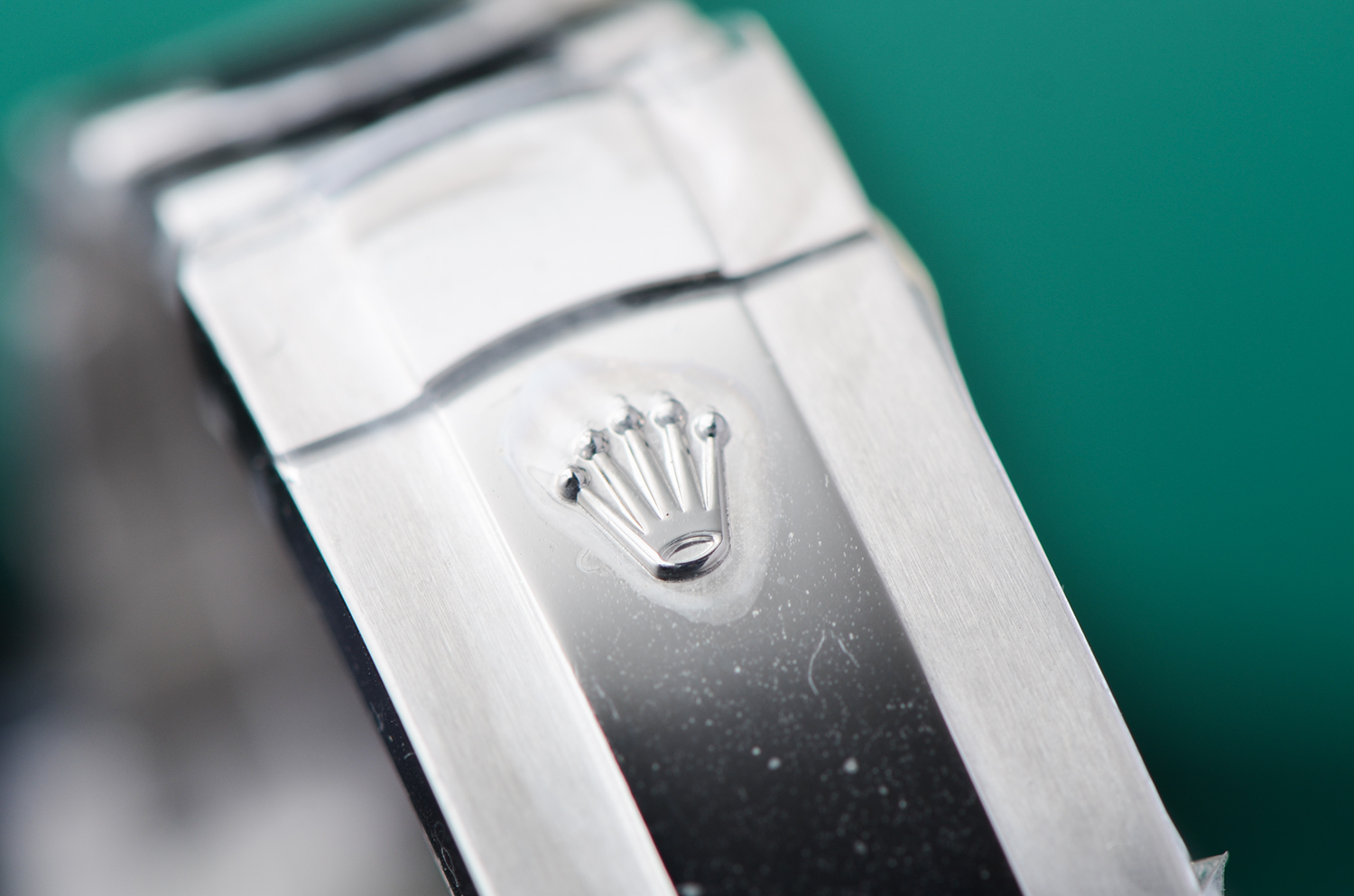 劳力士标志性的 白金坑纹外圈,搭配 904L 蚝式钢表壳,