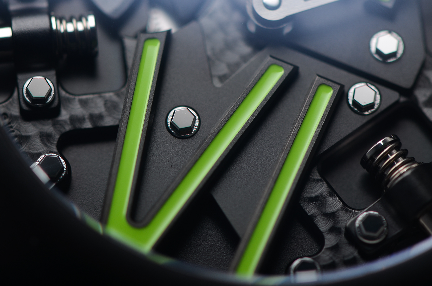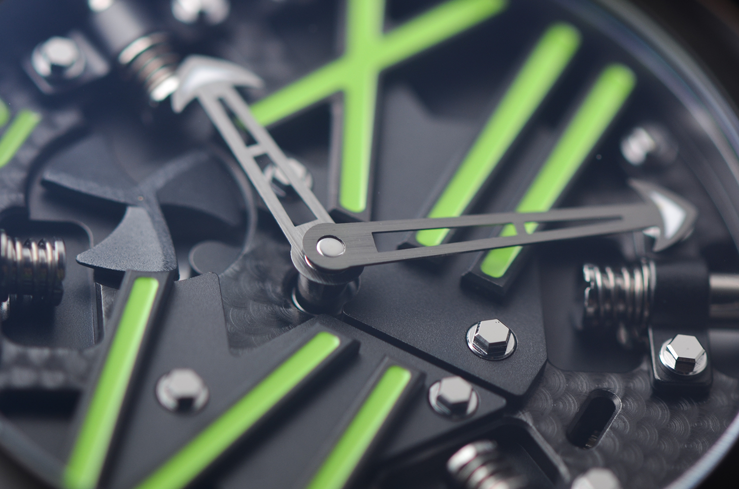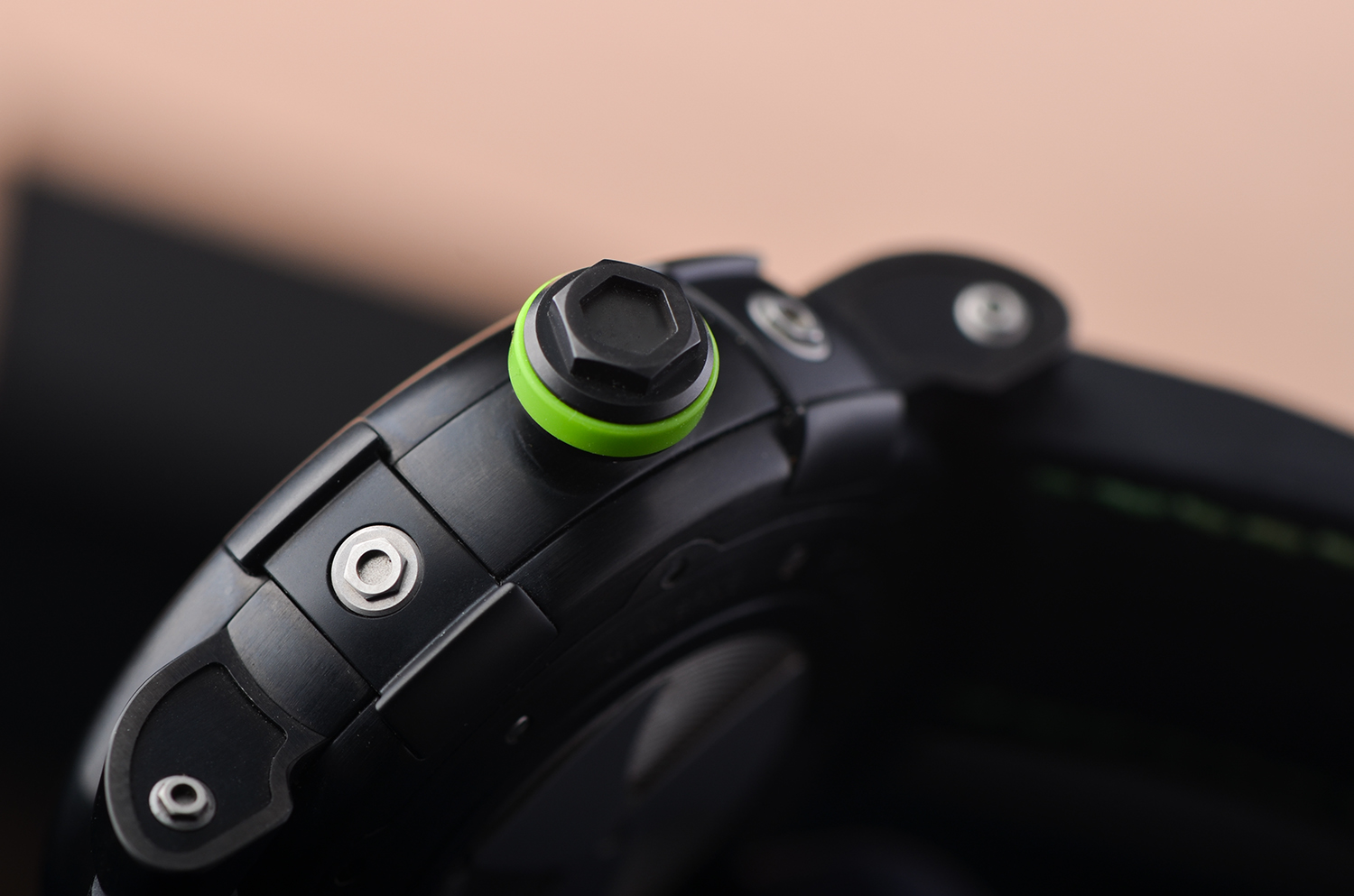 50mm 的强悍表壳、浓烈的工业朋克结构、黑金与绿色的戏剧性视觉冲击,让它从第一眼就能让人记住。