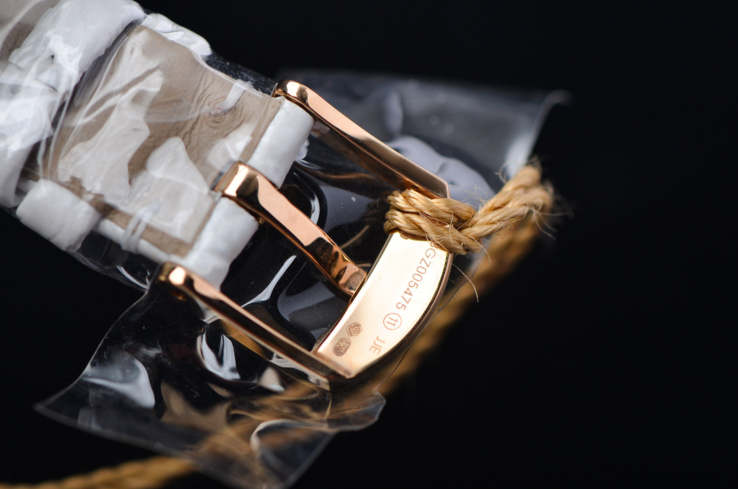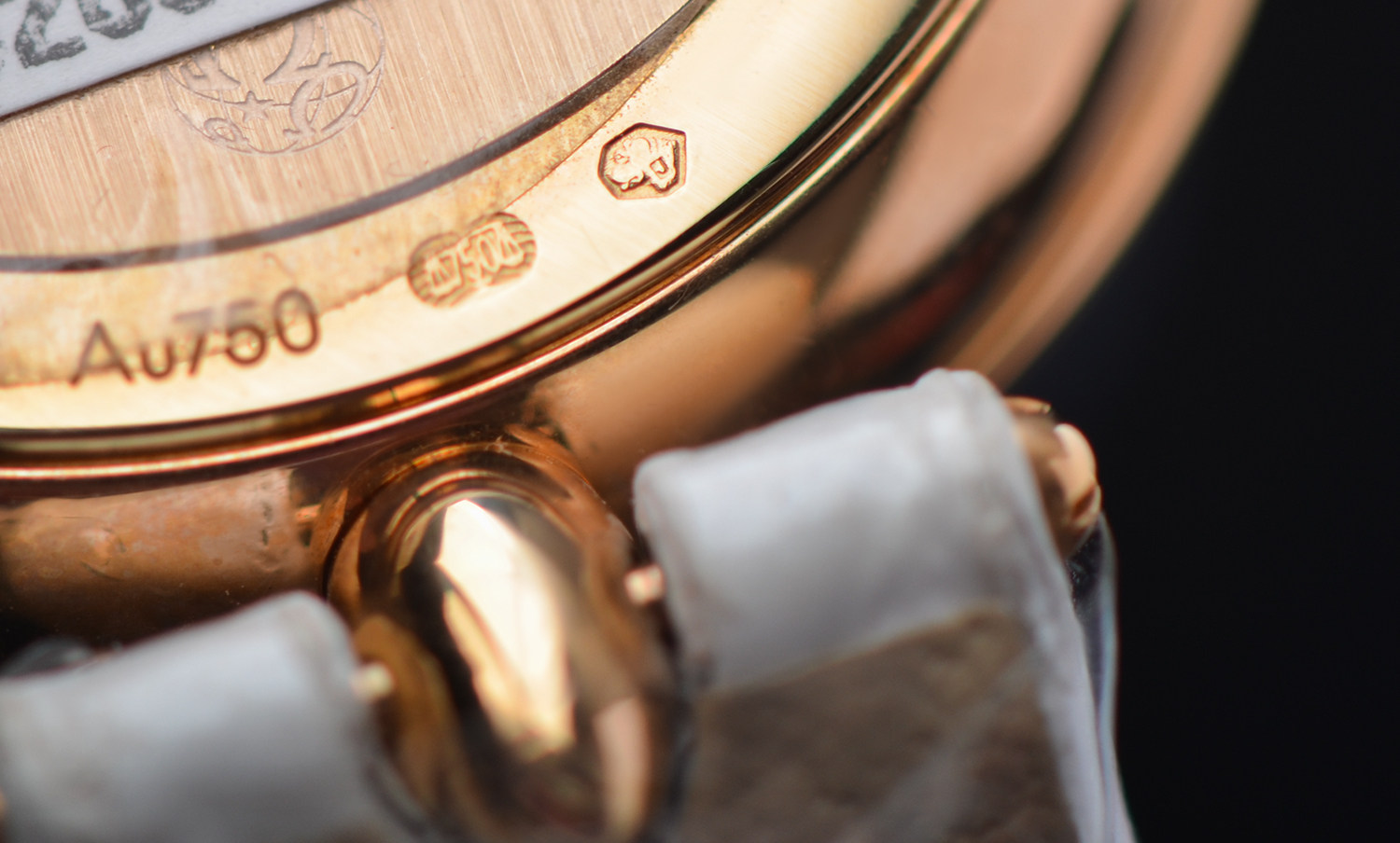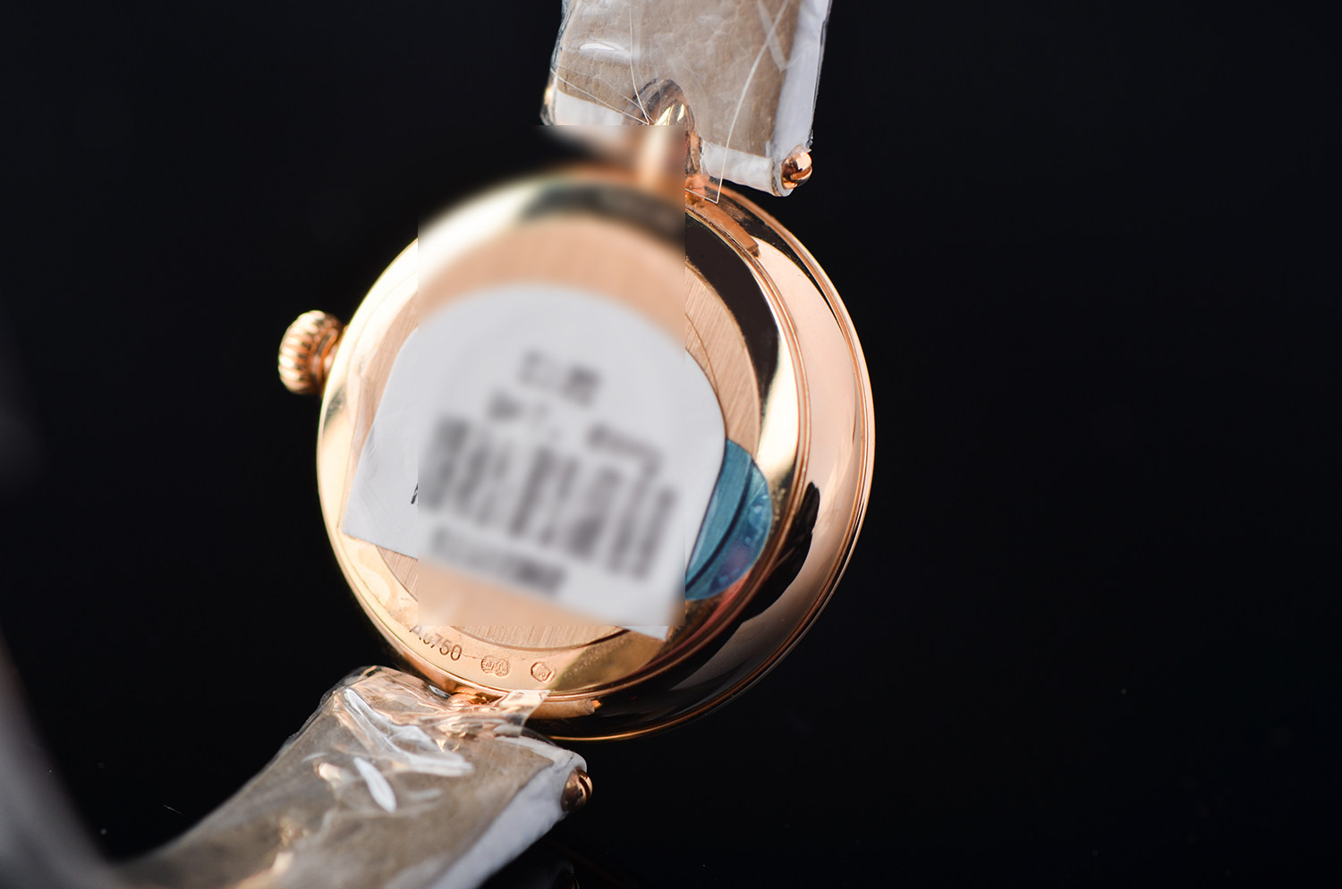 表盘:立体银白色珍珠贝母表盘,玫瑰金指针,8颗钻石时标共计约0.04克拉