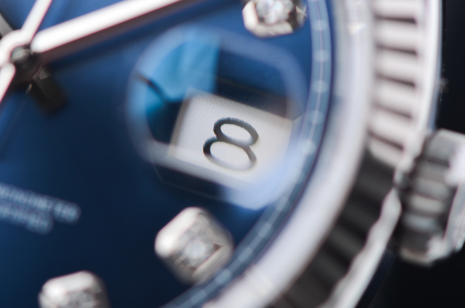 表盘:立体蓝色面盘,10颗钻石时标,白金指针,放大镜日历