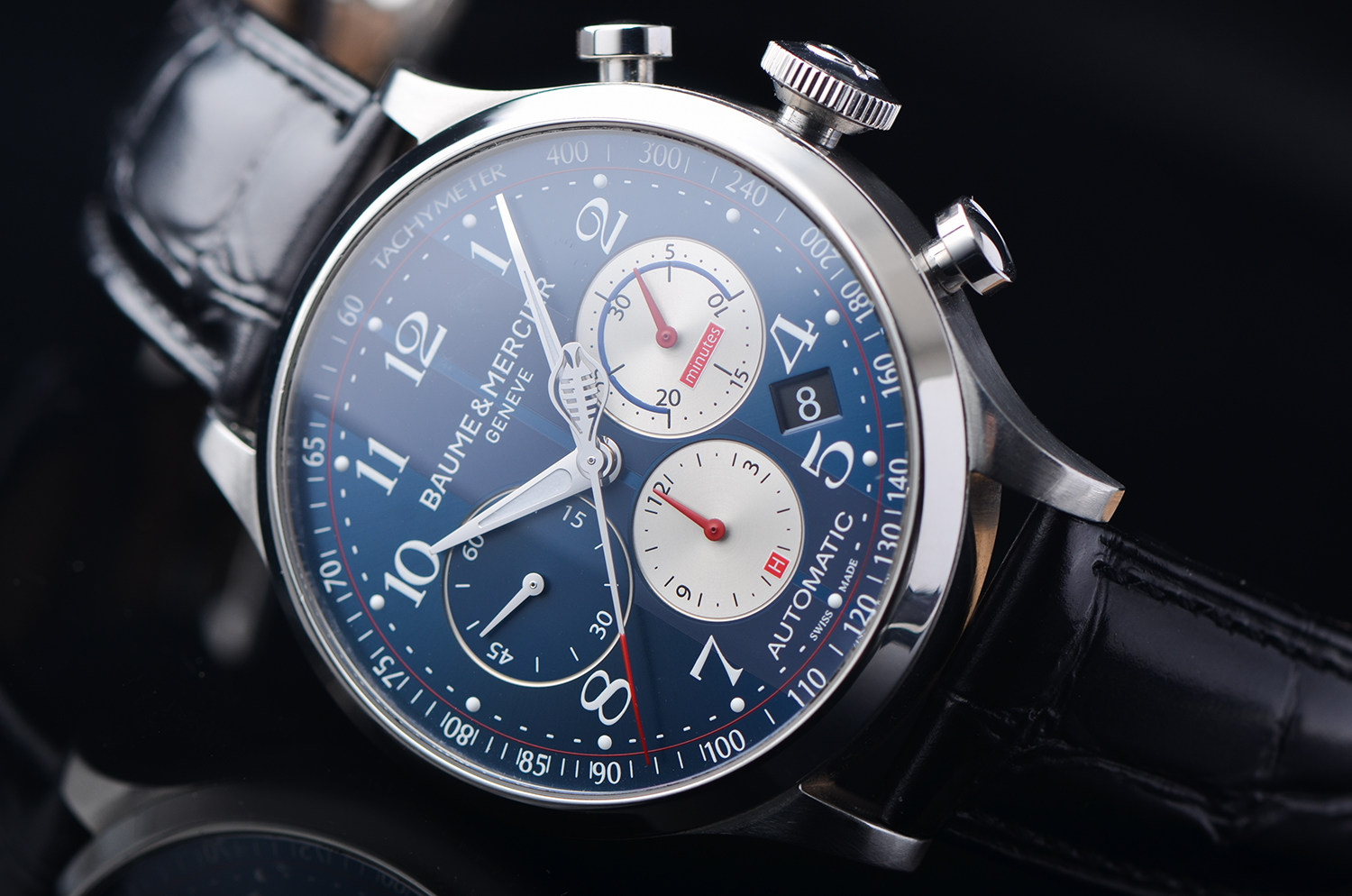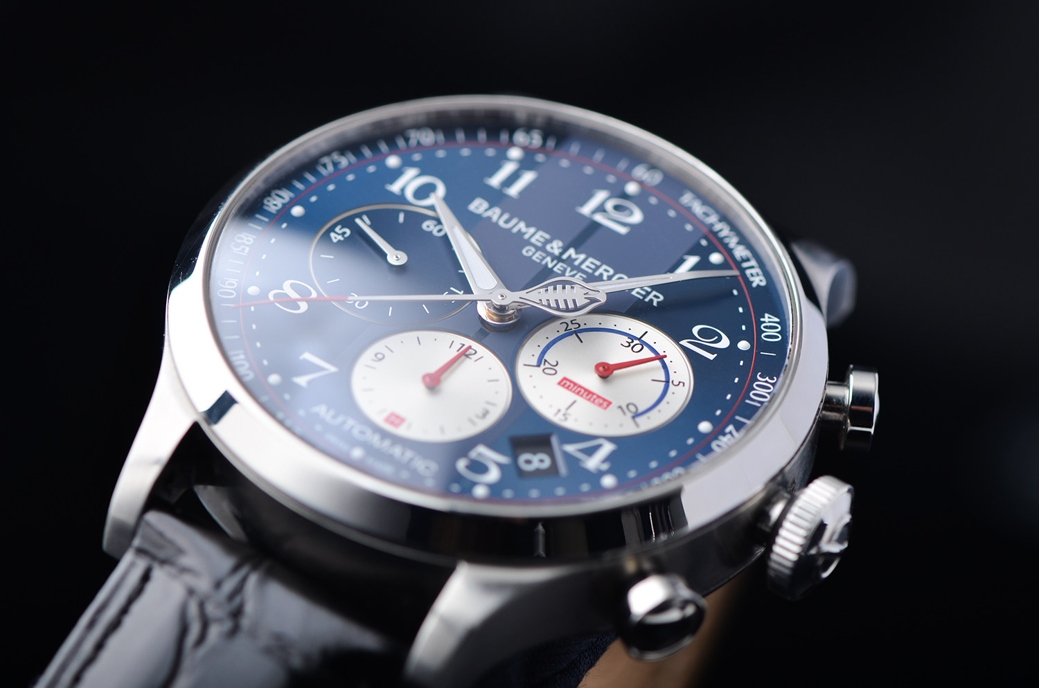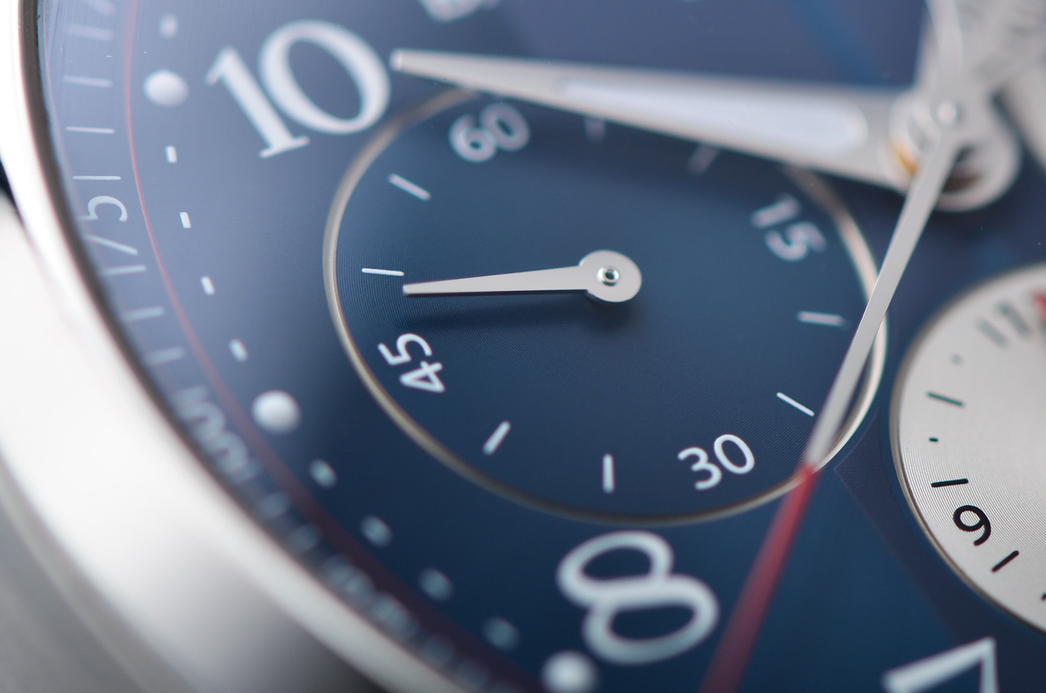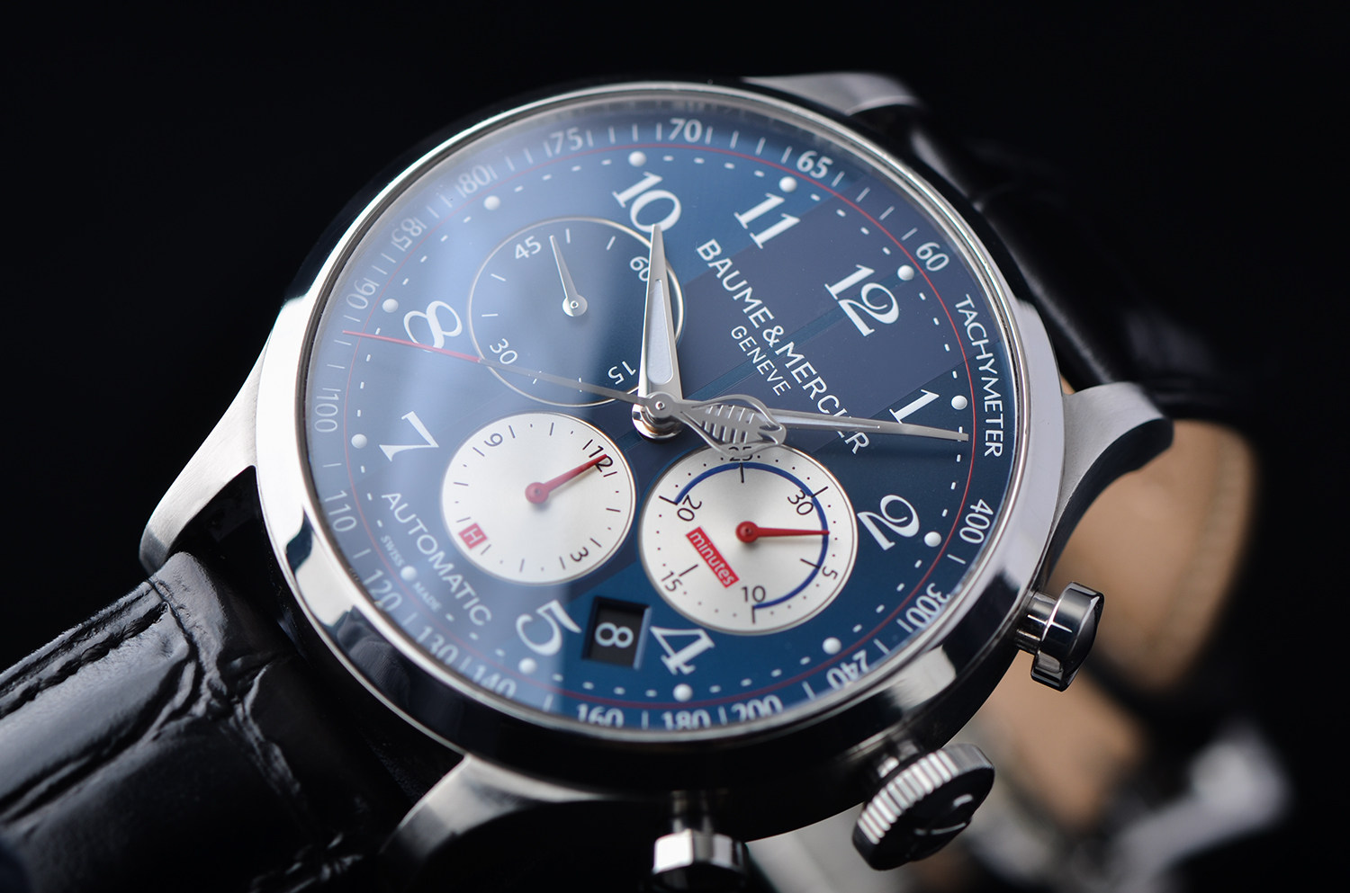 表盘:立体深蓝色计时表盘,测速计表内圈,阿拉伯数字刻度,夜光时分针,日历显示