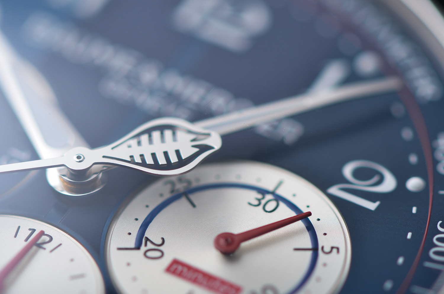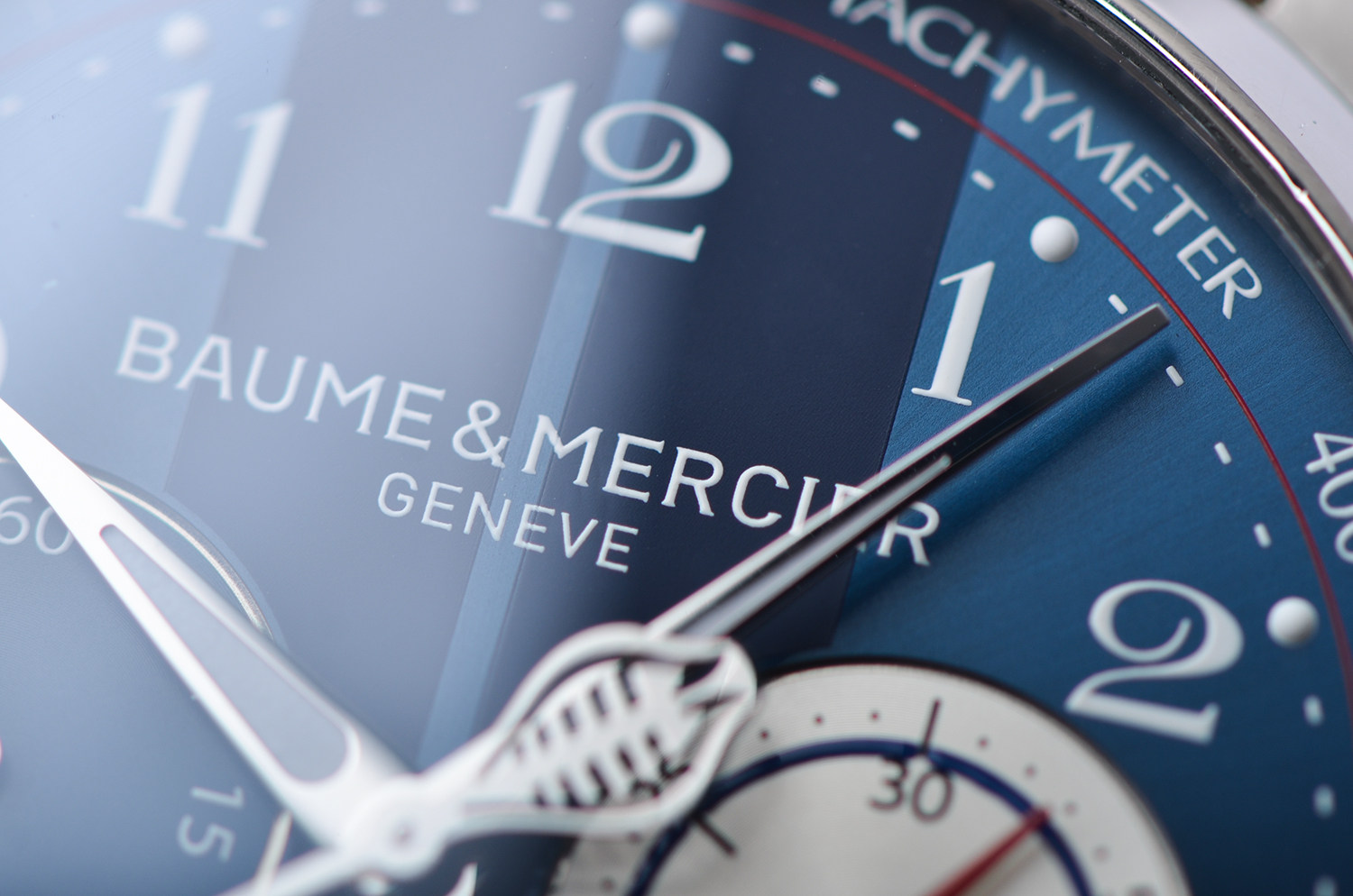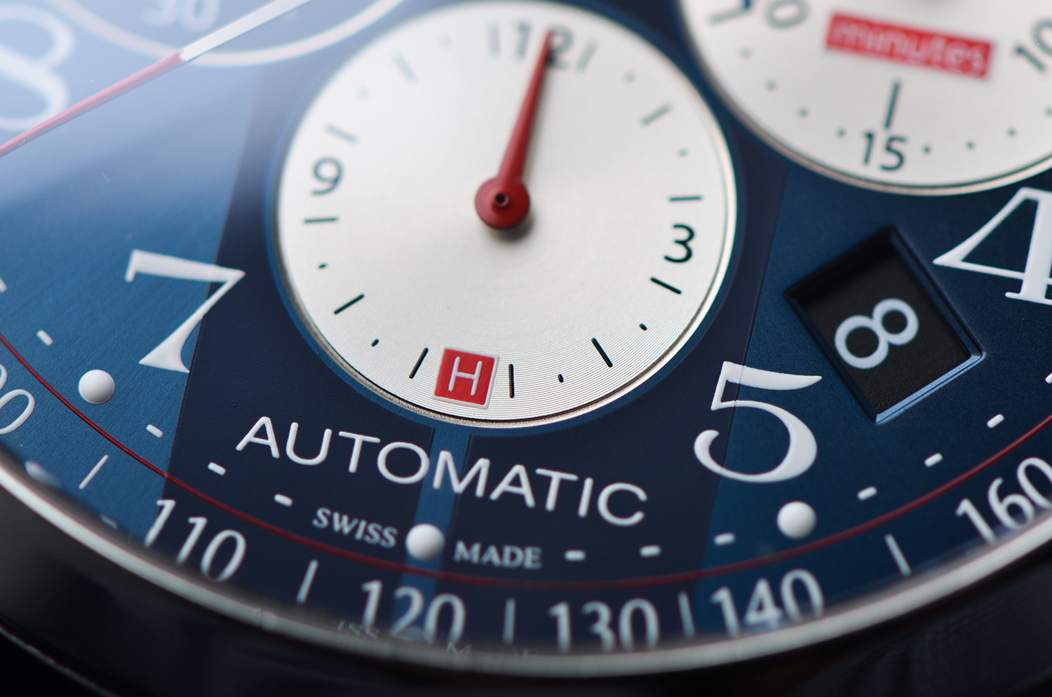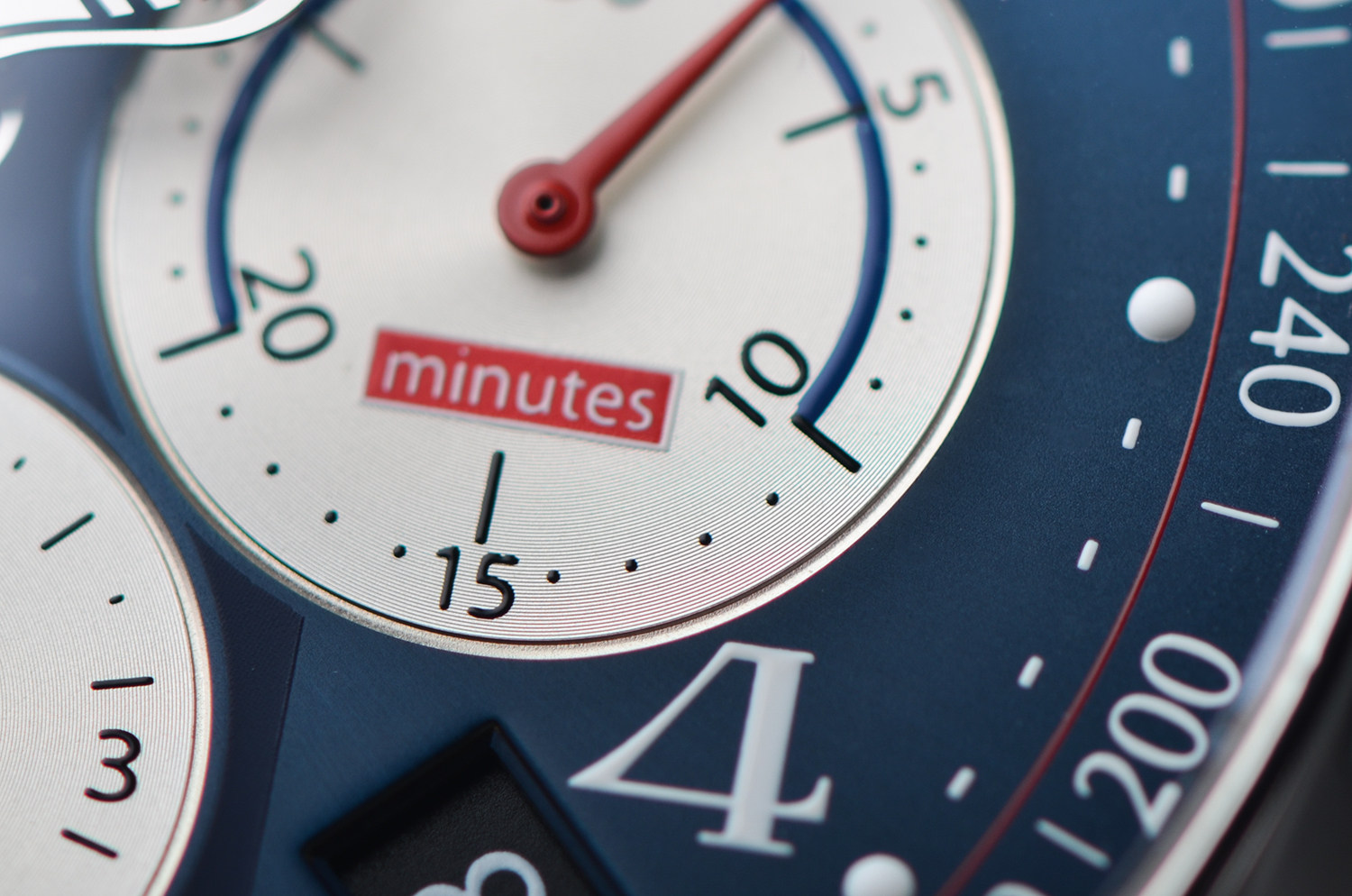 表盘:立体深蓝色计时表盘,测速计表内圈,阿拉伯数字刻度,夜光时分针,日历显示