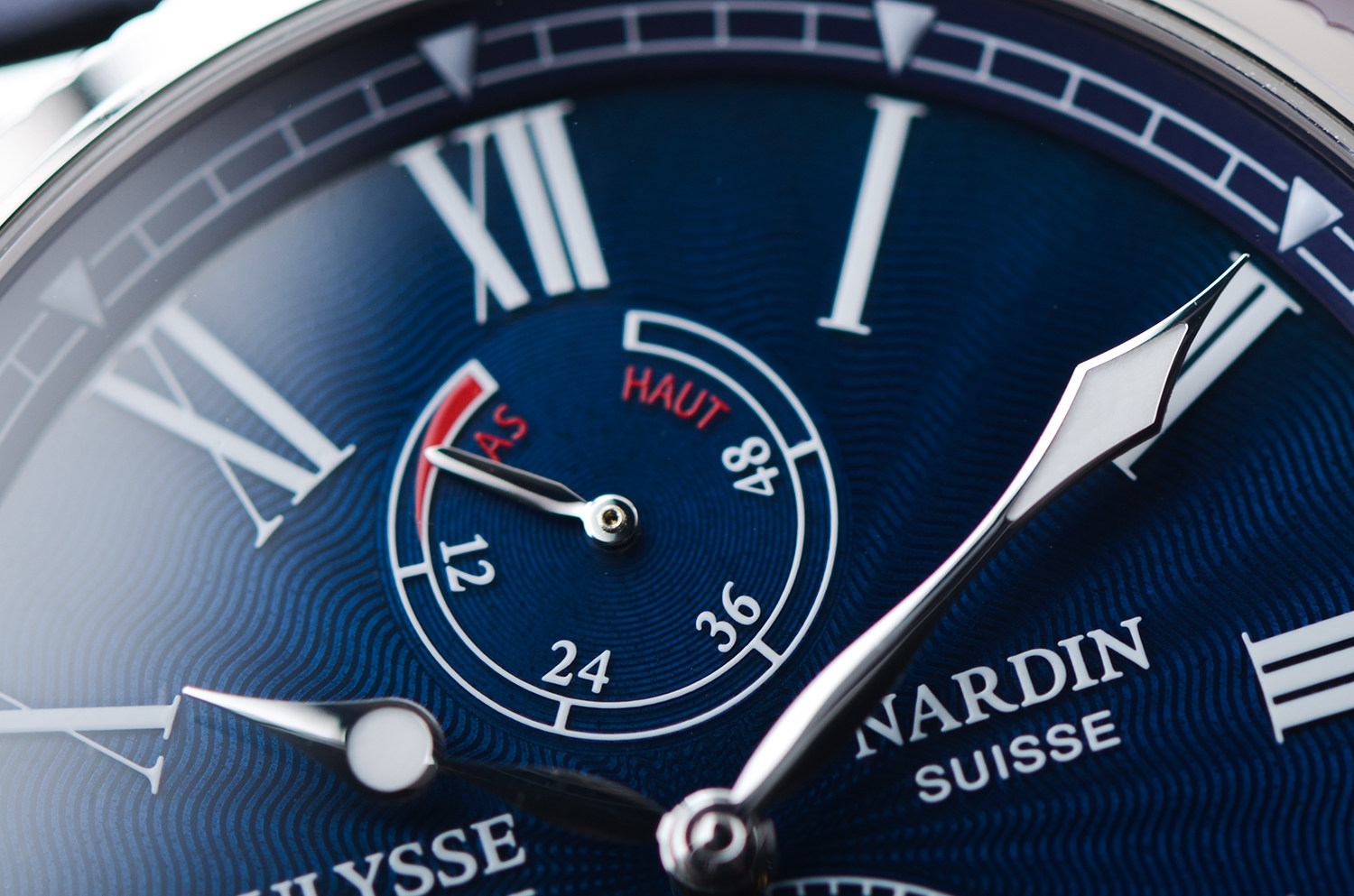 表盘:立体蓝色大明火珐琅表盘,罗马数字刻度,夜光时标及指针,动能储备显示,月份及日历显示