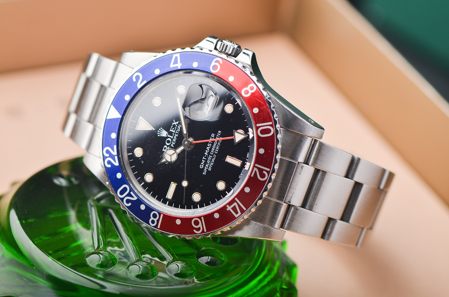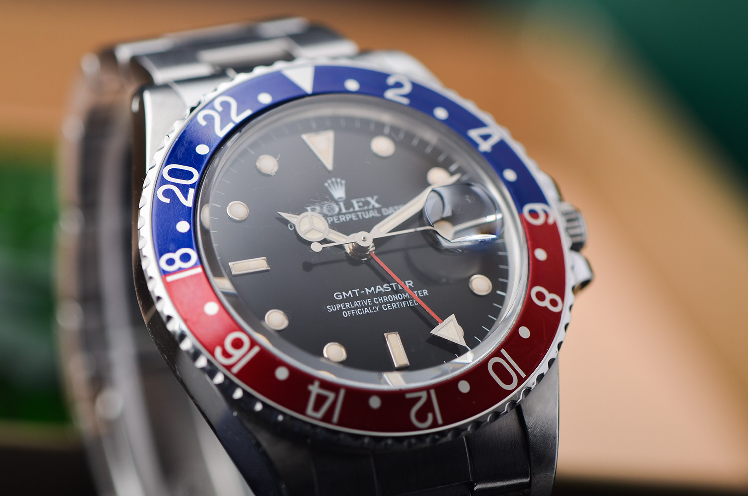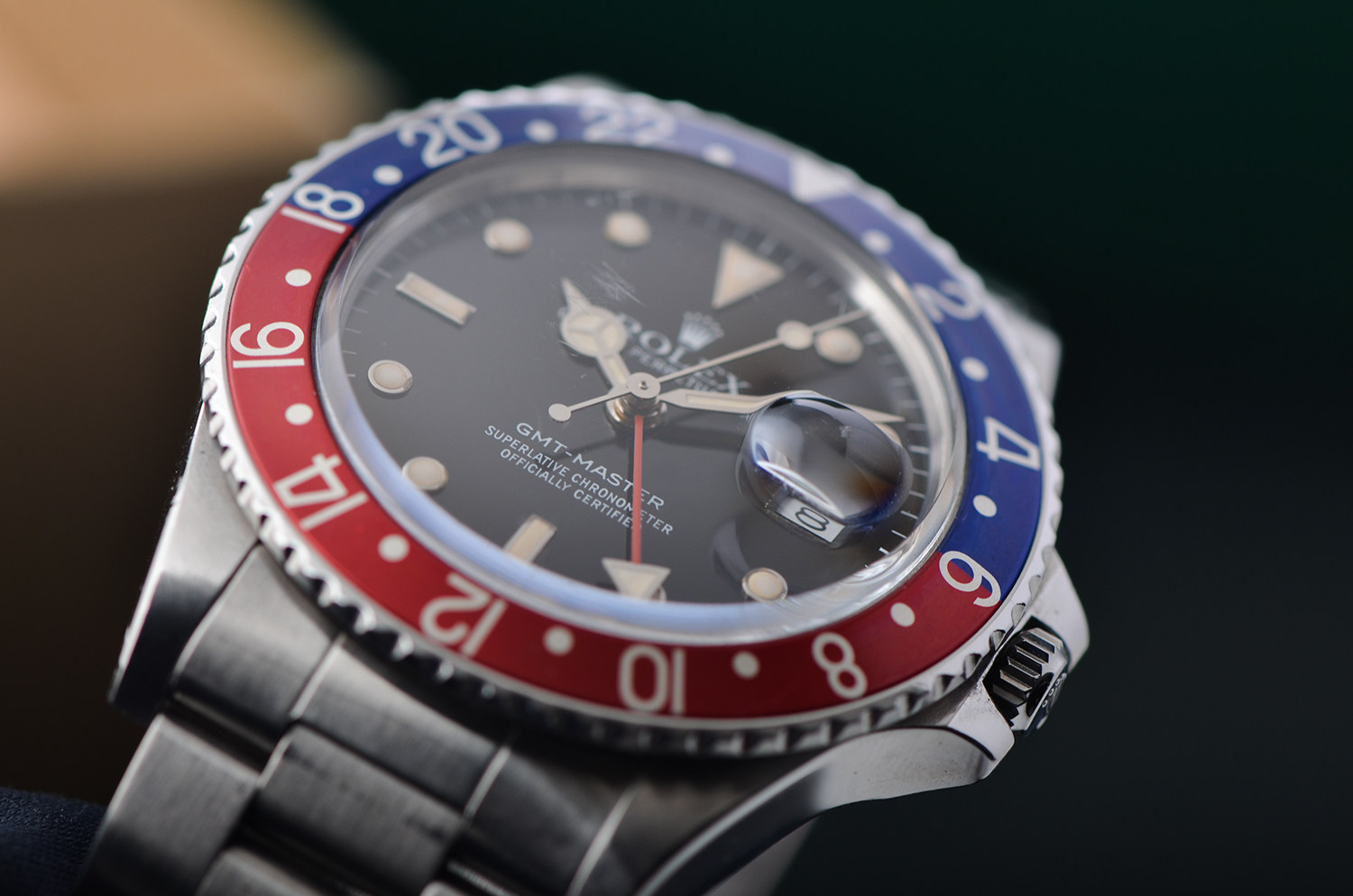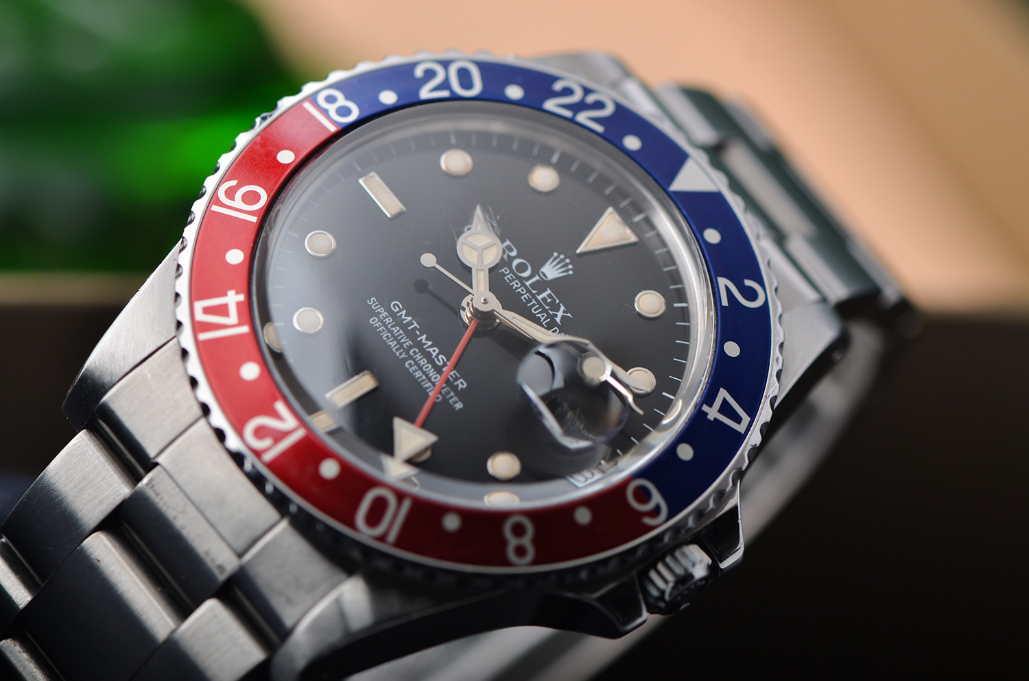 904L精鋼錶殼及鏈帶,折疊扣。拱形塑膠鏡面(波波膠),原廠原裝原配红蓝百事可樂圈成色極嘉,立體黑色盤,承接了1675的T25錶盤,夜光,指針已天然變黃,旋入式防水表冠。口徑39MM*13.5MM。防水100M。