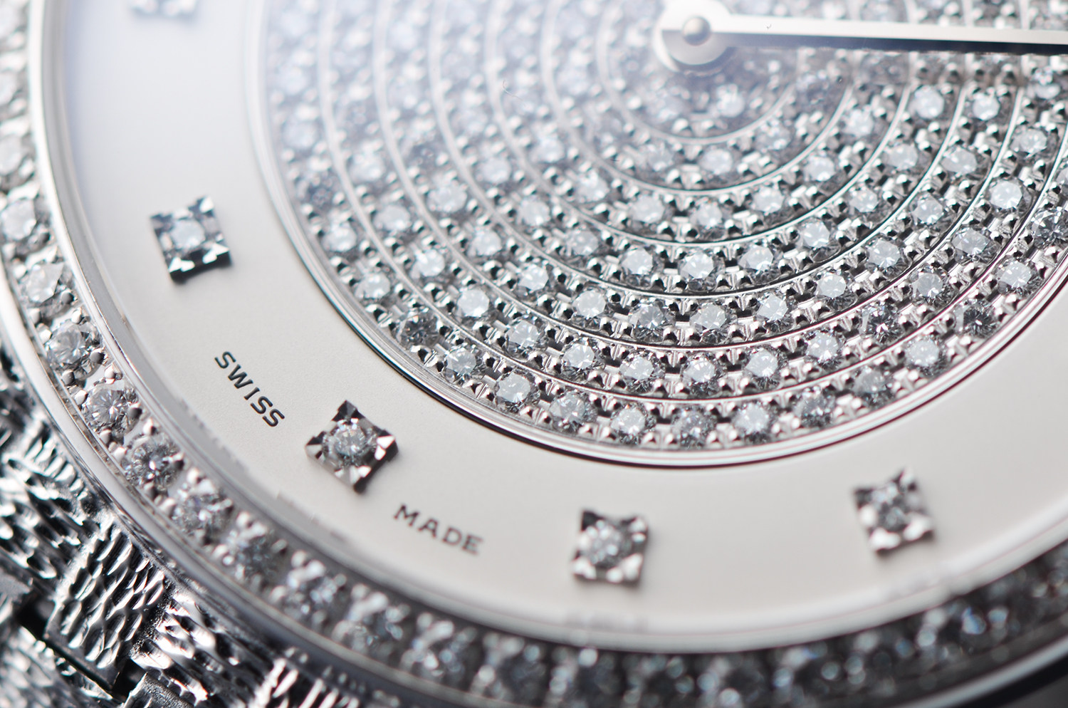 表盘:立体白色镶钻表盘,白金指针,12颗钻石时标,表盘表框共计镶嵌244颗钻石,约1.76克拉