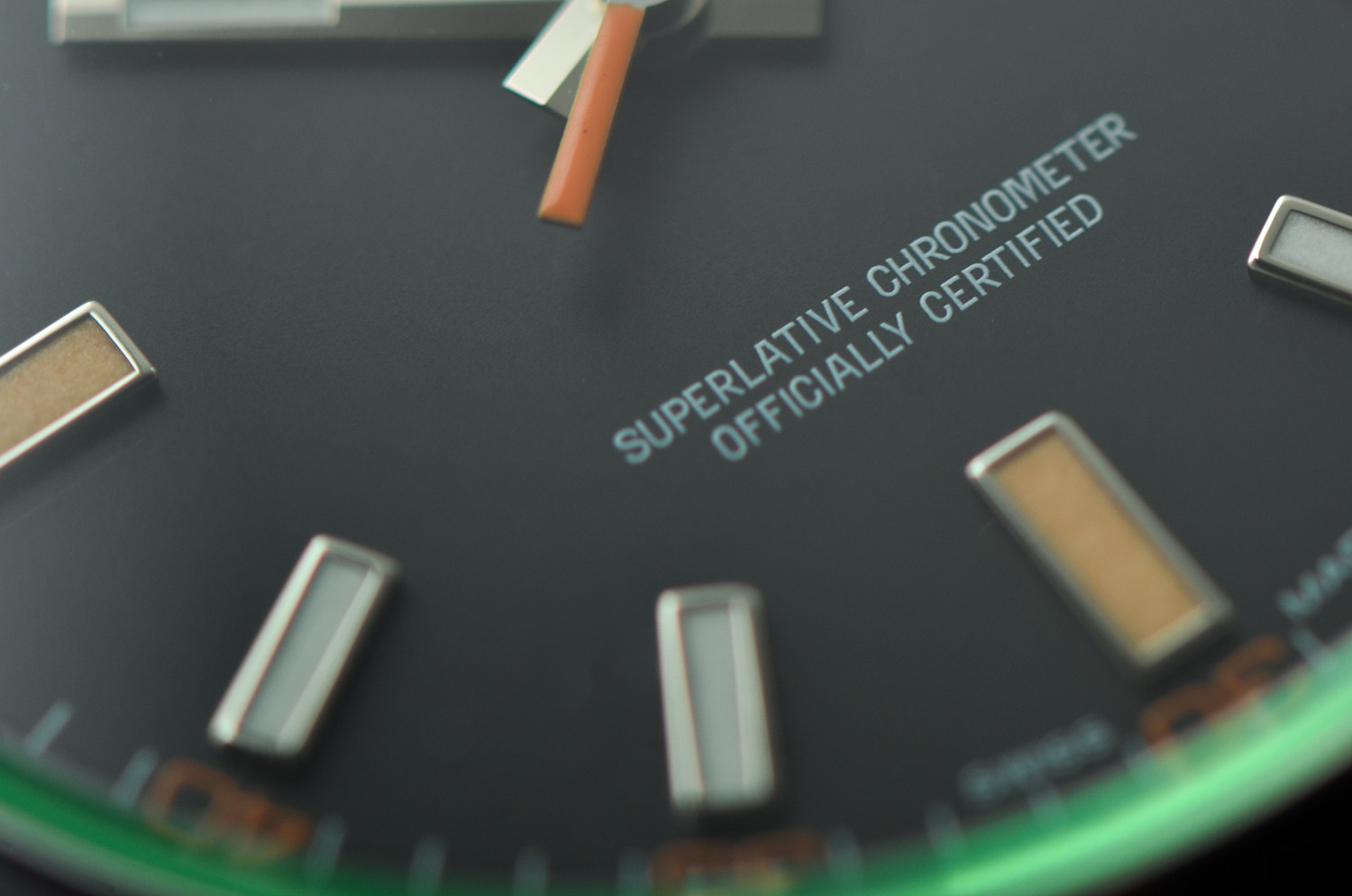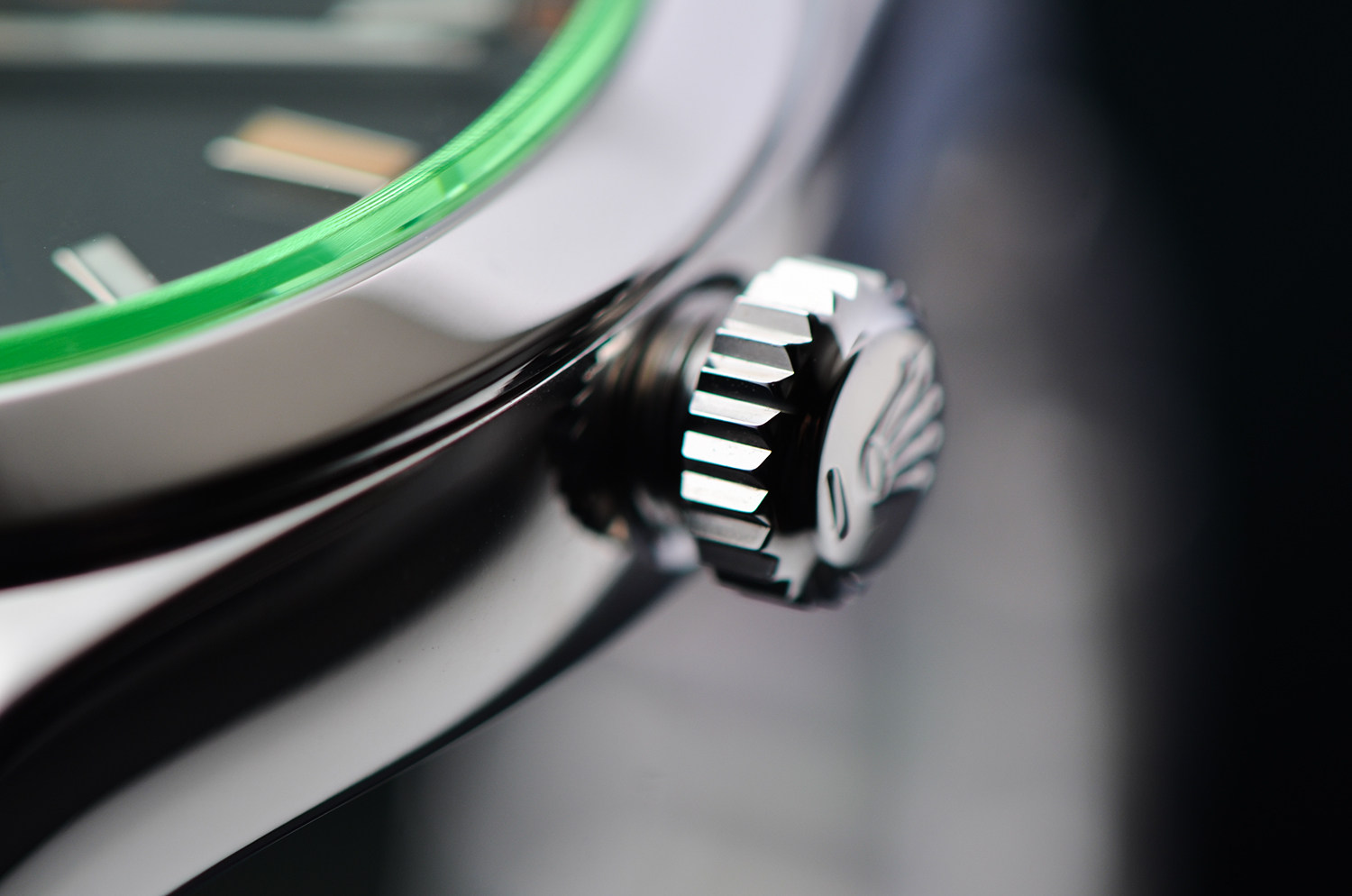 从侧面看,玻璃边缘泛出迷人的绿色光晕,辨识度极高,其他任何劳力士都无法复制。