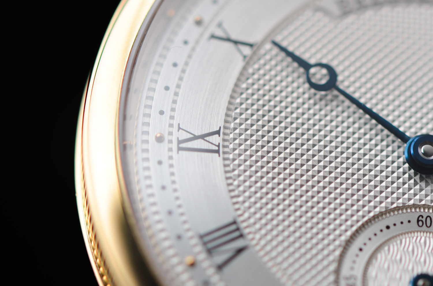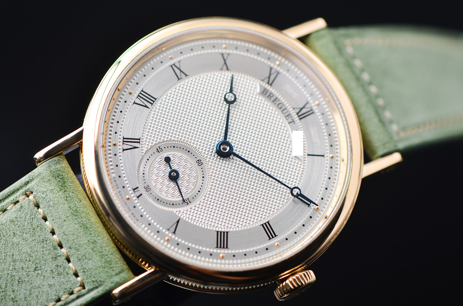 18K 黄金表壳,经典宝玑钱币纹表圈,线条柔和而克制;