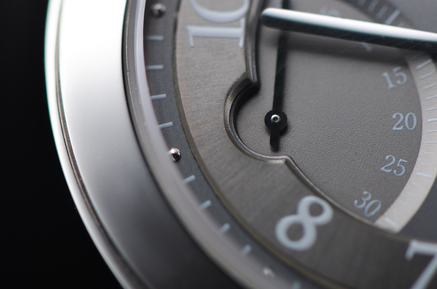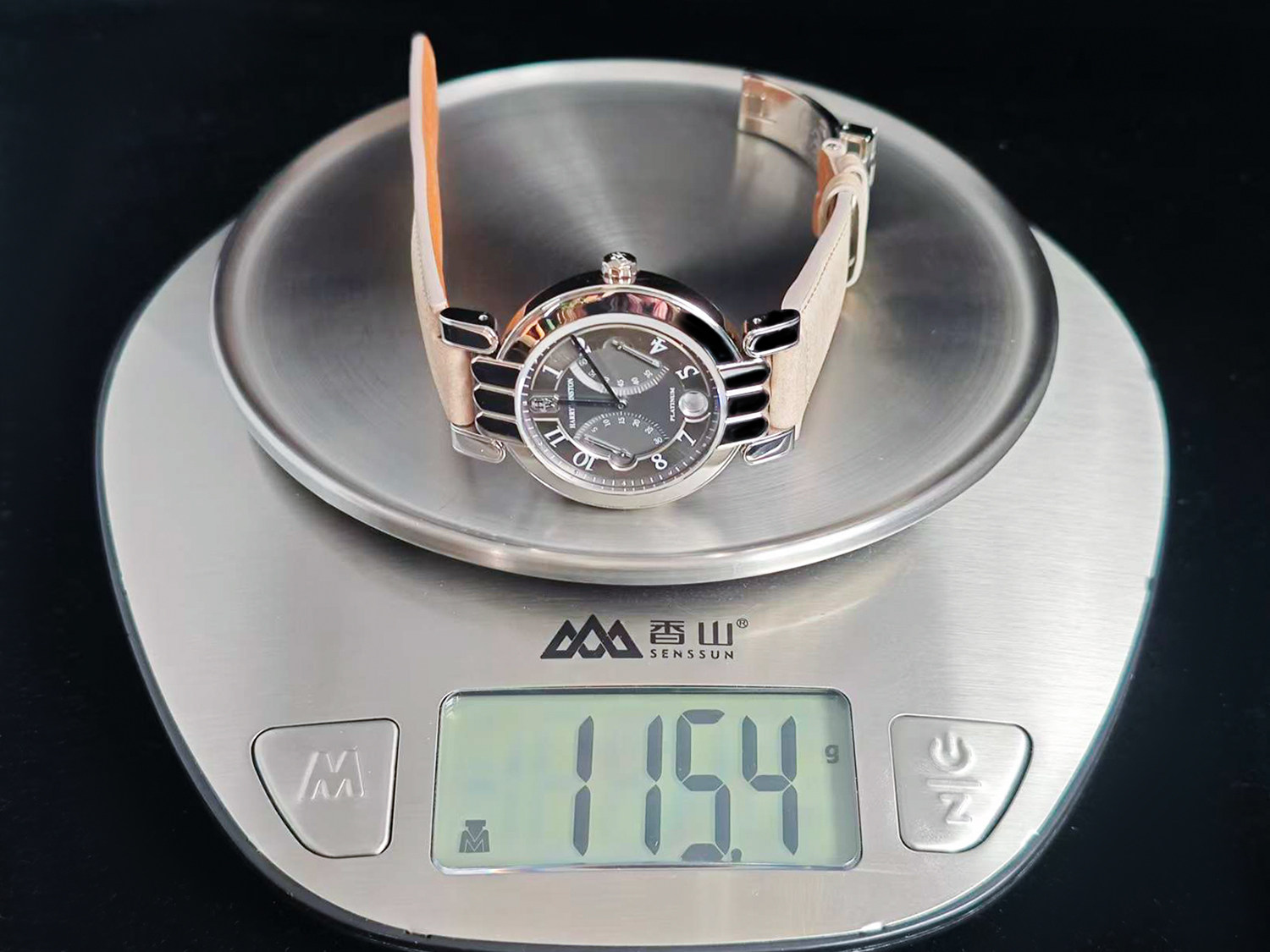 表盘:立体灰色表盘,白金指针,阿拉伯数字刻度,放大镜日历,两段式飞返秒针