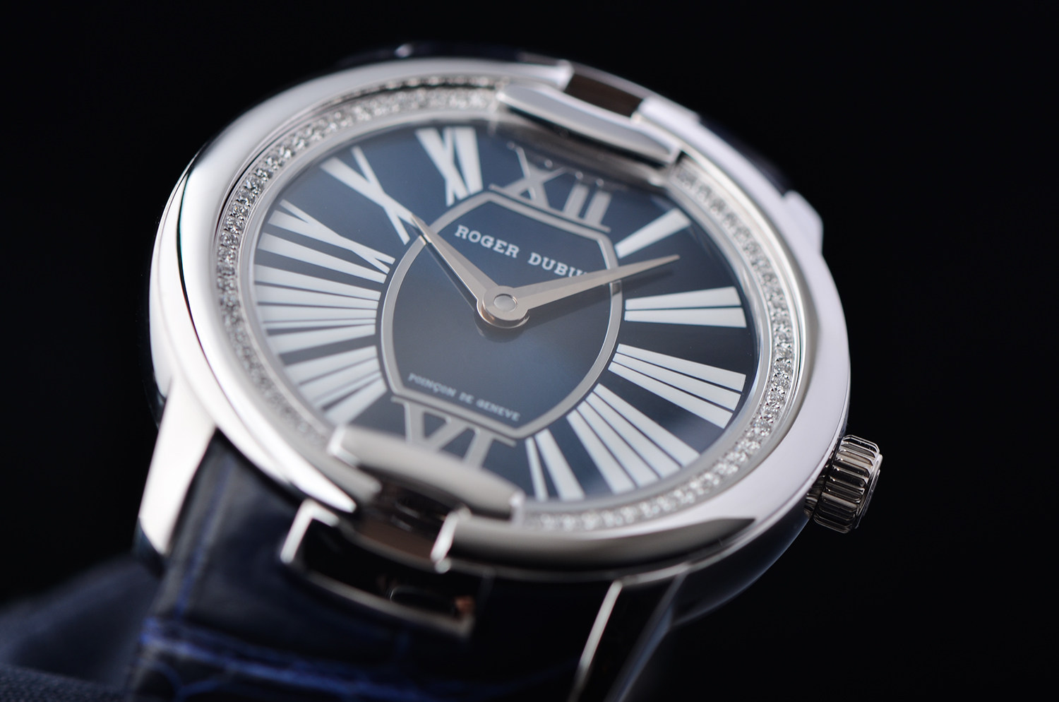 表盘:立体深蓝色表盘,罗马数字刻度,白金指针