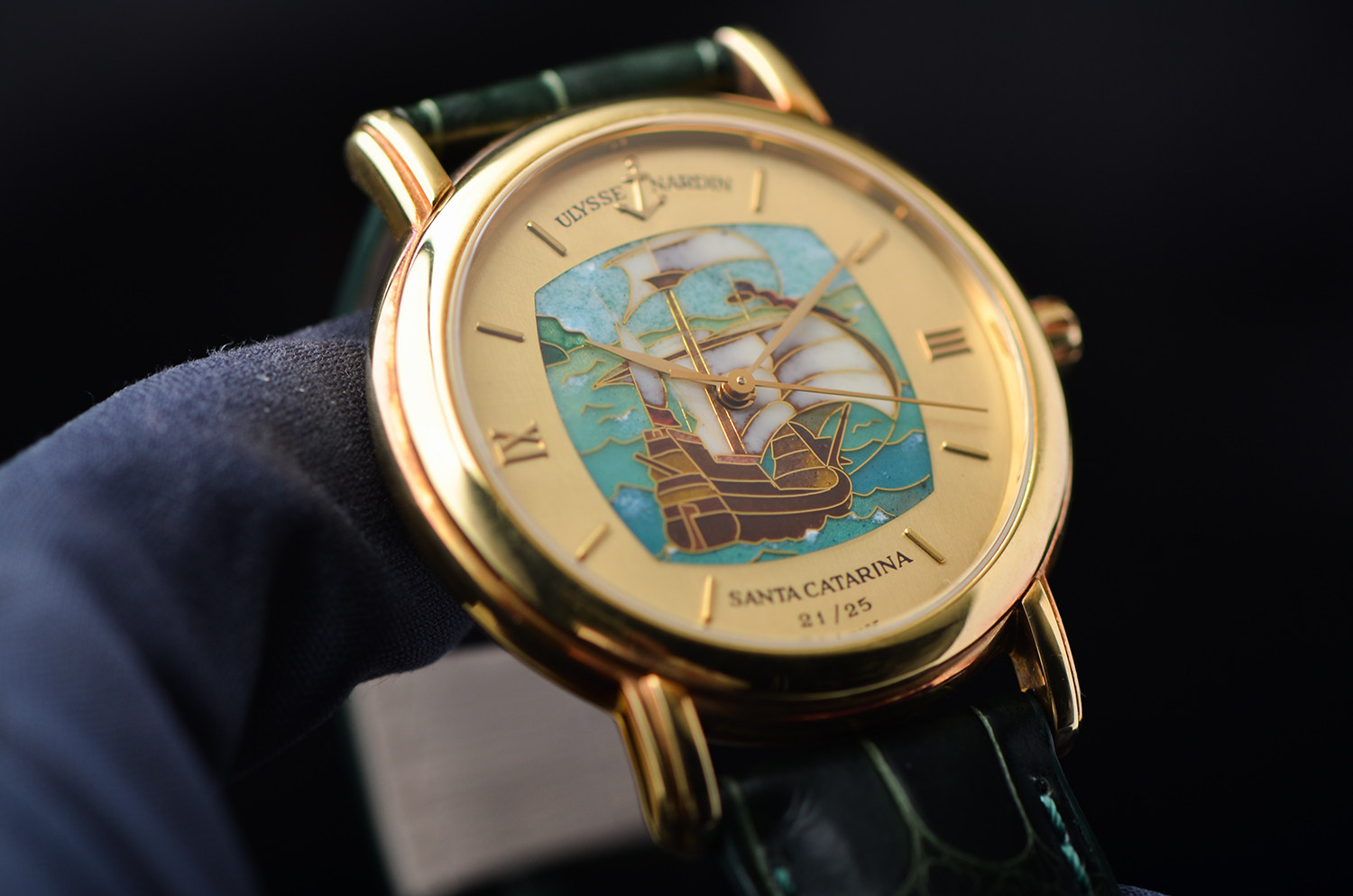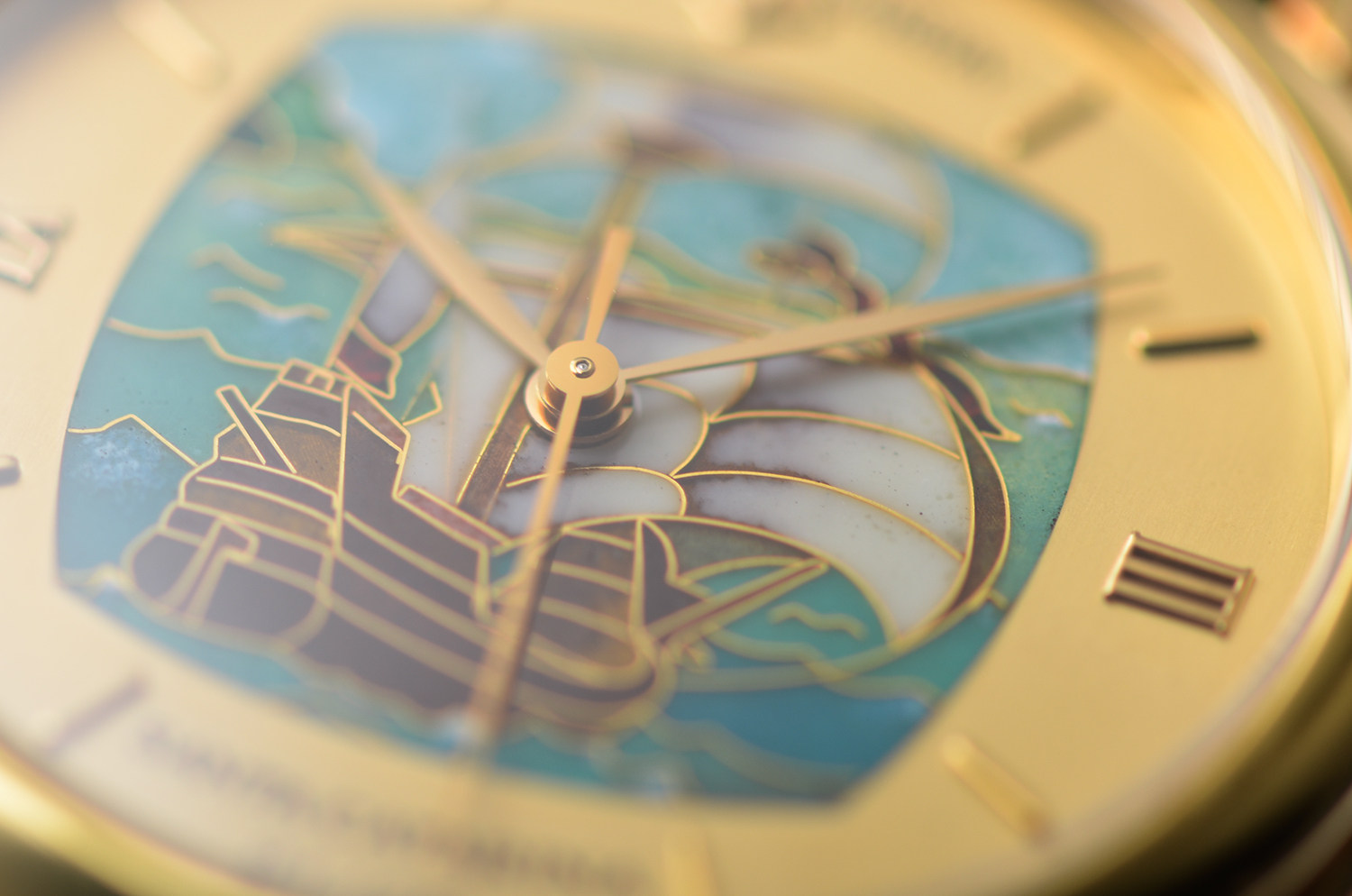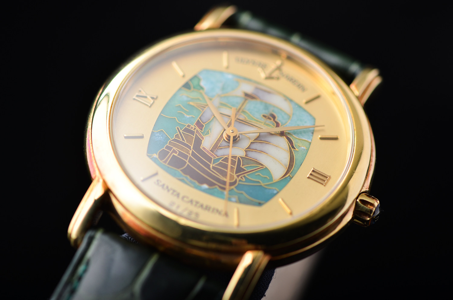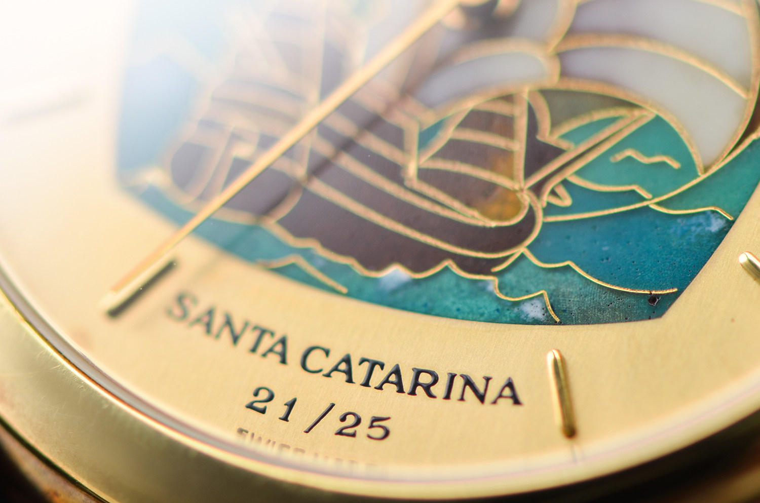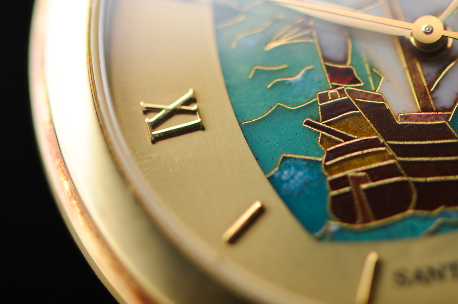 表盘: 圣卡塔琳娜号帆船掐丝珐琅面盘,黄金刻度及指针