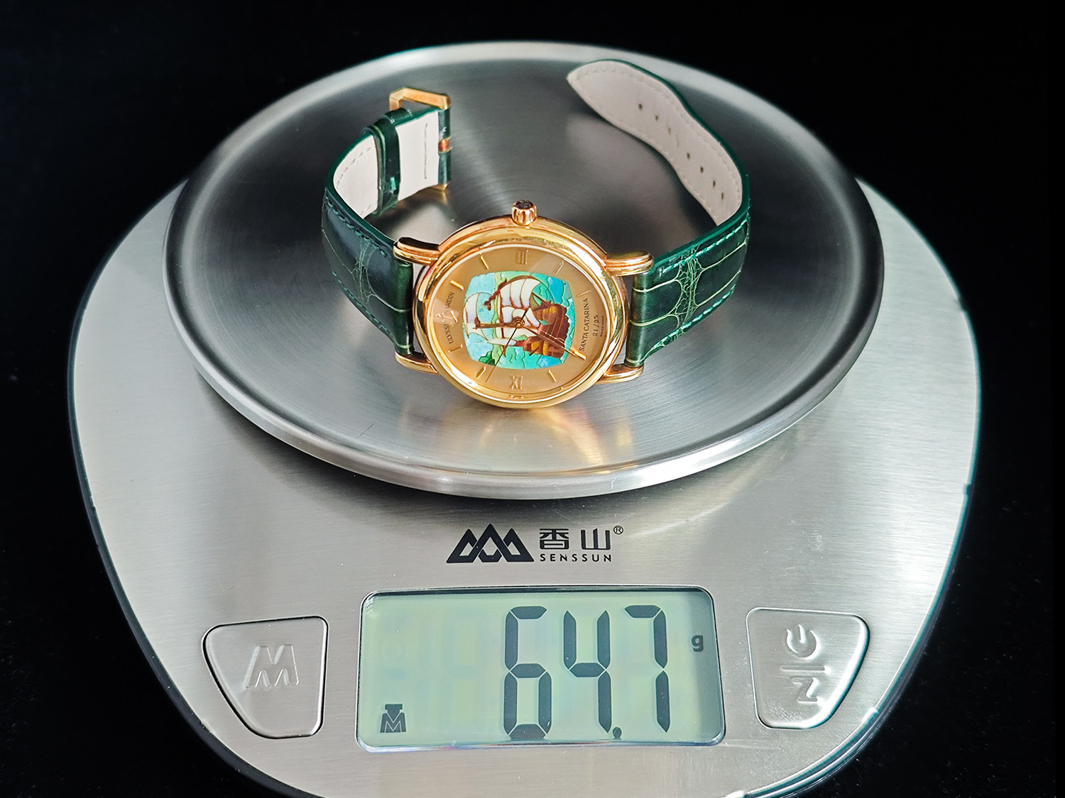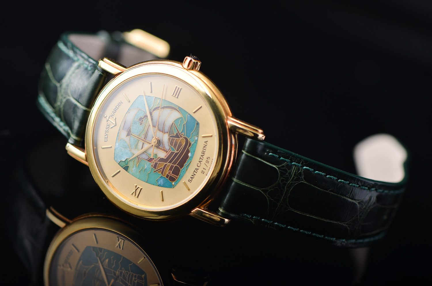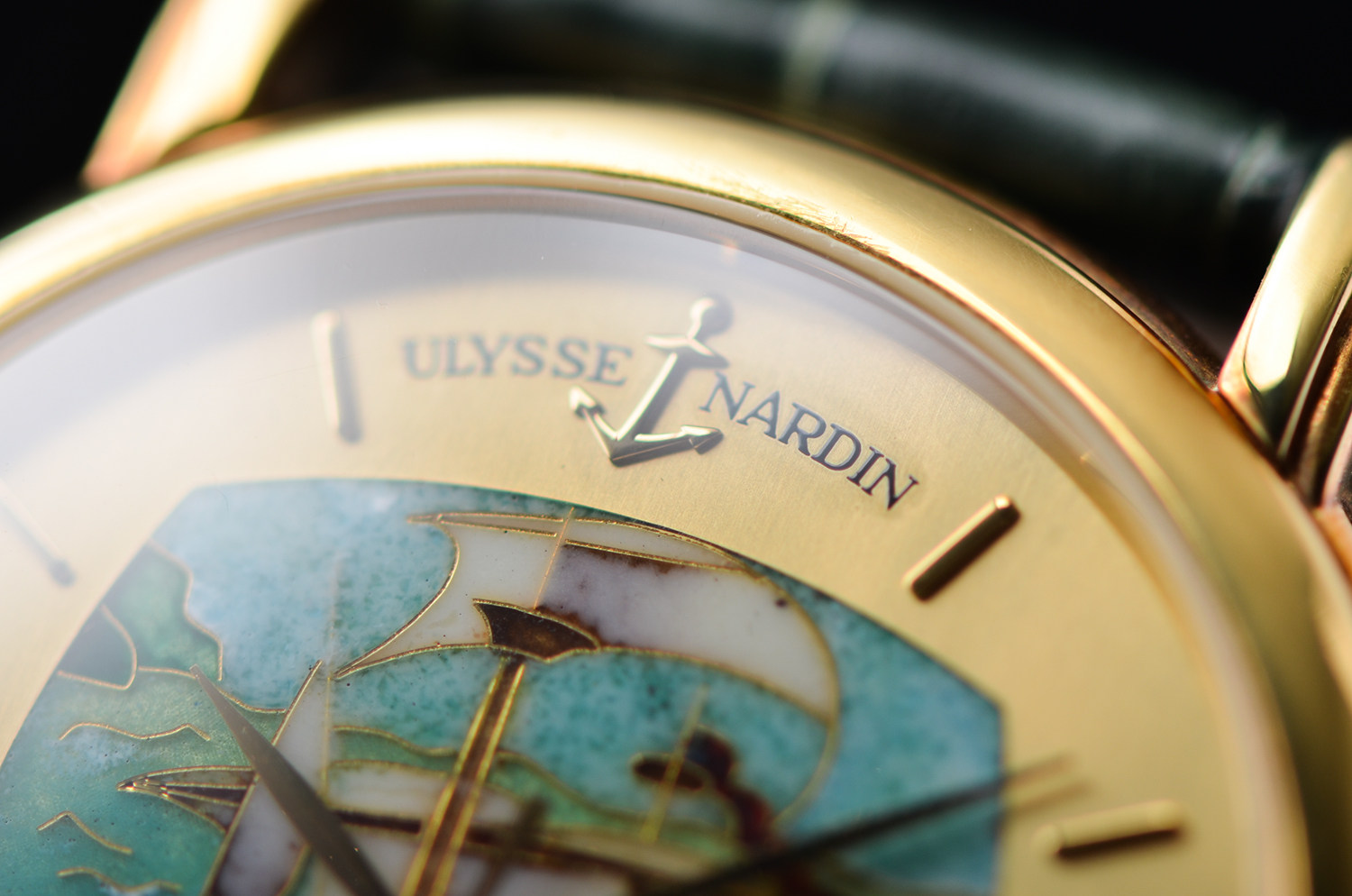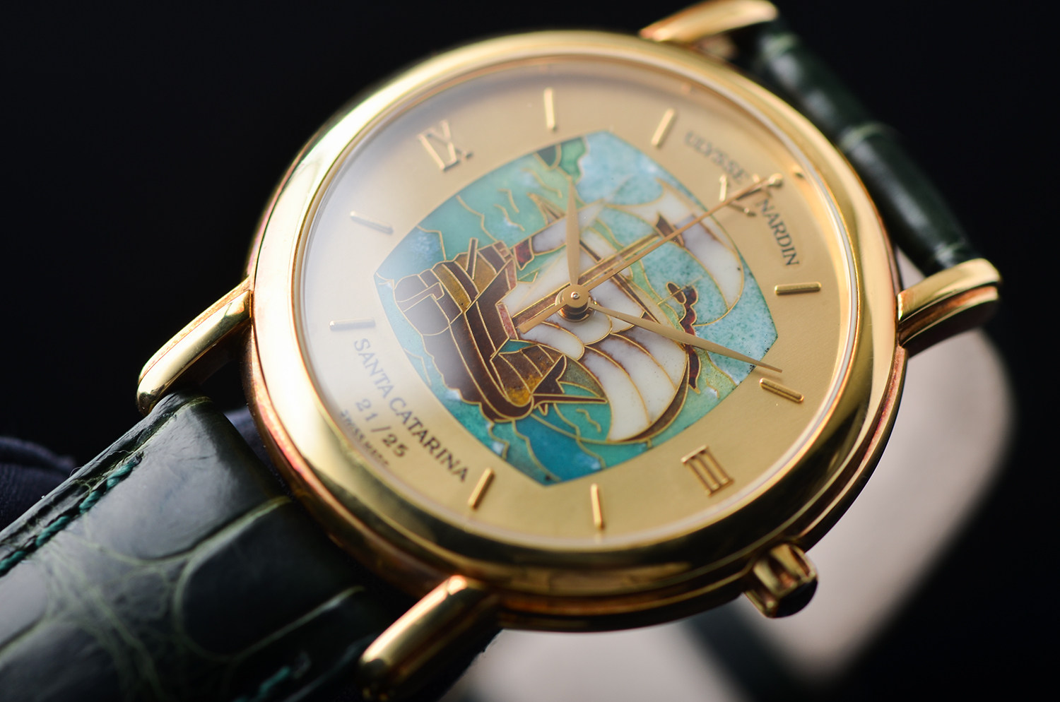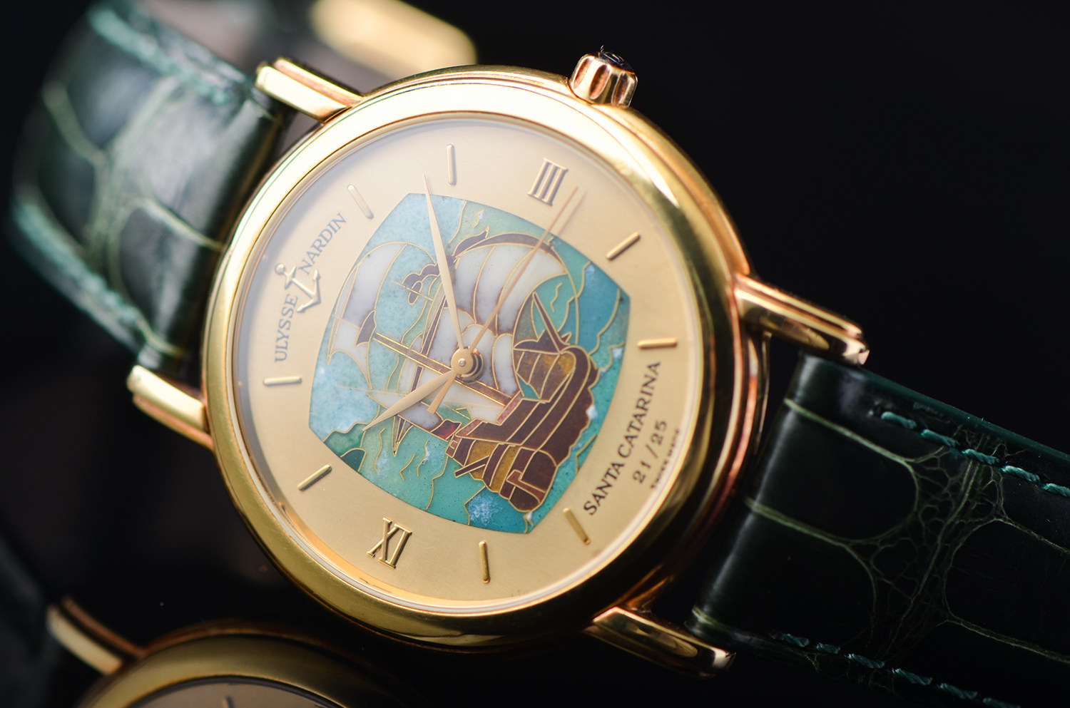 表盘: 圣卡塔琳娜号帆船掐丝珐琅面盘,黄金刻度及指针