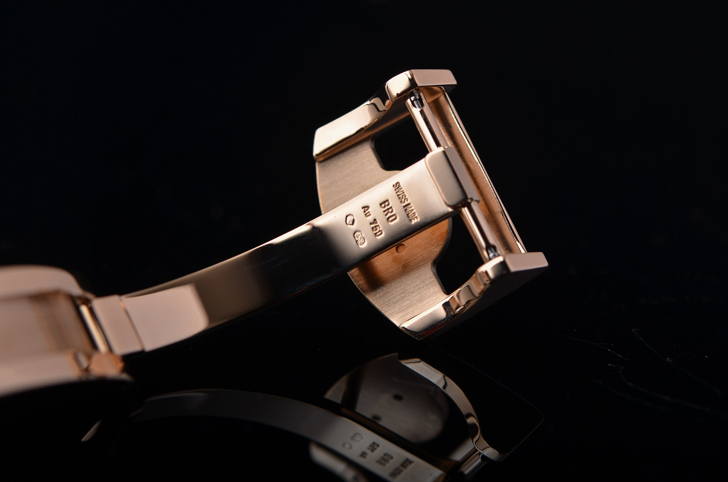 玫瑰金表壳的温润与黑盘的深邃形成鲜明对比,使这枚表在商务场合尤为出众。它不像运动表那样张扬,却在正式场合中拥有压倒性的气质。
