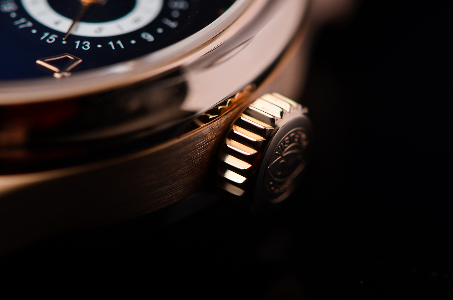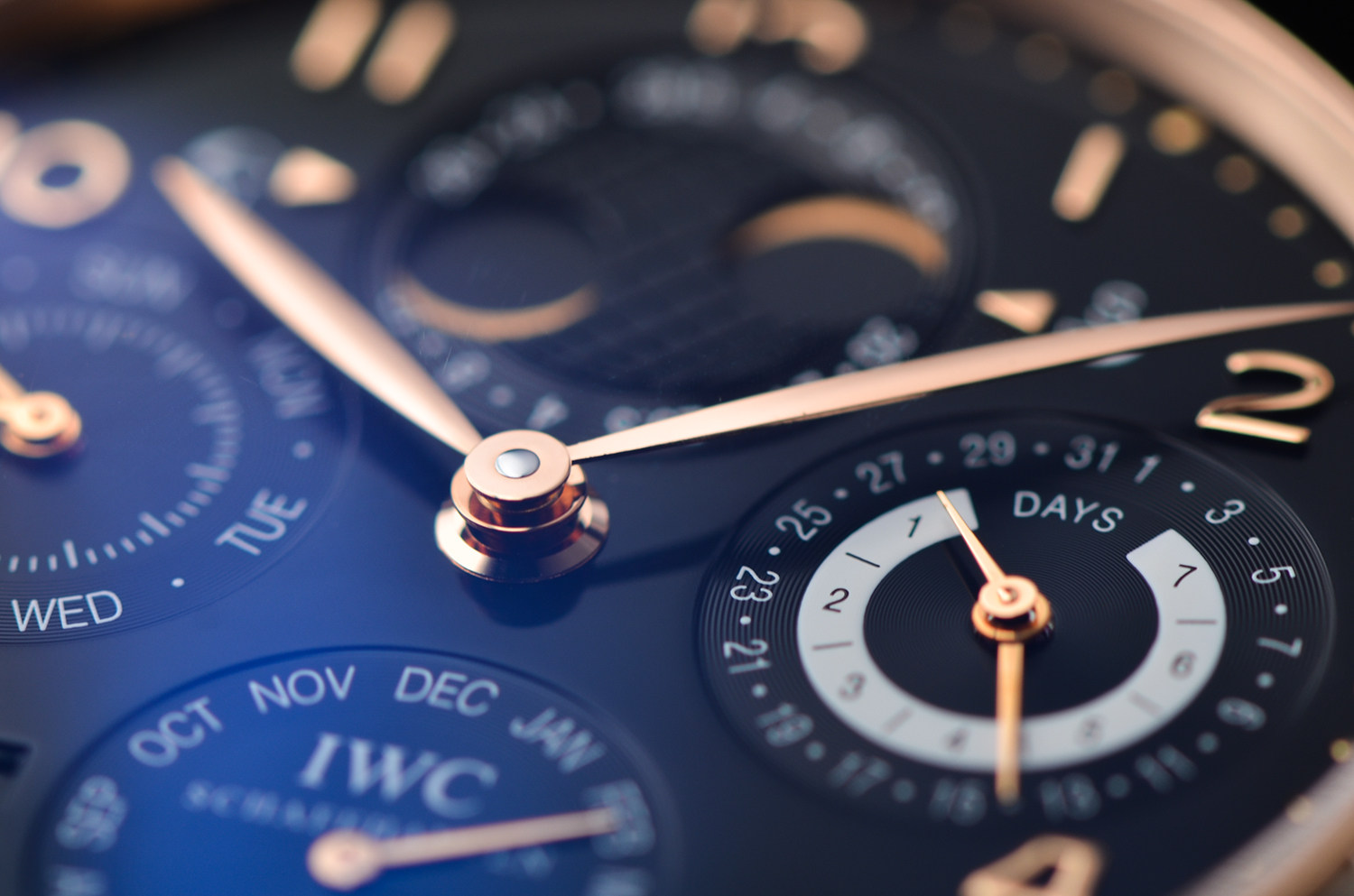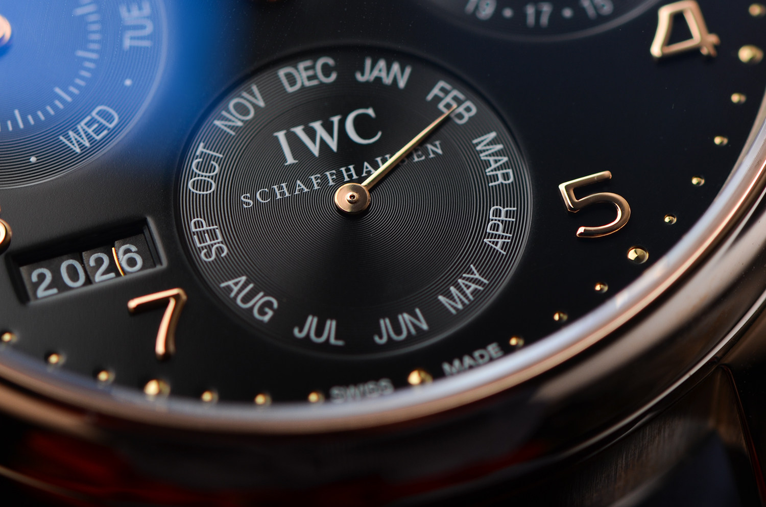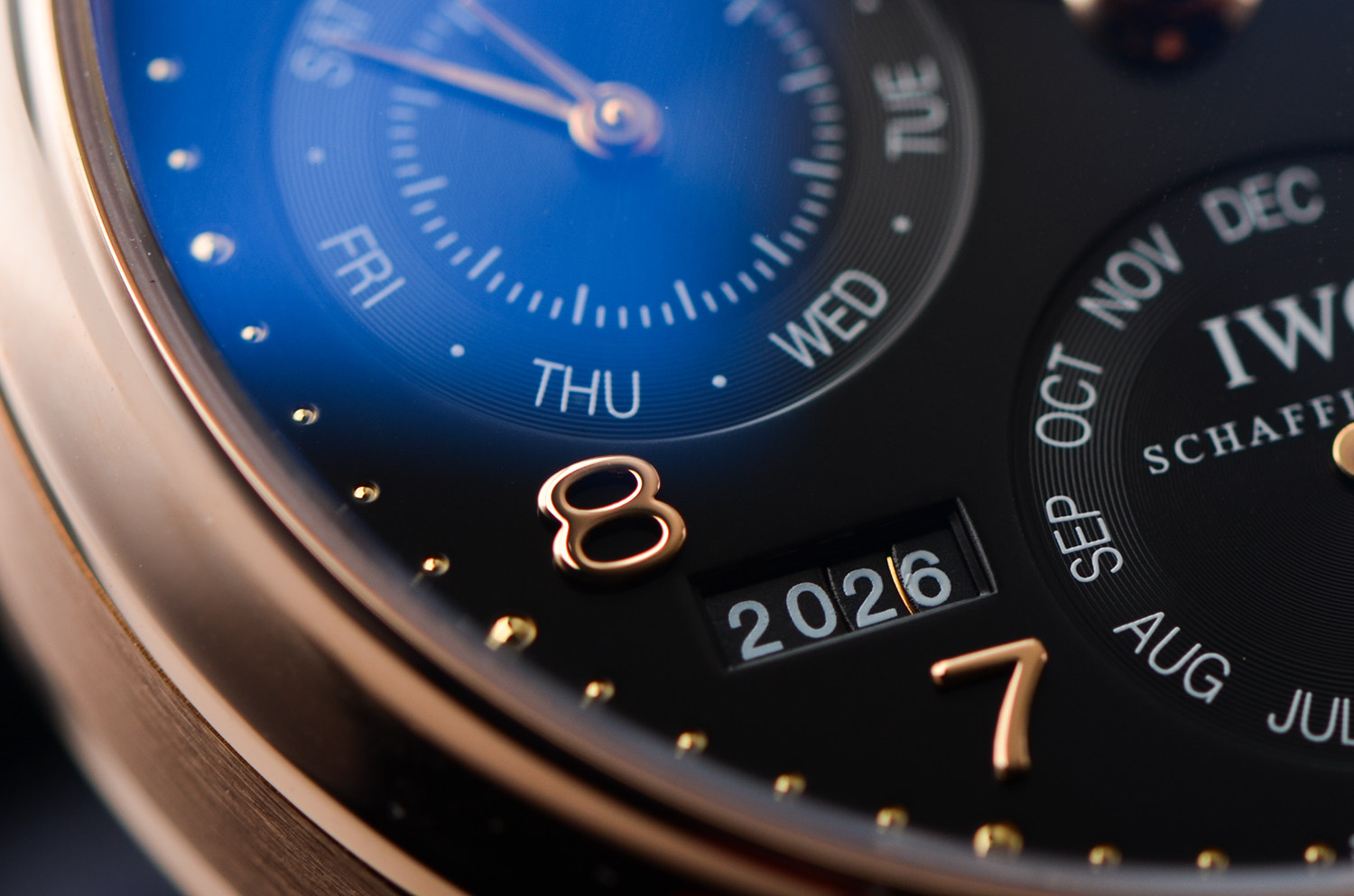 万国的万年历系统由传奇制表大师 Kurt Klaus 设计,其结构精妙之处在于——所有日历功能通过表冠即可同步调节。复杂,却极易操作,这是工程思维的胜利。