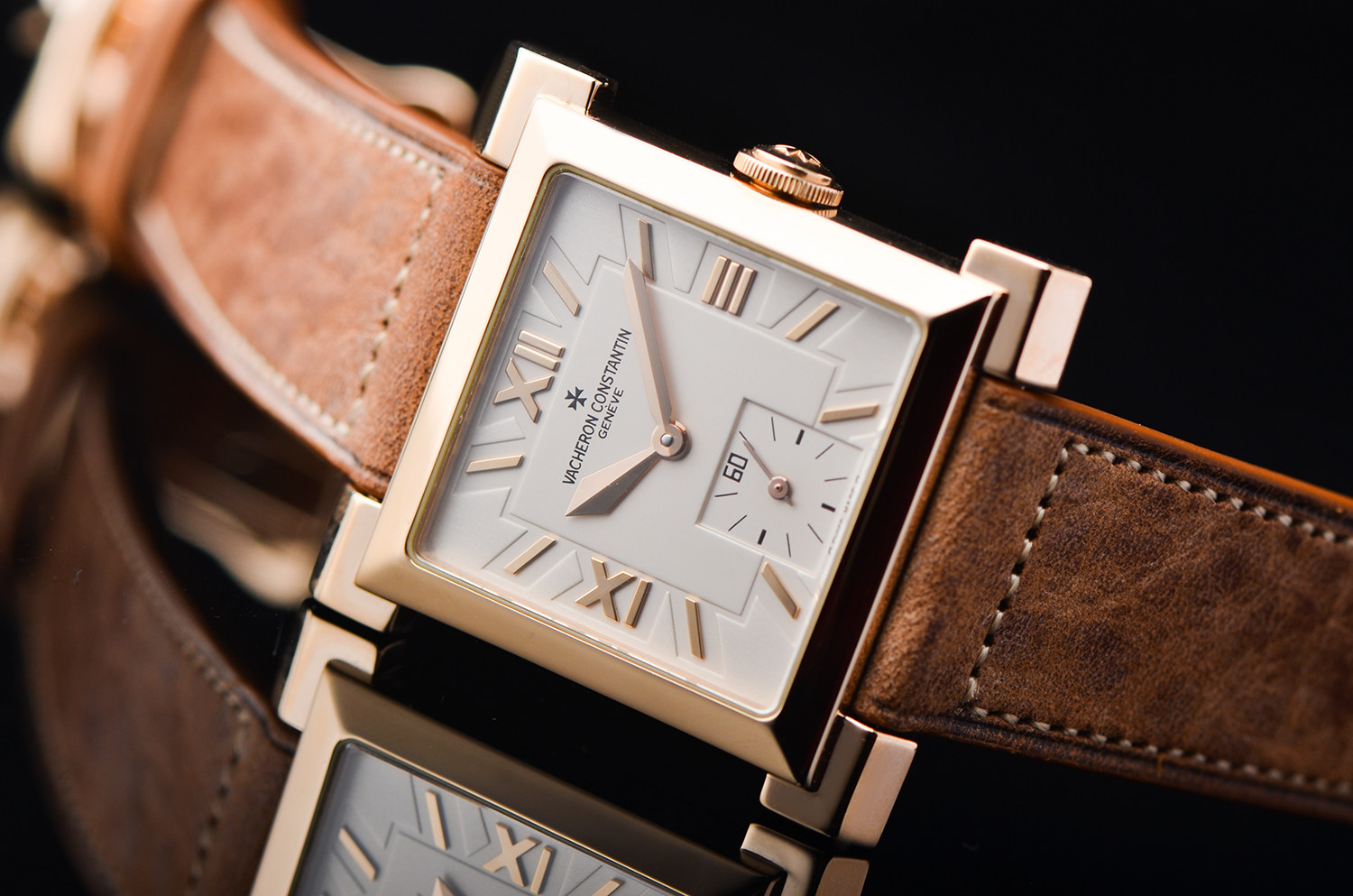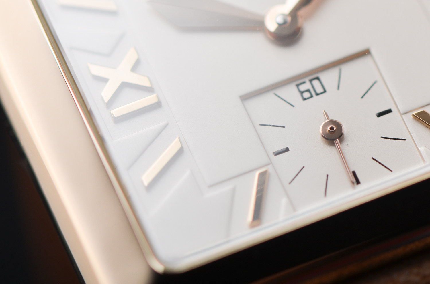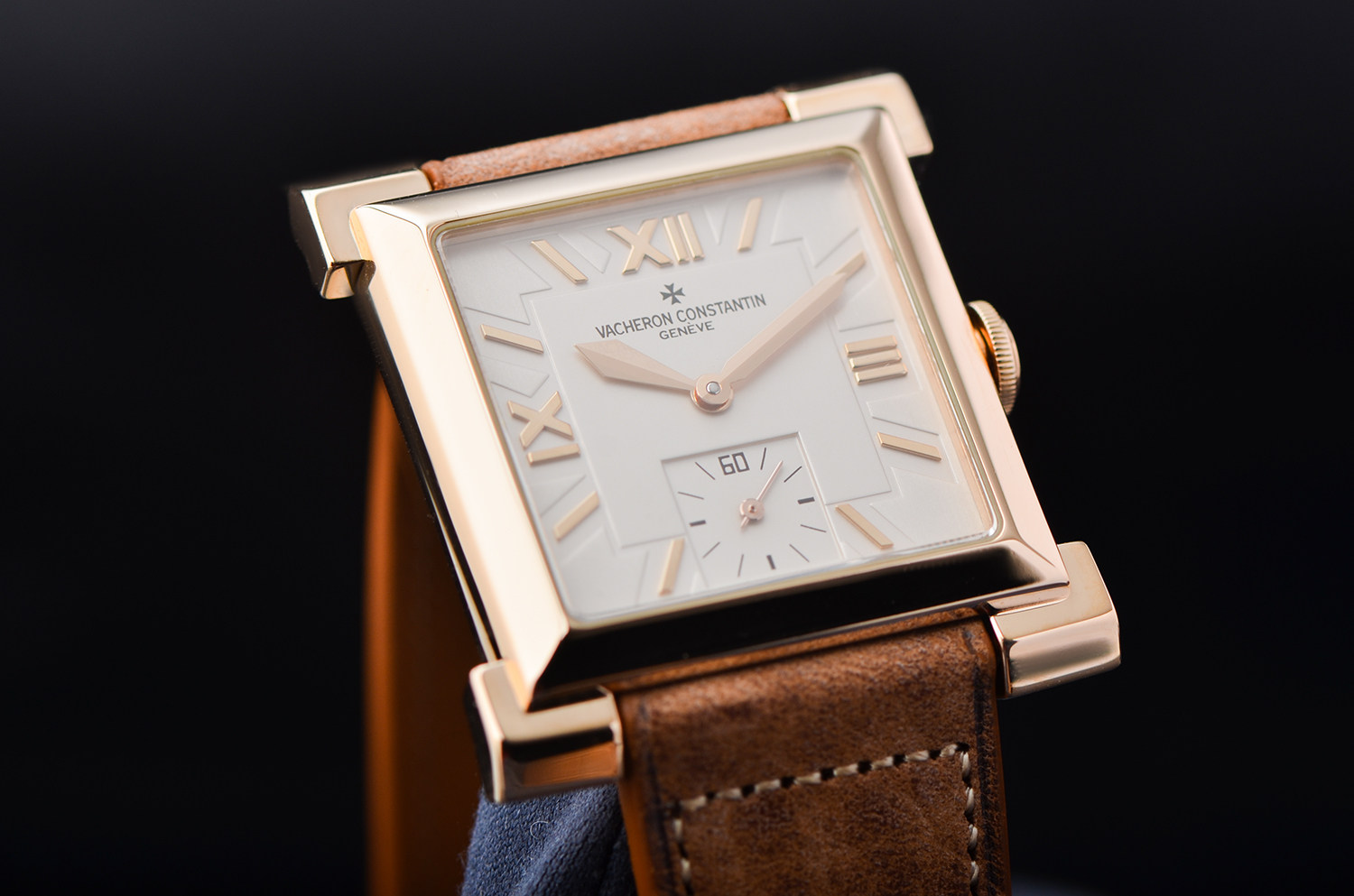 腕表采用 18K玫瑰金方形表壳,线条利落、比例优雅,散发浓厚的Art Deco复古气息。银白色表盘搭配罗马数字时标与小秒盘设计,简洁大方,处处展现出日内瓦高级制表的优雅气质。