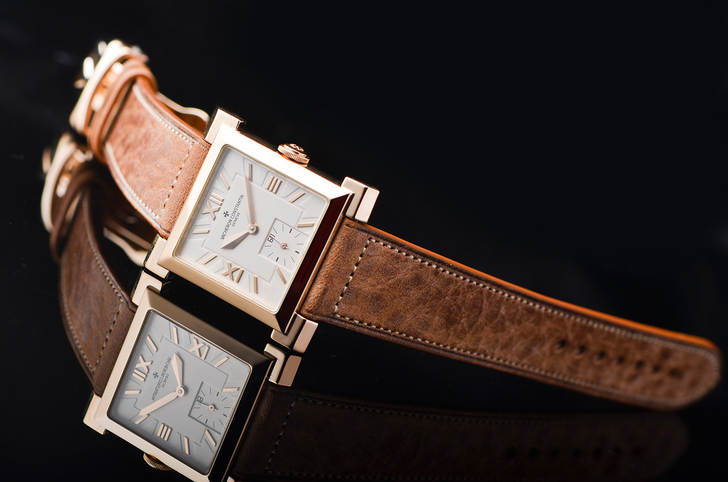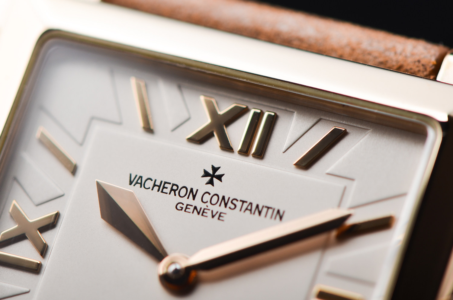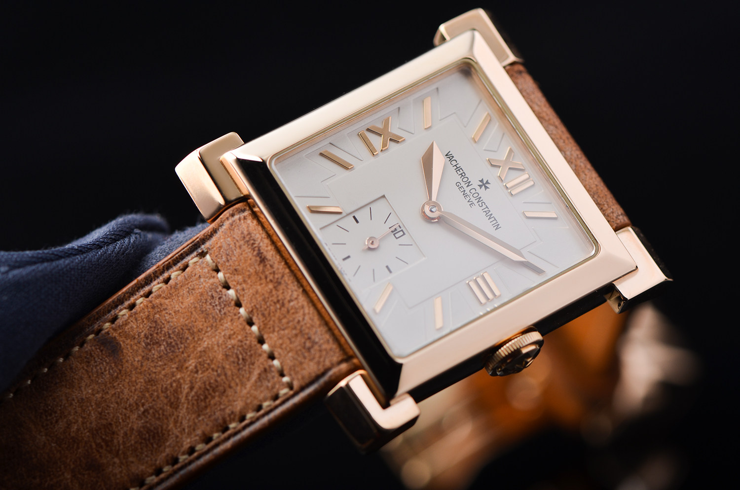 腕表采用 18K玫瑰金方形表壳,线条利落、比例优雅,散发浓厚的Art Deco复古气息。银白色表盘搭配罗马数字时标与小秒盘设计,简洁大方,处处展现出日内瓦高级制表的优雅气质。