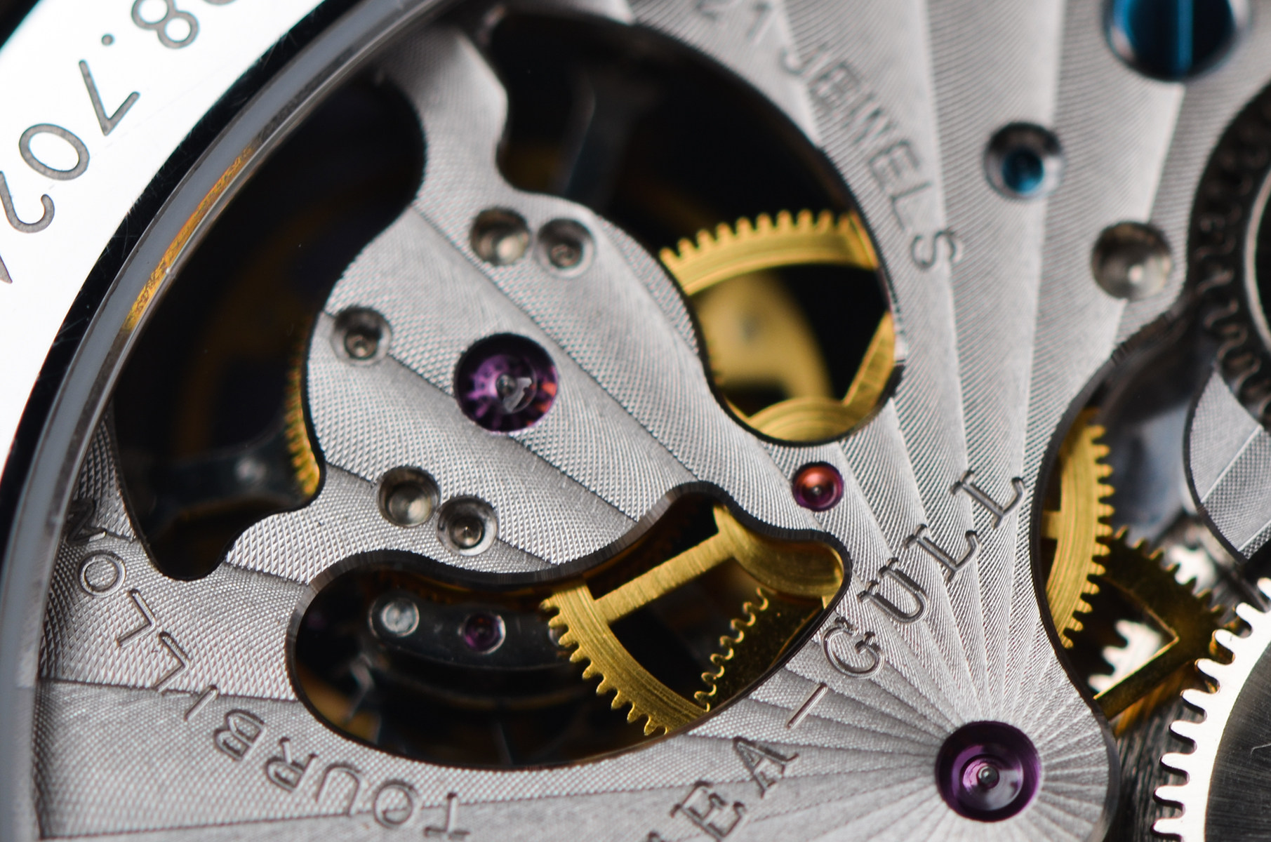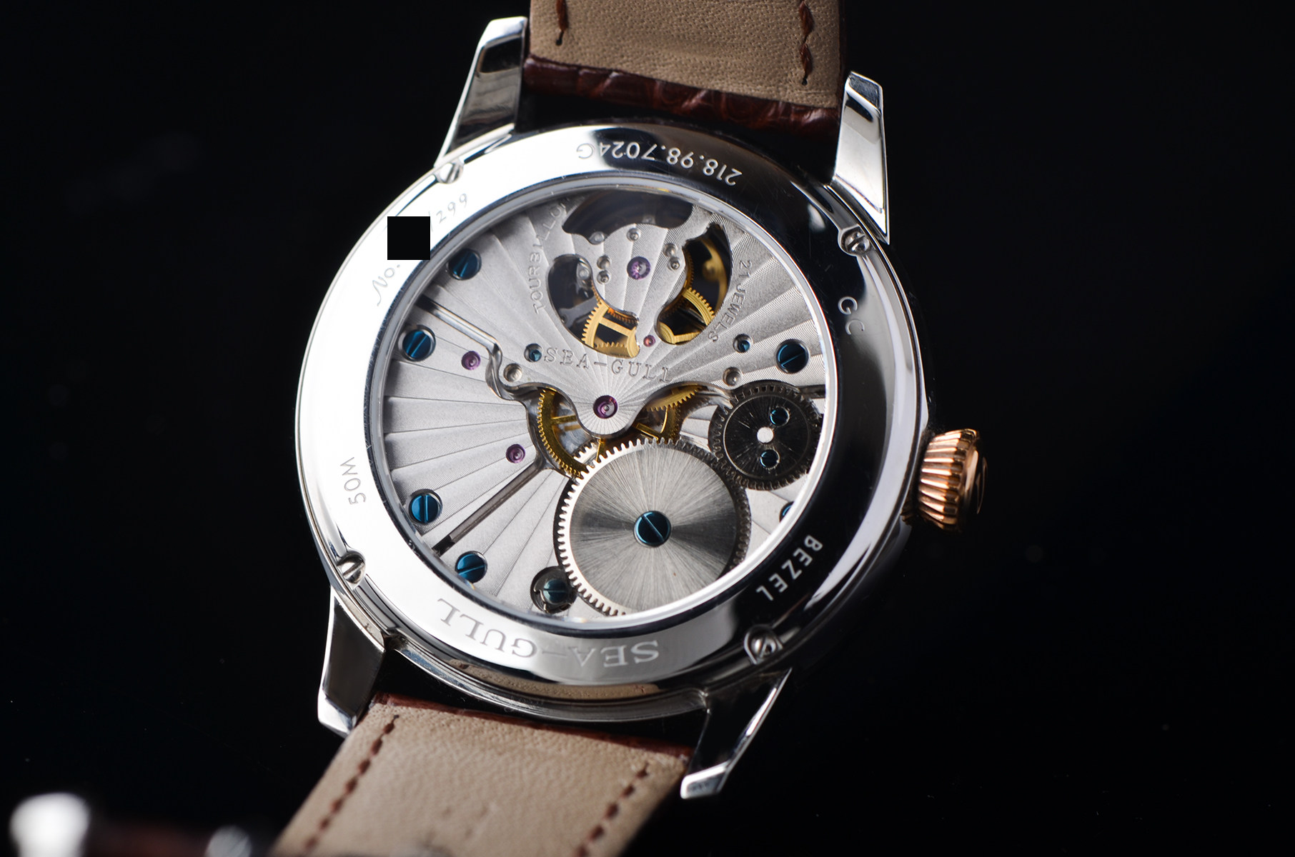 这枚海鸥腕表,型号 218.98.7024G,将两种极具分量的工艺融合在同一枚表盘之上:掐丝珐琅艺术与陀飞轮机械结构。