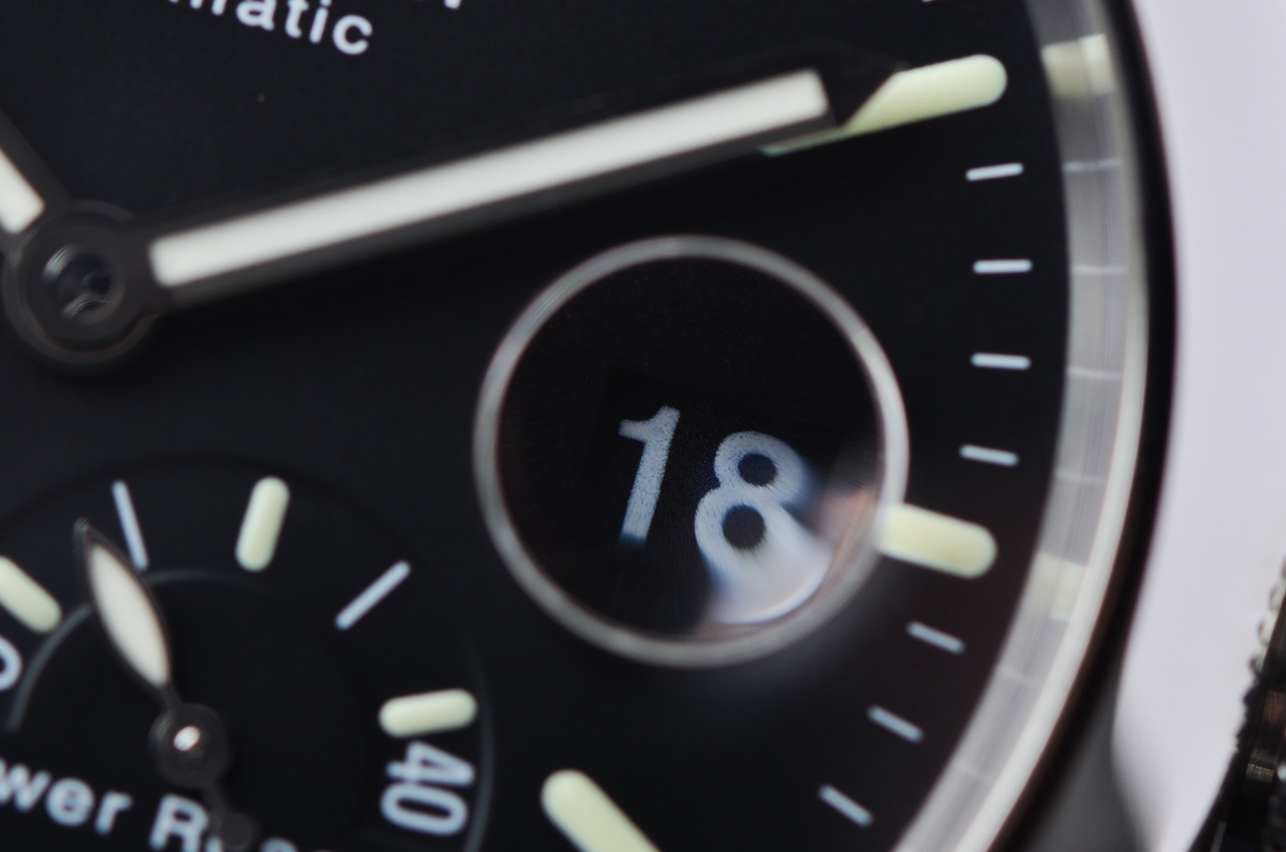 表盘:立体黑色膏药面表盘,夜光刻度及指针,动能储备显示,放大镜日历